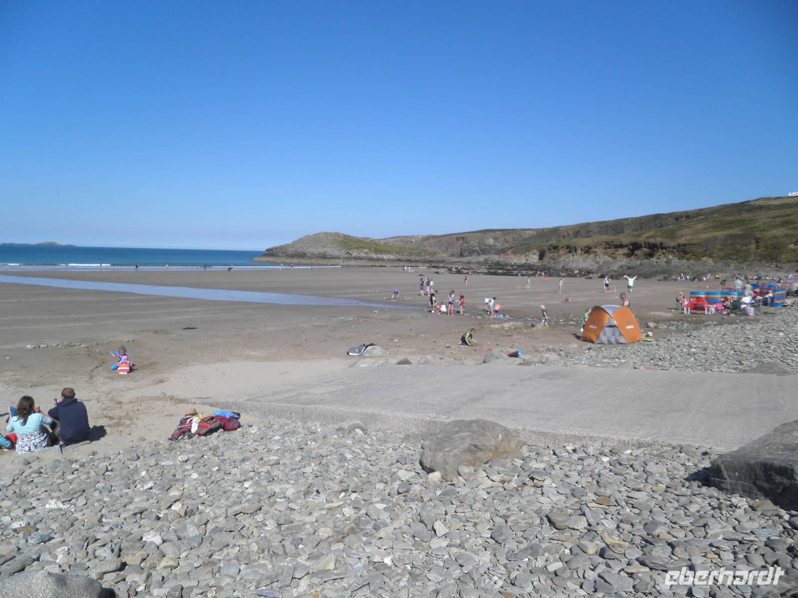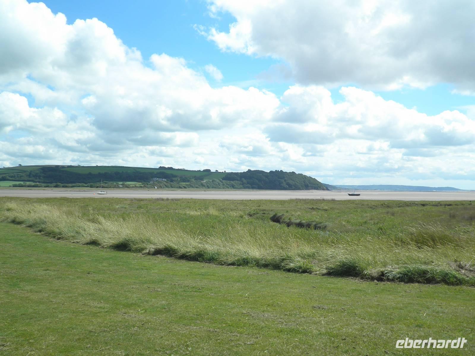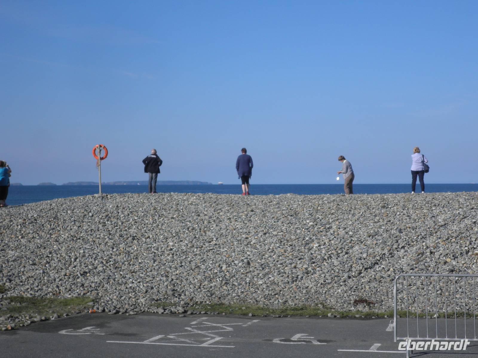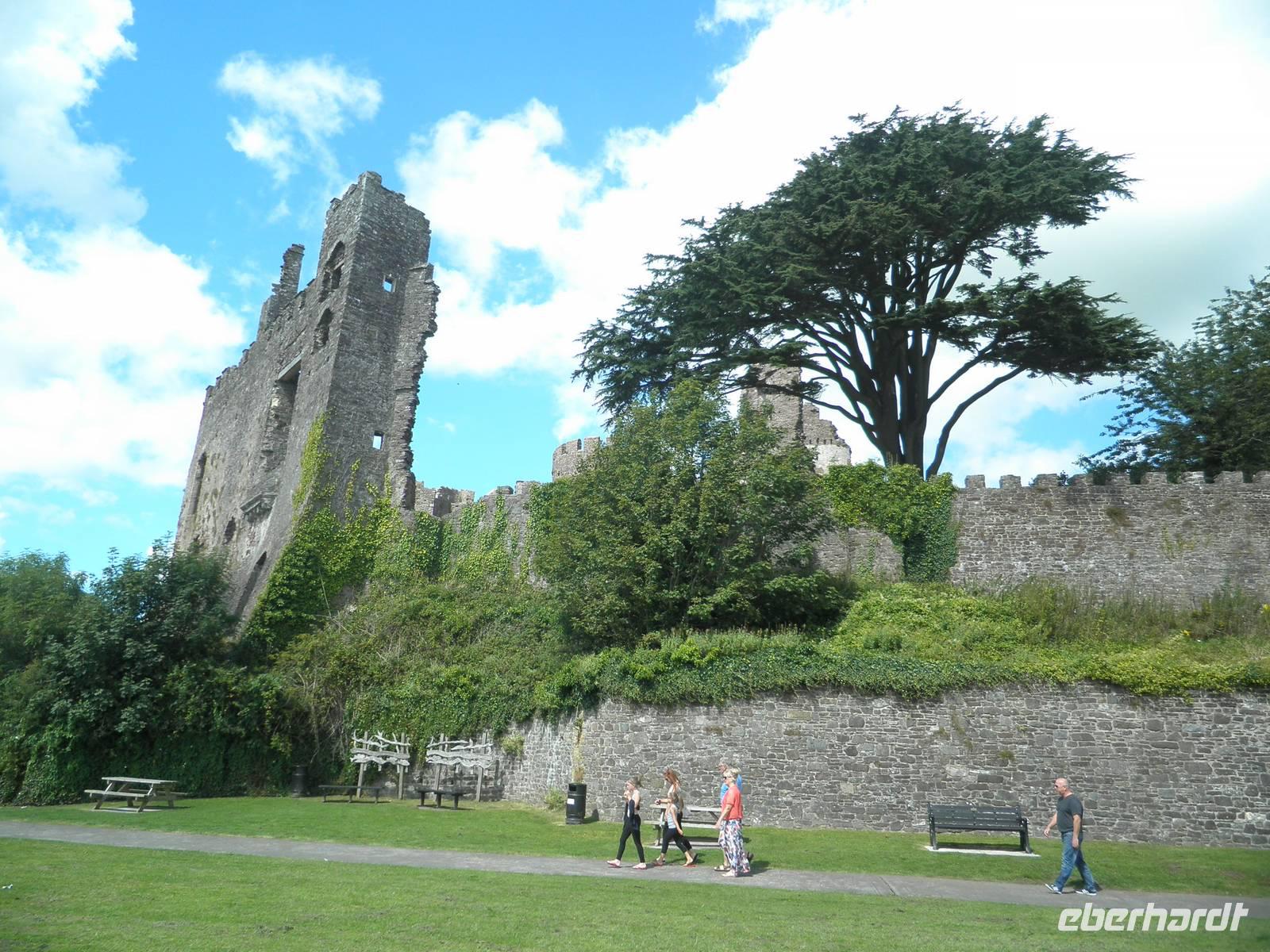 Dieser Morgen empfing uns mit Sonnenschein und so starteten wir in Cardiff. Nach einiger Zeit erreichten wir Swansea, die Stadt an der Südküste von Wales, die gleichzeitig die zweitgrößte walisische Stadt ist. Unser Bus parkte in der Nähe der Marina, und so spazierten wir vorbei an hübschen Segelbooten zur Strandpromenade. Wir suchten Muscheln und genossen den morgendlichen Strand. Hier in diesem Ort war im Jahre 1914 der berühmte walisische Schriftsteller Dylan Thomas geboren worden. In einem Bootshaus über dem Strand von Laugharne verbrachte er die letzten Jahre seines Lebens, das ist ein Dorf nicht weit von Swansea, das auch eine imposante Burgruine zu bieten hat. Hier verbrachten wir unsere Mittagspause. Wir genossen die Wärme der Sommersonne und spazierten am Ufer des Flusses Taff entlang, einige erklommen die Anhöhe bis zum Bootshaus von Dylan Thomas, wo vermutlich große Teile seines Buches "Unter dem Milchald" entstanden sind. Am Nachmittag statteten wir der kleinen Stadt Pembroke einen Besuch ab. Zunächst besichtigten wir das mächtige Castle, hoch über der Hauptstraße des Ortes. Wir bestiegen Rundtürme und sahen eine Höhle, die schon den Normannen im 12. Jahrhundert als Lager und Bootshaus gedient haben soll. Von den Mauern der Burg herab hatten wir einen schönen Blick über die Stadt und die Umgebung. Auf dieser Burg wurde im 15. Jahrhundert der Begründer der Tudor-Dynastie geboren: Heinrich VII.