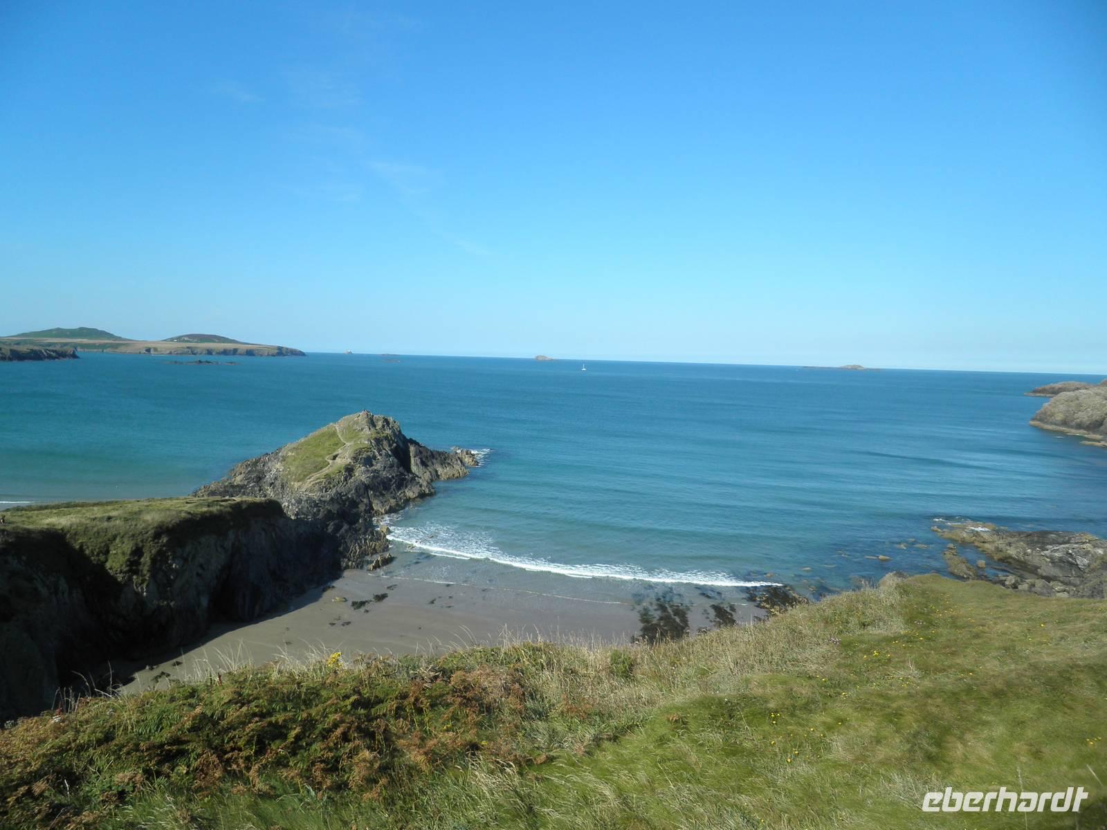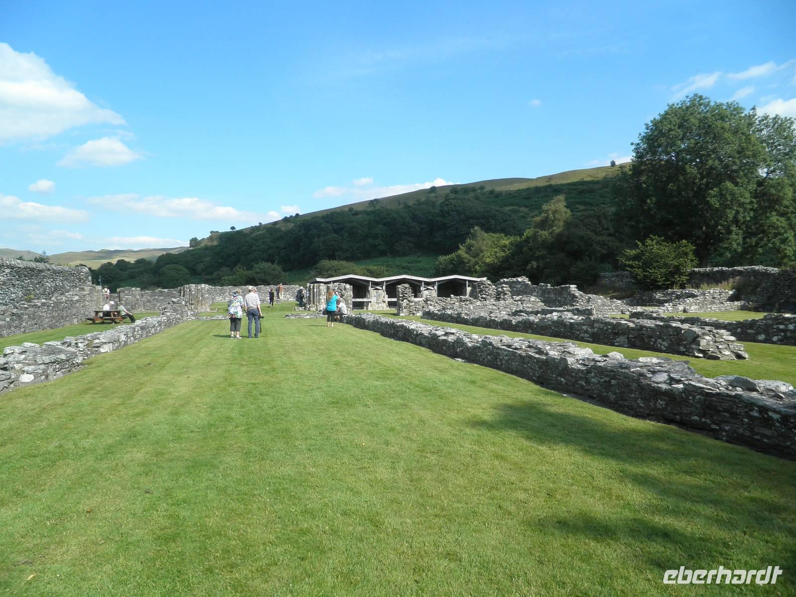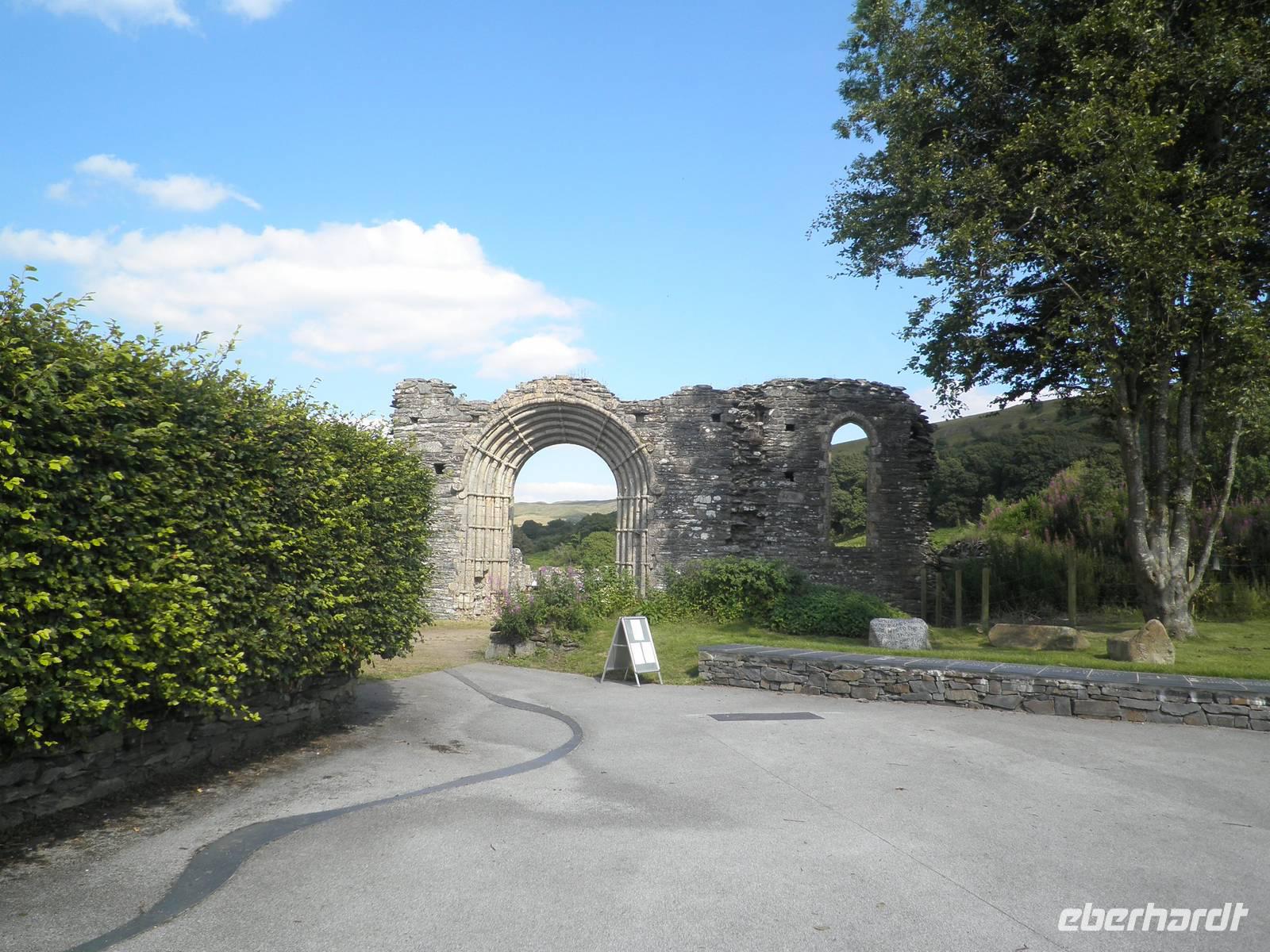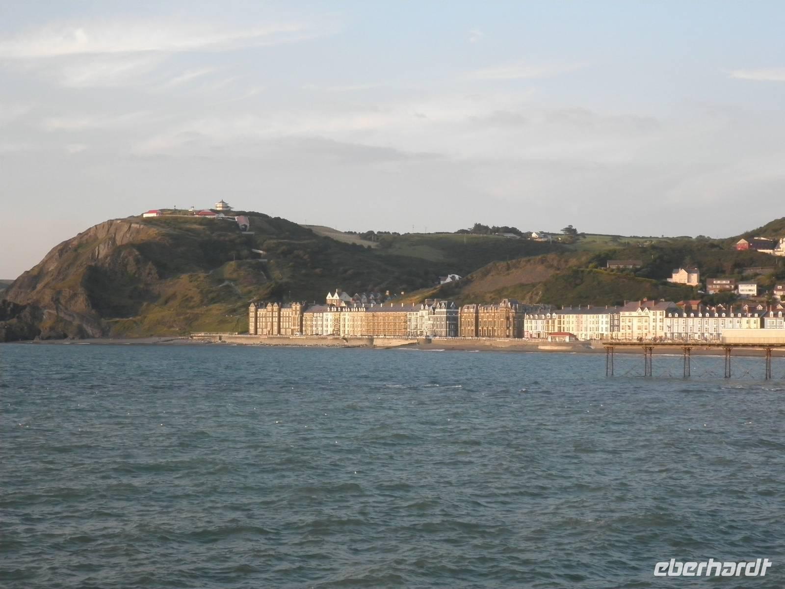 Bei herrlichstem Sonnenschein fuhren wir nach St Davids, den westlichsten Punkt unserer gesamten Reise. Unterwegs schon machten wir Halt in Newgale für ein paar schöne Fotos vom Meer und den Buchten an der Küste. Bei St Davids erstreckt sich ein herrlicher Sandstrand namens Whitesands in einer malerischen Bucht. Hier entlang verläuft auch der Pembrokeshire Coast Path, ein viele Kilometer langer Wanderweg, der sich entlang der walisischen Küste um Buchten und Hügel direkt über dem tatsächlich blauen Wasser schlängelt. Einen kleinen Spaziergang unternahmen auch wir auf diesem Wanderpfad, auch der Sandstrand in der Bucht lud bei diesem herrlichen Sommerwetter zum Verweilen ein. Danach fuhren wir nach St Davids hinein, berühmt wurde die kleinste Stadt in Großbritannien sicher durch seine gewaltige Kathedrale, die dem heiligen David gewidmet ist. Er hat im 6. Jahrhundert schon an der Westküste missioniert und an dieser Stelle seine erste Kirche auf walisischem Gebiet gegründet. Er ist auch der Schutzheilige von Wales, sein Namenstag ist der 1. März, was gleichzeitig der Nationalfeiertag von Wales ist. Direkt neben der Kathedrale in St Davids stehen die imposanten Ruinen des früheren Bischofspalastes, die noch heute die damaligen Ausmasse des Gebäudes erahnen lassen. Am Nachmittag erreichten wir nach einigen Meilen Busfahrt die Strata Florida Abbey, die walisische "Westminster"- Abtei, eine Ruine heute. Zu früheren Zeiten war sie bedeutsam, wichtige Leute des walisischen Könisgshauses und ein walisischer Poet sind hier vor einigen Jahrhunderten bestattet worden. Der walisische Prinz Llewelyn the Great hielt hier einst ein Konzil ab. Am frühen Abend erreichten wir unser Hotel in Aberystwyth. Nach dem Abendessen fuhr uns ein hoteleigenes Shuttle noch hinunter in die Stadt zur Promenade, die wir entlangspazierten und am Ende konnten wir mit einem Fuß ans Geländer der Nordseite der Promenate kicken. Das macht man hier schon sehr lange so, es heißt "kick the bar", viele Einheimische konnten wir dabei auch beobachten.
