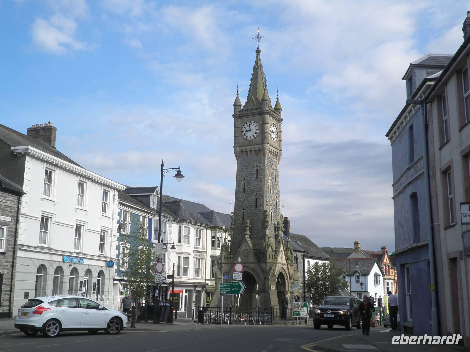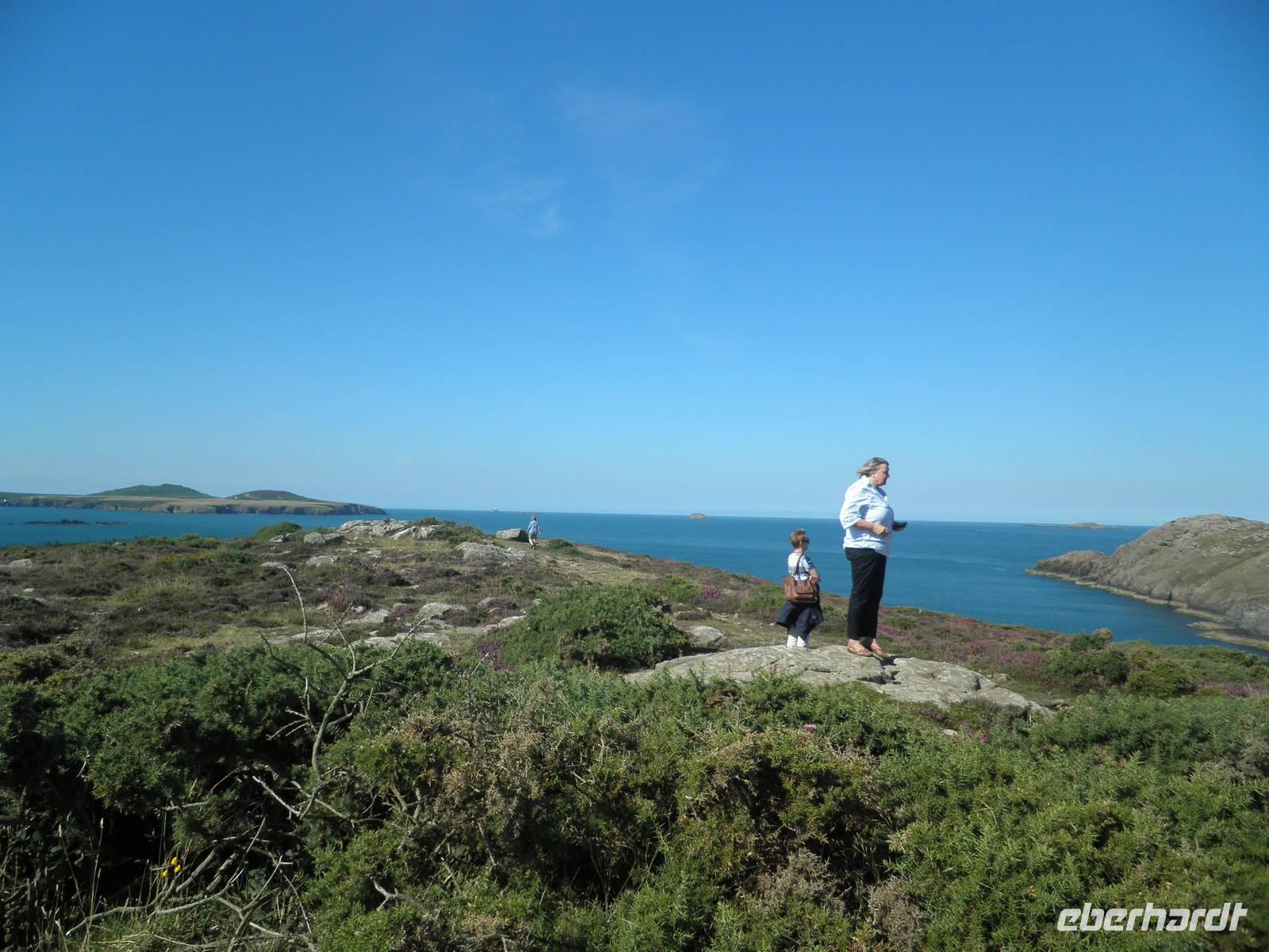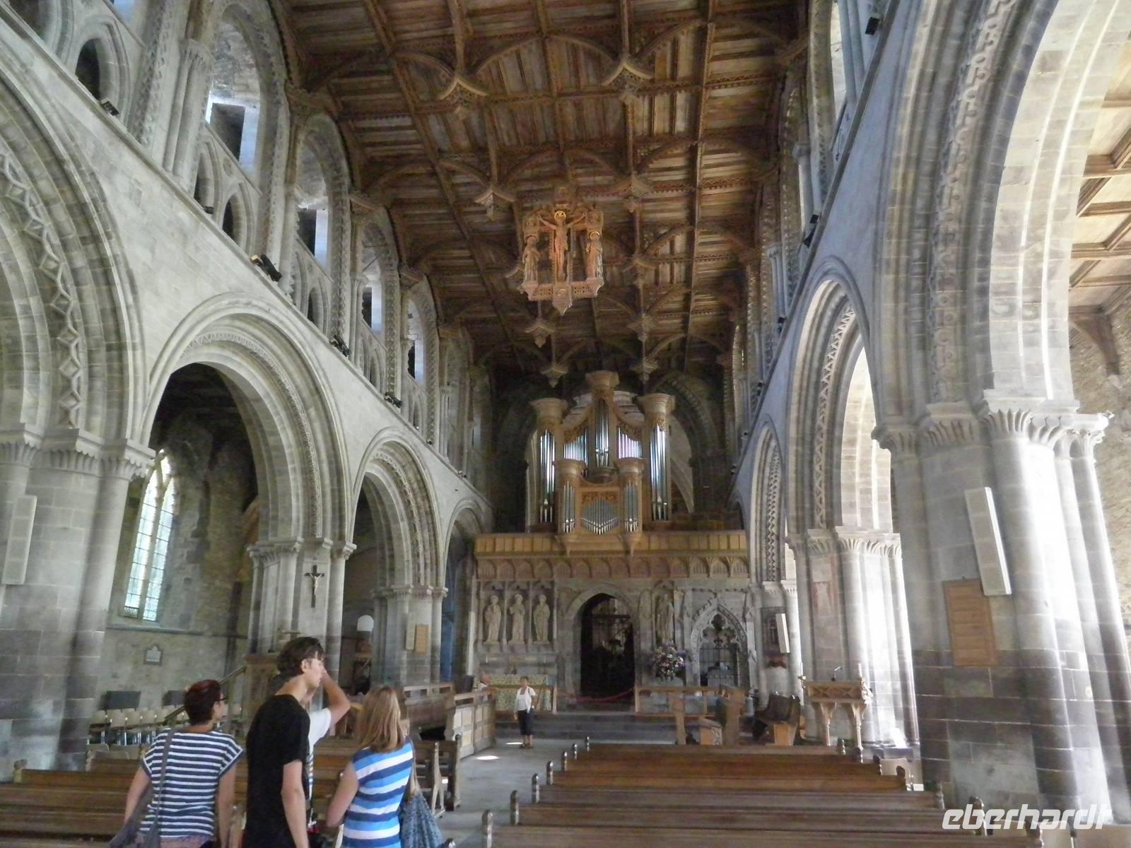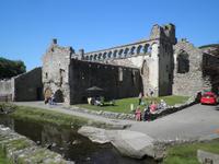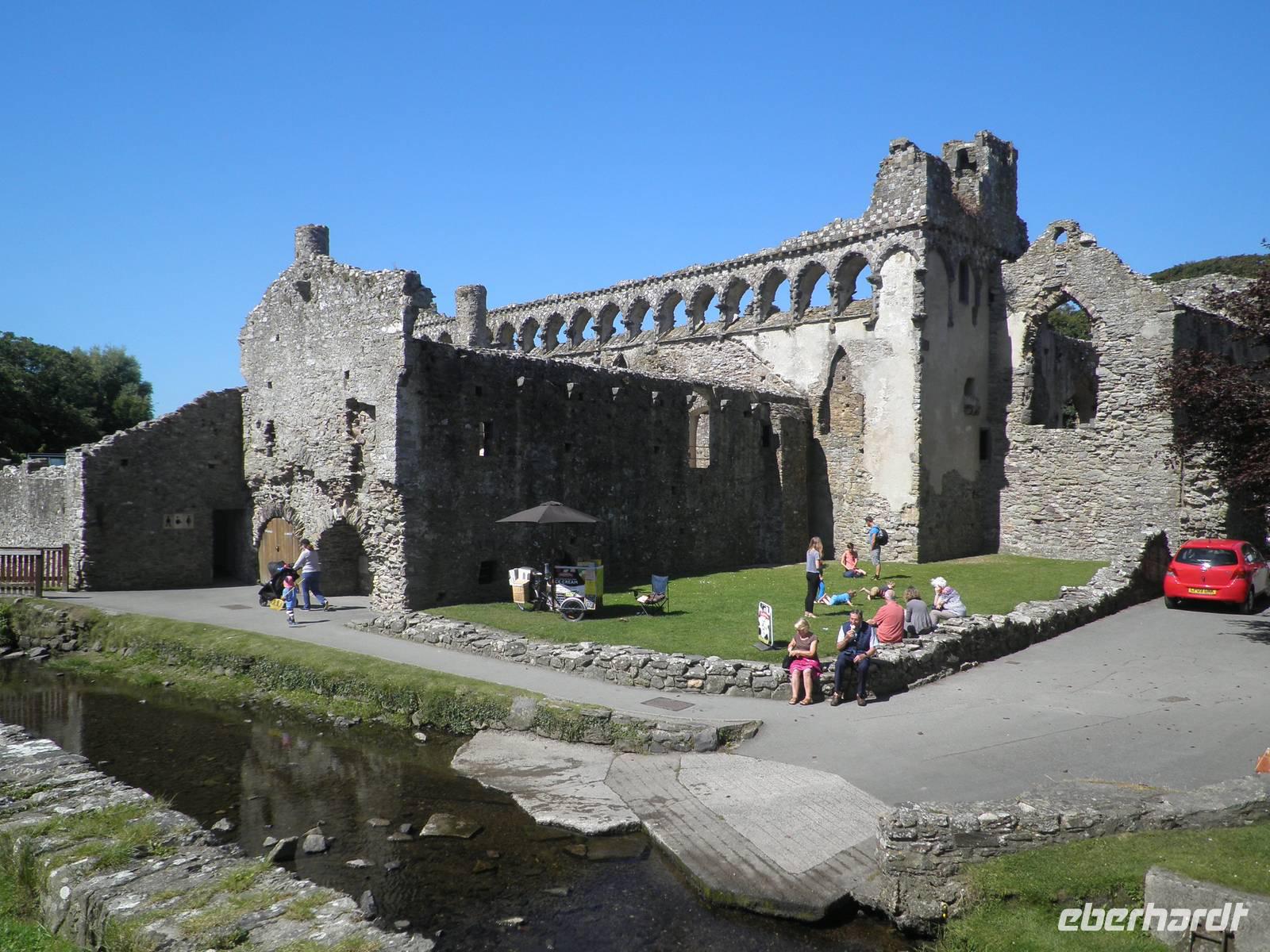 Bei herrlichstem Sonnenschein fuhren wir nach St Davids, den westlichsten Punkt unserer gesamten Reise. Unterwegs schon machten wir Halt in Newgale für ein paar schöne Fotos vom Meer und den Buchten an der Küste. Bei St Davids erstreckt sich ein herrlicher Sandstrand namens Whitesands in einer malerischen Bucht. Hier entlang verläuft auch der Pembrokeshire Coast Path, ein viele Kilometer langer Wanderweg, der sich entlang der walisischen Küste um Buchten und Hügel direkt über dem tatsächlich blauen Wasser schlängelt. Einen kleinen Spaziergang unternahmen auch wir auf diesem Wanderpfad, auch der Sandstrand in der Bucht lud bei diesem herrlichen Sommerwetter zum Verweilen ein. Danach fuhren wir nach St Davids hinein, berühmt wurde die kleinste Stadt in Großbritannien sicher durch seine gewaltige Kathedrale, die dem heiligen David gewidmet ist. Er hat im 6. Jahrhundert schon an der Westküste missioniert und an dieser Stelle seine erste Kirche auf walisischem Gebiet gegründet. Er ist auch der Schutzheilige von Wales, sein Namenstag ist der 1. März, was gleichzeitig der Nationalfeiertag von Wales ist. Direkt neben der Kathedrale in St Davids stehen die imposanten Ruinen des früheren Bischofspalastes, die noch heute die damaligen Ausmasse des Gebäudes erahnen lassen. Am Nachmittag erreichten wir nach einigen Meilen Busfahrt die Strata Florida Abbey, die walisische "Westminster"- Abtei, eine Ruine heute. Zu früheren Zeiten war sie bedeutsam, wichtige Leute des walisischen Könisgshauses und ein walisischer Poet sind hier vor einigen Jahrhunderten bestattet worden. Der walisische Prinz Llewelyn the Great hielt hier einst ein Konzil ab. Am frühen Abend erreichten wir unser Hotel in Aberystwyth. Nach dem Abendessen fuhr uns ein hoteleigenes Shuttle noch hinunter in die Stadt zur Promenade, die wir entlangspazierten und am Ende konnten wir mit einem Fuß ans Geländer der Nordseite der Promenate kicken. Das macht man hier schon sehr lange so, es heißt "kick the bar", viele Einheimische konnten wir dabei auch beobachten.