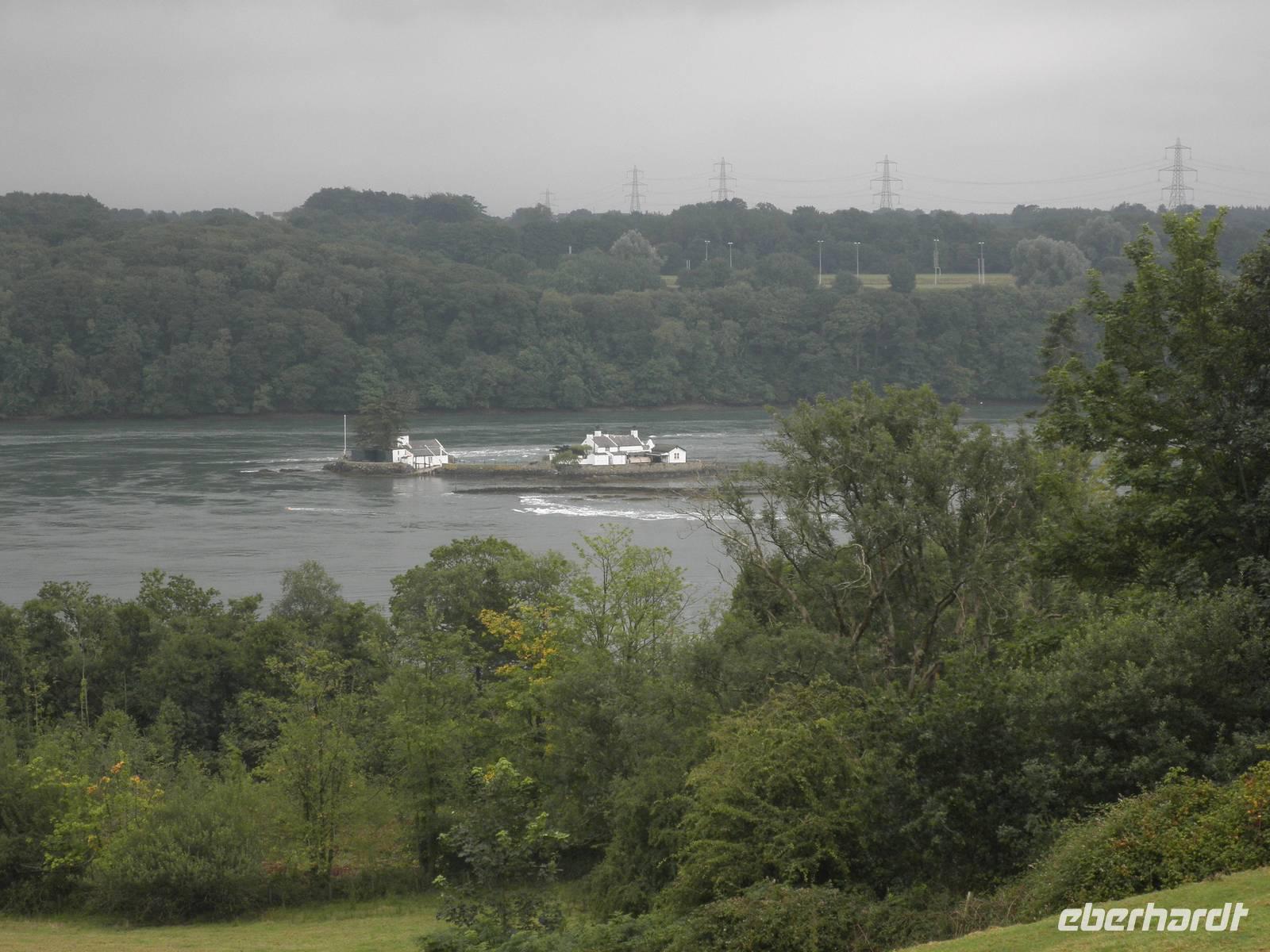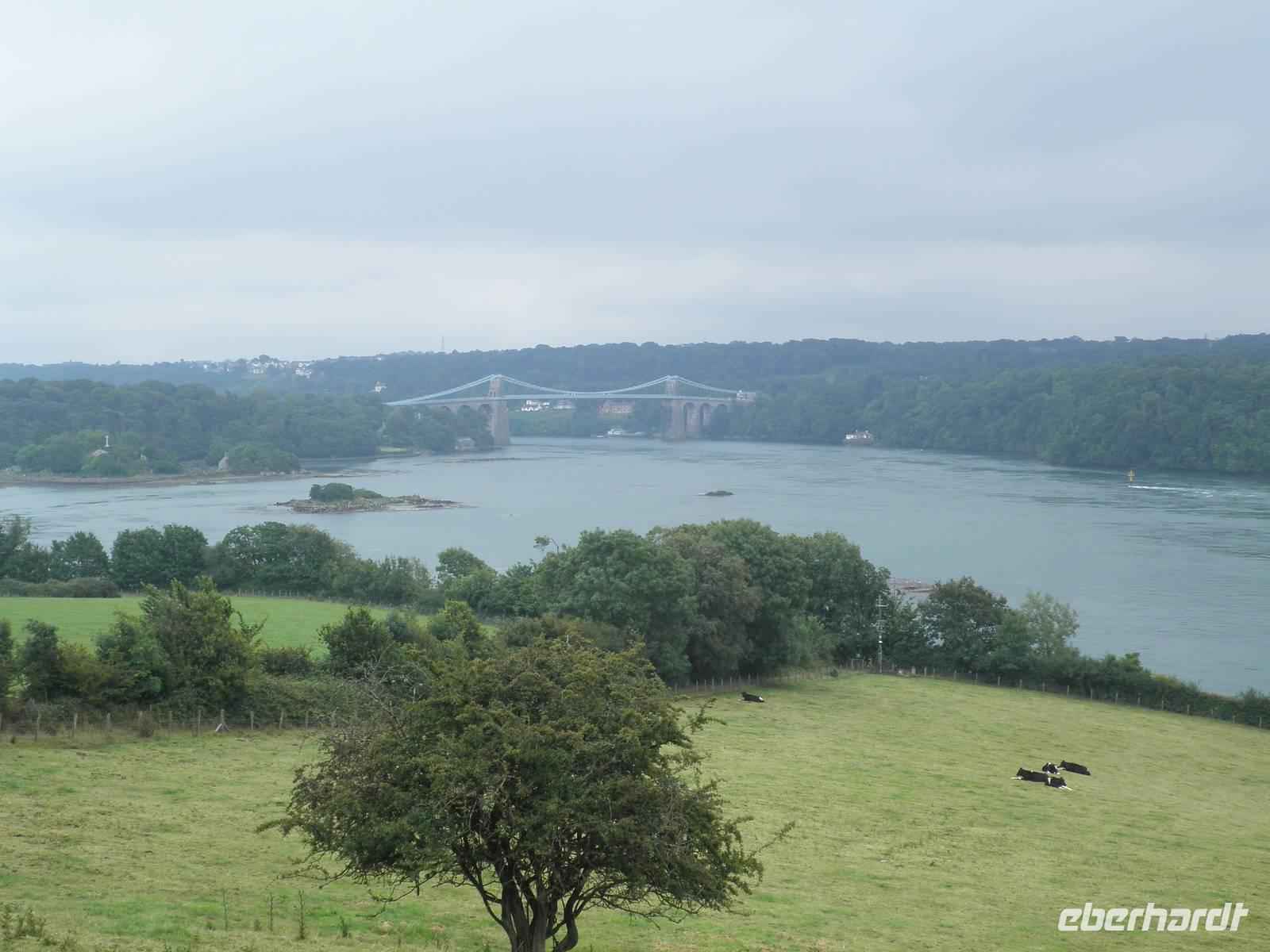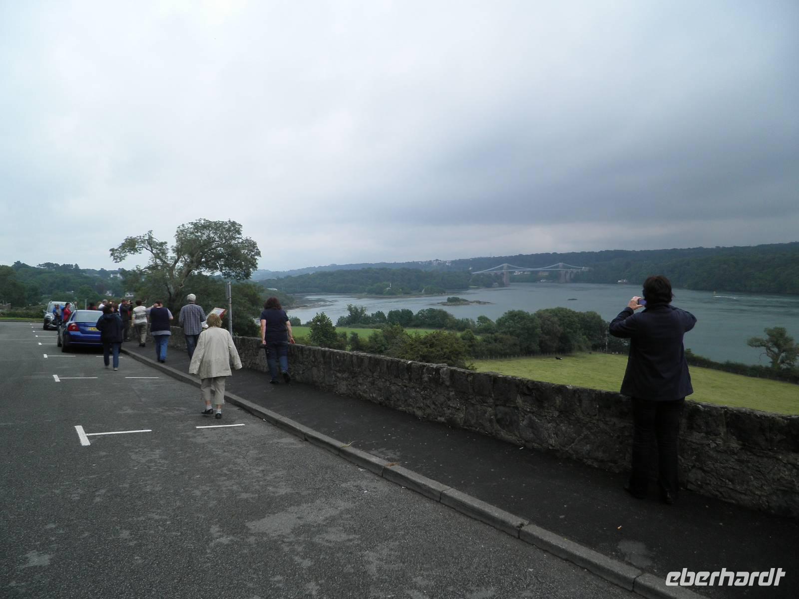 Am Morgen verließen wir zunächst Caernarfon und fuhren entlang der Küste bis Conwy, bogen in den Nationalpark ab und erreichten bald Bodnant Garden, einen der schönsten und abwechslungsreichsten Gärten in Wales. Wir spazierten durch die gepflegte Anlage, sahen symmetrisch angelegte Gartenteiche, üppige Blumenpracht und blühende Büsche. Nach einem erholsamen Vormittag im Garten fuhren wir zunächst auf die Insel Anglesey, den nordwestlichsten Punkt von Wales. Wir sahen die beeindruckende Hängebrücke über die Menai Street, die der berühmte Baumeister Thomas Telford im Jahre 1826 fertigstelle. An einem Aussichtspunkt konnten wir seine Brücke und die in der Nähe befindliche Britannia Bridge bewundern, über die zweite waren wir ein paar Minuten zuvor gefahren, um auf die Insel zu gelangen. Am Bahnhof in Llanfair PG, das ist die offizielle Abkürzung des Ortsnamens bestehend aus 58 Buchstaben, staunten wir nicht schlecht über die langen Schilder mit dem Ortsnamen darauf: Llanfairpwllgwyngyllgogerychwyrndrobwllllantysiliogogogoch