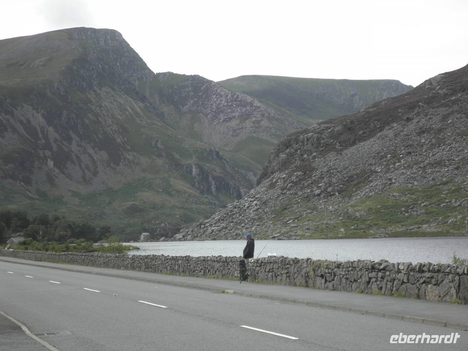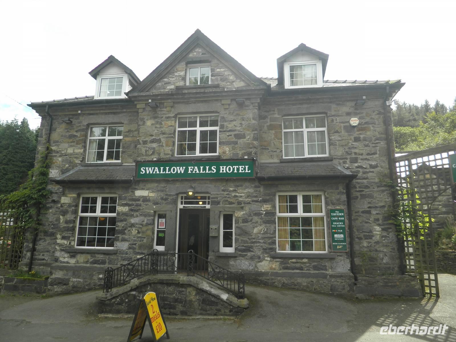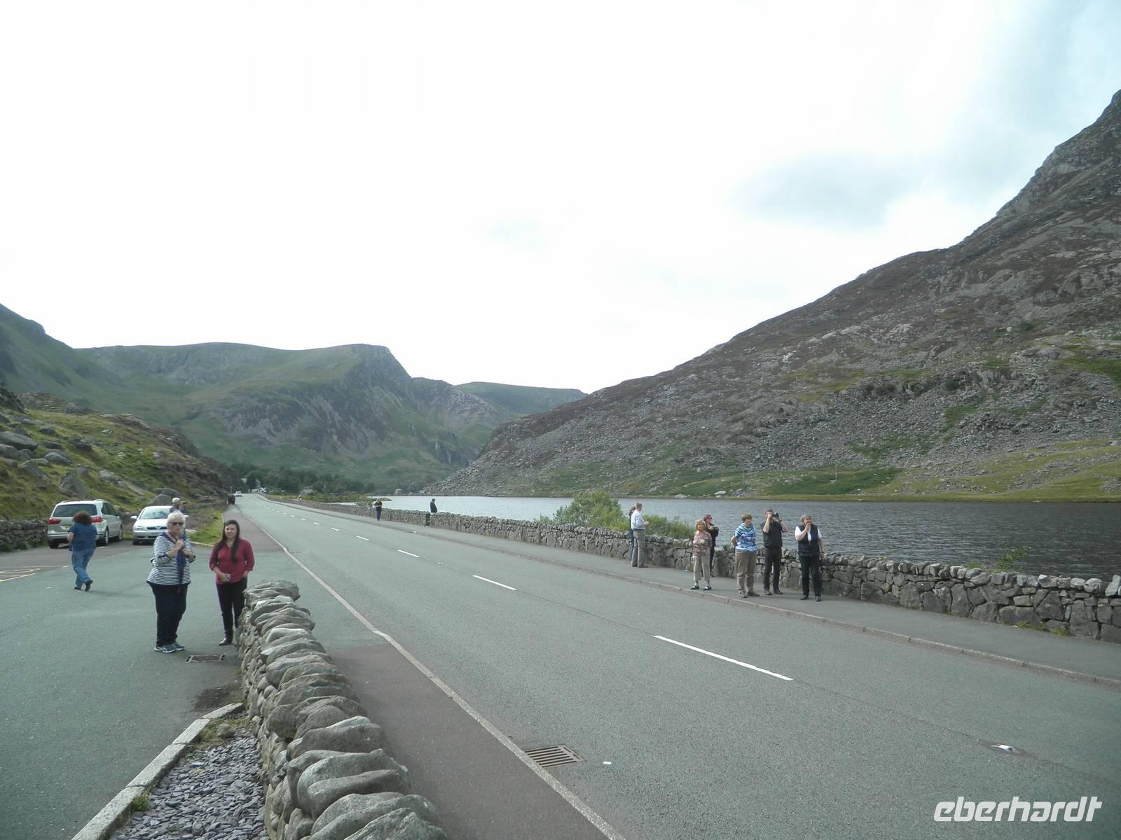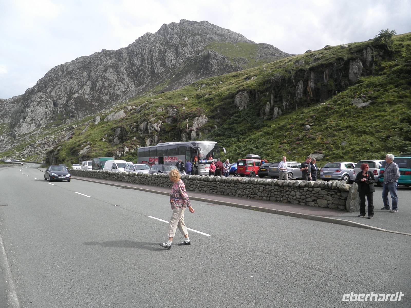 überragt. Wir stiegen in den sogenannten "early bird train", der erste an diesem Morgen, und fuhren hinauf auf den Gipfel, vorbei an unzähligen Schafen und unermüdlichen Wanderern, die den Aufstieg auf den Snowdon aus eigener Kraft schaffen wollten. Wir hingegen saßen, zwar eng beieinander, aber dennoch bequem in modernen Wagen, die von einer dieselbetriebenen Lock den Hang hinauf geschoben wurden. Oben angelangt wartete allerdings eine dicke Nebelwand auf uns. Dennoch bezwangen wir auch ohne Fernsicht die letzten Höhenmeter bis zum Gipfel zu Fuß. Ein kalter Wind erinnerte uns daran, dass wir in einer Höhe von über 1000 Metern waren. Nach etwas mehr als einer halben Stunde fuhr unser Zug zurück ins Tal. Je weiter wir nach unten kamen, um so angenehmer wurden die Temperaturen. Bei mittäglichem Sonnenschein erkundeten wir den Ort am Fuß des Snowdon: Llanberis. Neben Schiefermuseum, Dampfzug, Schifffahrt und Powerstation gibt es zahlreiche Cafés, Restaurants und Geschäfte. Am frühen Nachmittag begann unsere Panoramafahrt durch die herrliche Bergwelt des Nationalparks. Mehrfach hielten wir an, um die beeindruckende Natur zu fotografieren. Auch dem schönen Ferienort Betws-y-Coed statteten wir einen Besuch ab. Wir beobachteten die dortige Miniatur-Eisenbahn, die Groß und Klein erfreute. An den Swallow falls beeindruckte uns der breite Wasserfall, dessen Wasser über zahlreiche verschieden geformte Felsen schoss und ins Tal rauschte. Noch ein paar Mal machten wir Halt für schöne Fotos und erreichten schließlich am frühen Abend wieder unser Hotel in Caernarfon, wo wir unsere letzte Nacht auf dem britischen Festland verbringen würden.