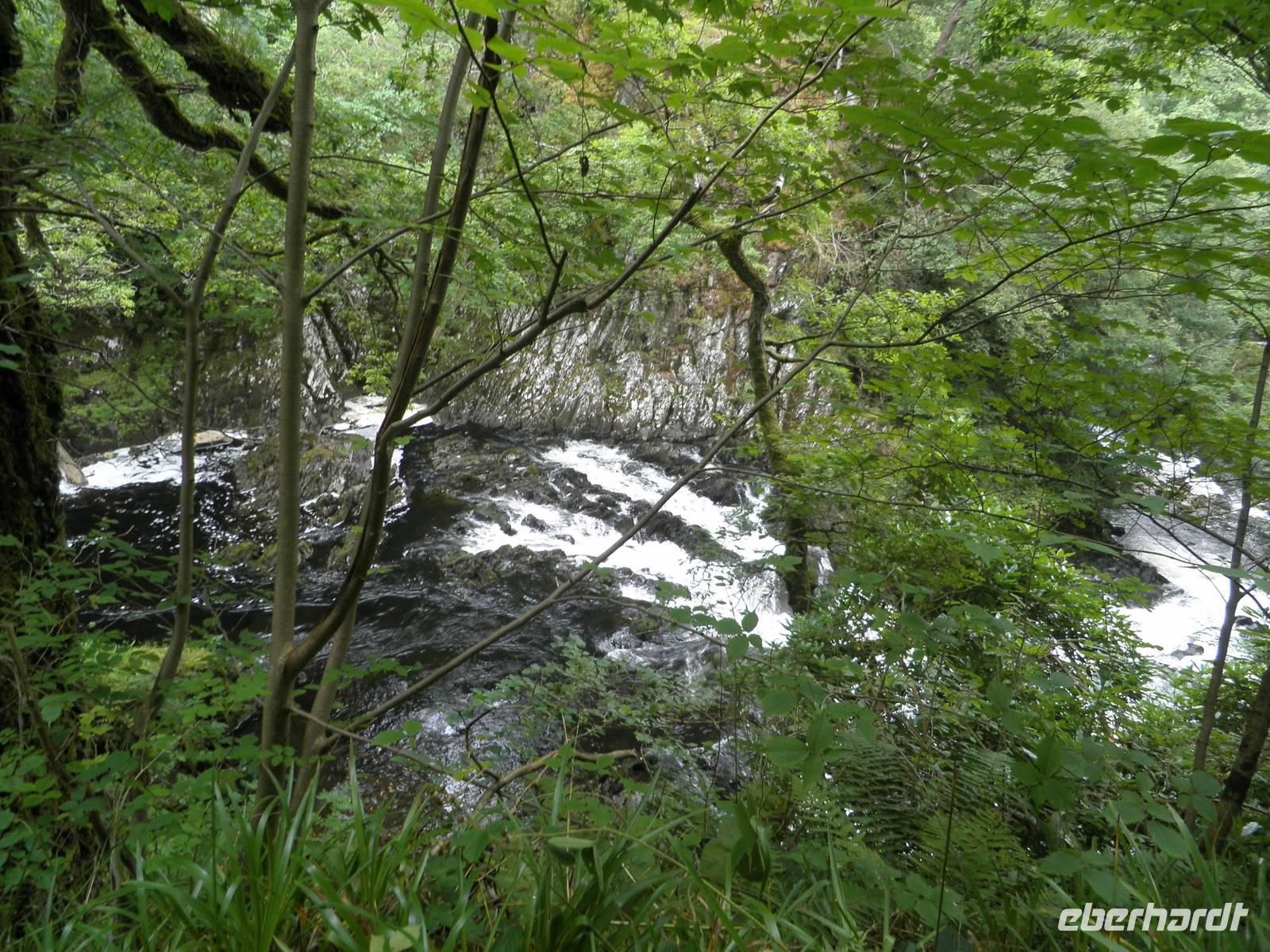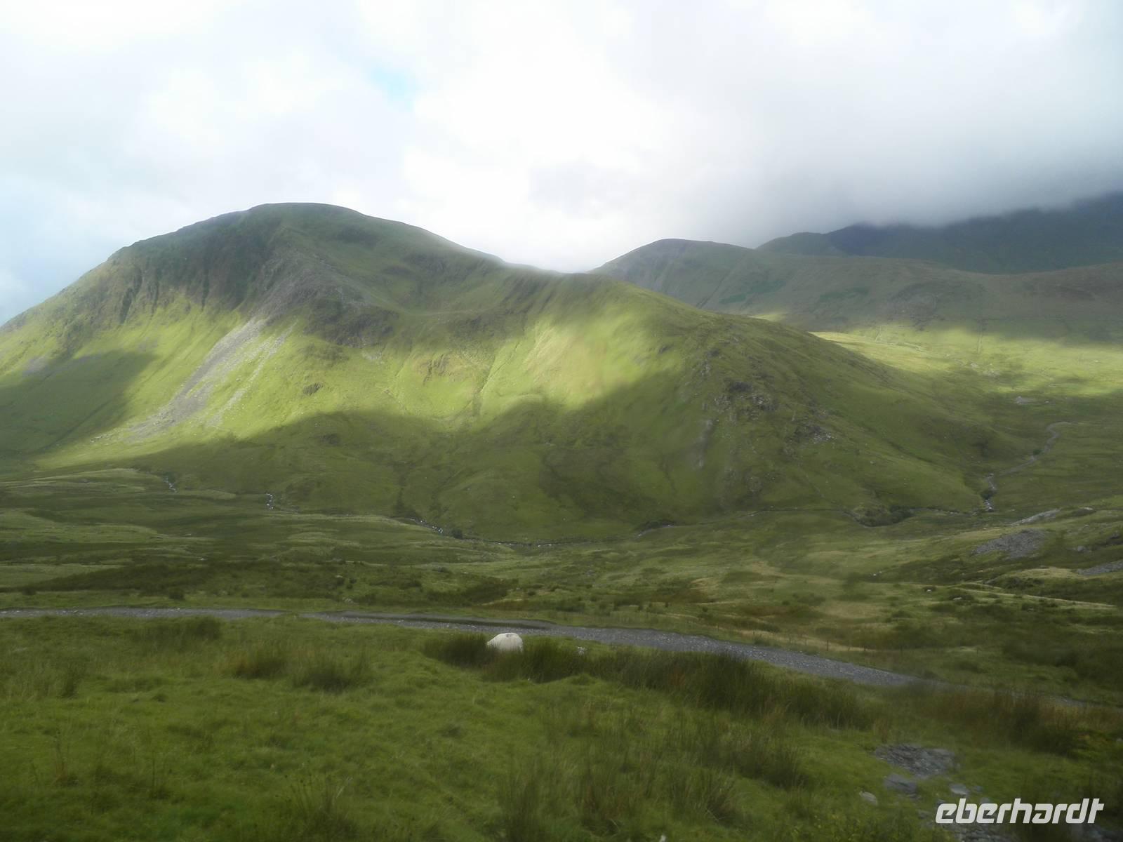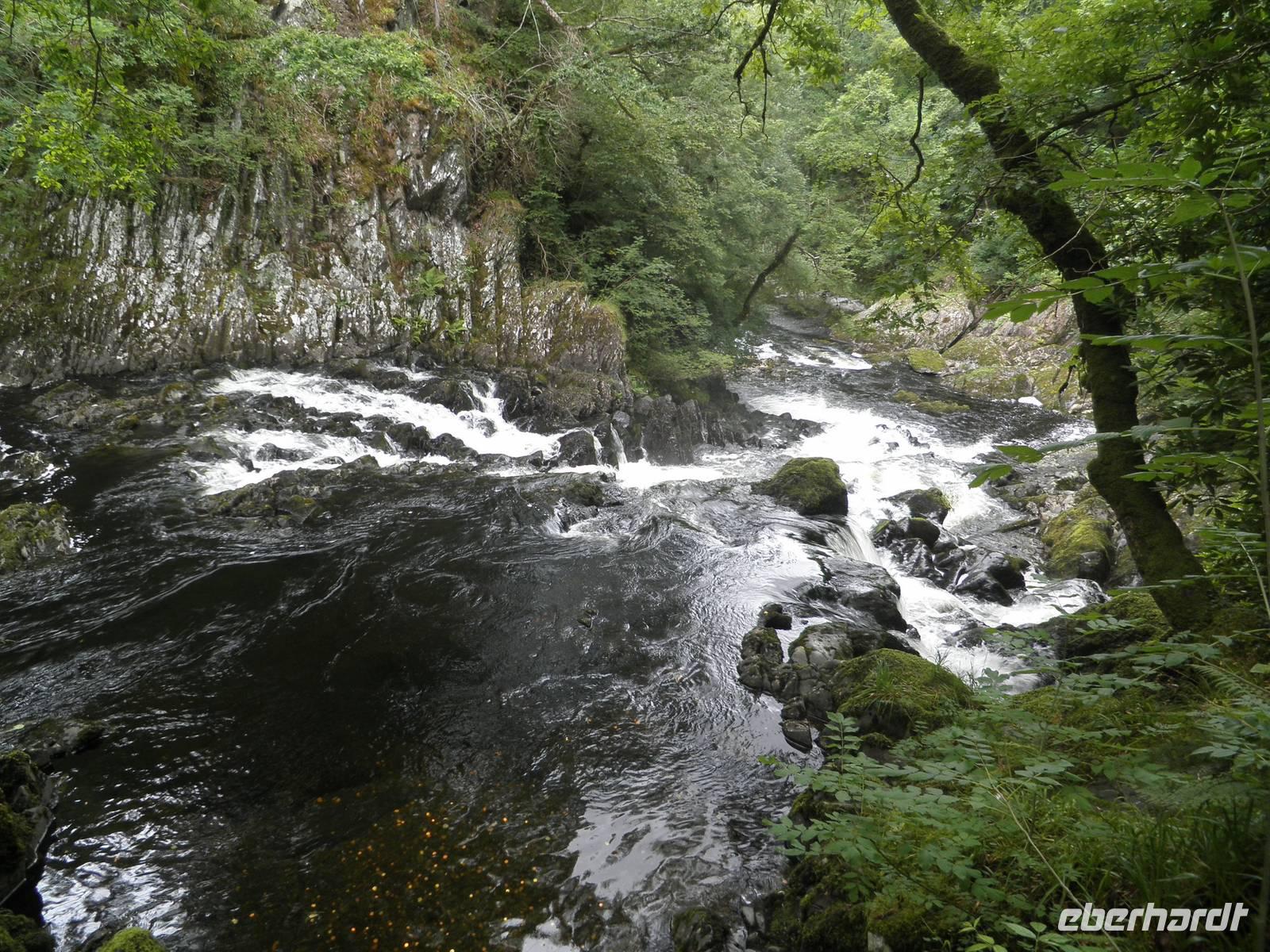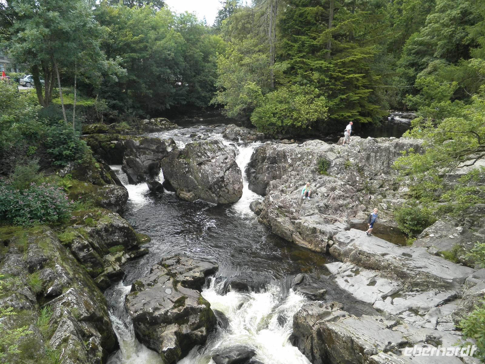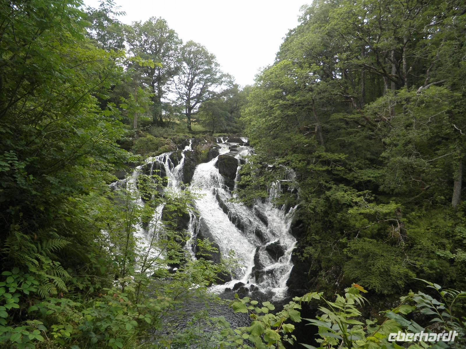 überragt. Wir stiegen in den sogenannten "early bird train", der erste an diesem Morgen, und fuhren hinauf auf den Gipfel, vorbei an unzähligen Schafen und unermüdlichen Wanderern, die den Aufstieg auf den Snowdon aus eigener Kraft schaffen wollten. Wir hingegen saßen, zwar eng beieinander, aber dennoch bequem in modernen Wagen, die von einer dieselbetriebenen Lock den Hang hinauf geschoben wurden. Oben angelangt wartete allerdings eine dicke Nebelwand auf uns. Dennoch bezwangen wir auch ohne Fernsicht die letzten Höhenmeter bis zum Gipfel zu Fuß. Ein kalter Wind erinnerte uns daran, dass wir in einer Höhe von über 1000 Metern waren. Nach etwas mehr als einer halben Stunde fuhr unser Zug zurück ins Tal. Je weiter wir nach unten kamen, um so angenehmer wurden die Temperaturen. Bei mittäglichem Sonnenschein erkundeten wir den Ort am Fuß des Snowdon: Llanberis. Neben Schiefermuseum, Dampfzug, Schifffahrt und Powerstation gibt es zahlreiche Cafés, Restaurants und Geschäfte. Am frühen Nachmittag begann unsere Panoramafahrt durch die herrliche Bergwelt des Nationalparks. Mehrfach hielten wir an, um die beeindruckende Natur zu fotografieren. Auch dem schönen Ferienort Betws-y-Coed statteten wir einen Besuch ab. Wir beobachteten die dortige Miniatur-Eisenbahn, die Groß und Klein erfreute. An den Swallow falls beeindruckte uns der breite Wasserfall, dessen Wasser über zahlreiche verschieden geformte Felsen schoss und ins Tal rauschte. Noch ein paar Mal machten wir Halt für schöne Fotos und erreichten schließlich am frühen Abend wieder unser Hotel in Caernarfon, wo wir unsere letzte Nacht auf dem britischen Festland verbringen würden.