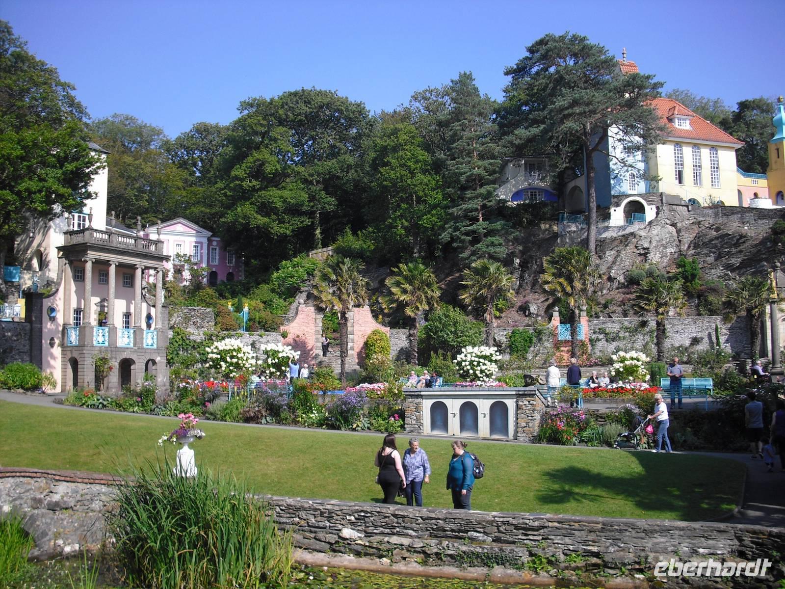 In Wales einen Abstecher nach Italien machen, das stand anschließend mit dem Besuch von PORTMEIRION auf dem Programm. Ein Clough Williams-Ellis begann 1925 ein Dorf mit einer Piazza, einem Campanile und mediterran anmutenden Loggien an den Häusern zu gestalten, eben ein Kleinitalien in Wales. Er war Architekt, hatte Geld und diese Idee. Fast 50 Jahre dauerten die Arbeiten bis 1973 sein Traum erfüllt war. Er selbst hatte das hohe Alter von 90 Jahren erreicht. In den 60ziger Jahren war der Ort Filmkulisse für eine auch in Deutschland laufende Fernsehserie "The Prisoner" (Der Gefangene). Wir bezahlten unseren Eintritt für dieses private Dorf in Wales und haben uns knapp zwei Stunden "in Italien" entspannen können.