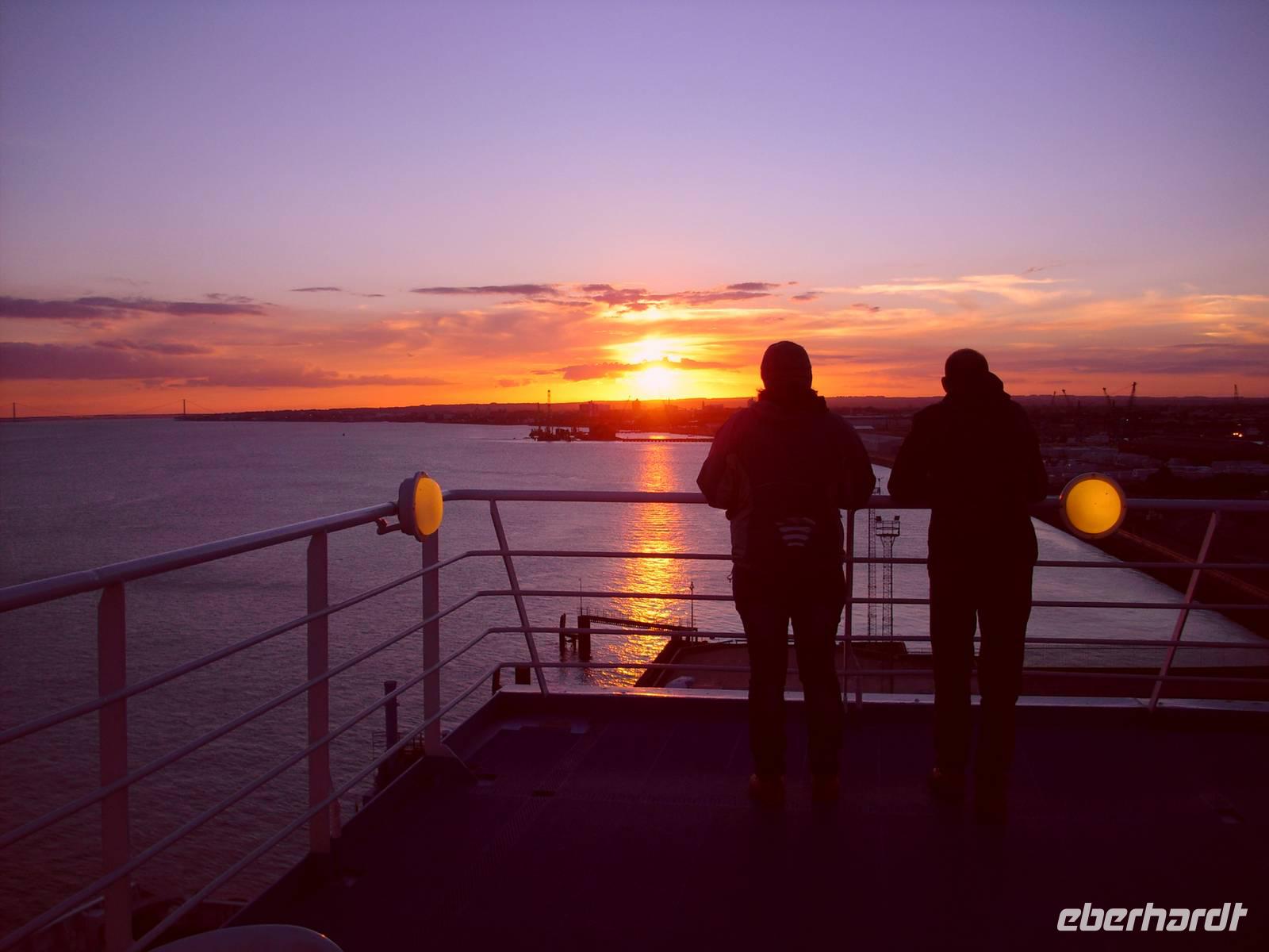 Chester, von den Römern gegründet und mit dem größten bisher auf der britischen Insel gefundenen Amphitheater, hat ein einnehmendes Flair. Bei unserem Spaziergang sahen wir die EASTGATE CLOCK, die CATHEDRAL, die TOWN HALL, die GROSVENOR BRIDGE und einiges mehr. Wichtig wurde jetzt die rechtzeitige Abfahrt von Chester und die Ankunft im Fährhafen von Kingston upon Hull. Mit einer Servicepause auf dem Weg zum Hafen und einer komplikationslosen Grenzkontrolle kamen wir rechtzeitig auf das Schiff. Einige gingen gleich zum Abendessen, andere schauten sich im Aussenbereich einen herrlichen Sonnenuntergang an und wieder andere suchten vielleicht noch ihre Kabinen für die Nachtfährpassage über die Nordsee nach Rotterdam.