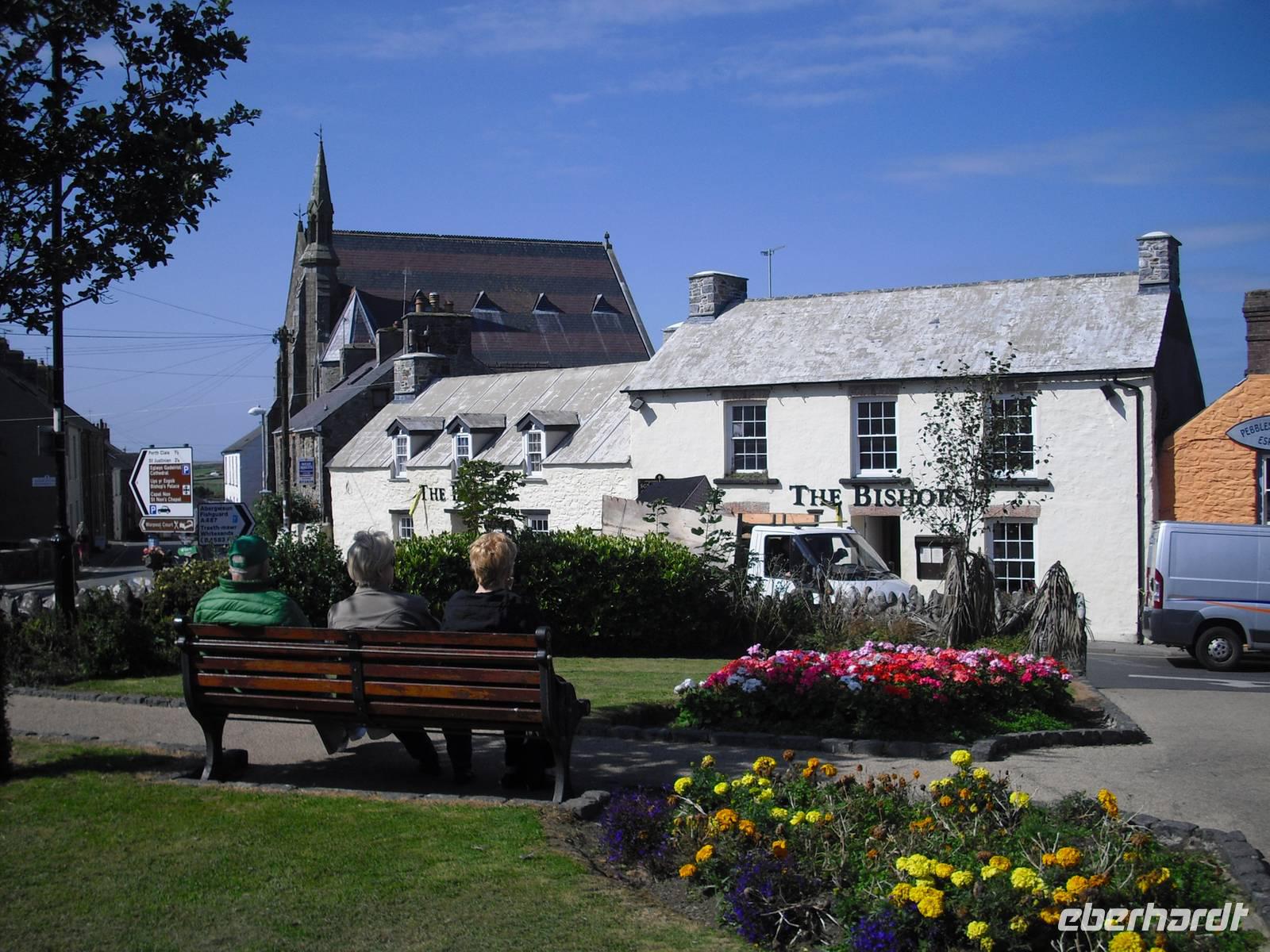 Die Fahrt ging nach dem walisischen Frühstück nach ST. DAVIDS , der heilige David ist der Schutzpatron von Wales und wir wollten die Kathedrale besuchen. Unterwegs bot sich bei dem schönen Wetter ein Fotostopp in Newgale an und anschließend erst einmal ein Besuch des White Sand Beach im Pembrokeshire Coast National Park. Er erstreckt sich über 620 qkm und ist atemberaubend mit den Sandstränden, zerklüffteten Küstenabschnitten, bewaldeten Mündungen und vorgelagerten Inseln. Geschaffen wurde der Nationalpark im Jahr 1952. Ganz in der Nähe befinden sich die im Norden liegenden Preseli Hills mit einer Höhe von 536 m. Von hier wurde das Gestein für STONEHENGE bis in die Nähe von Salisbury transportiert. Dann jedoch besichtigten wir die Kathedrale in St. Davids. Sie ist das vierte Kirchenbauwerk an dieser Stelle und der Baubeginn war 1181. Über vierzehn Jahrhunderte war die Kathedrale ein wichtiges Pilgerziel und 1124 erklärte Papst Calixtus II., daß zweimal nach St. Davids pilgern gleichzusetzen ist mit einer Pilgertour nach Rom. Und dreimal nach St. Davids pilgern gleichzusetzen ist mit einer Pilgertour nach Jerusalem.