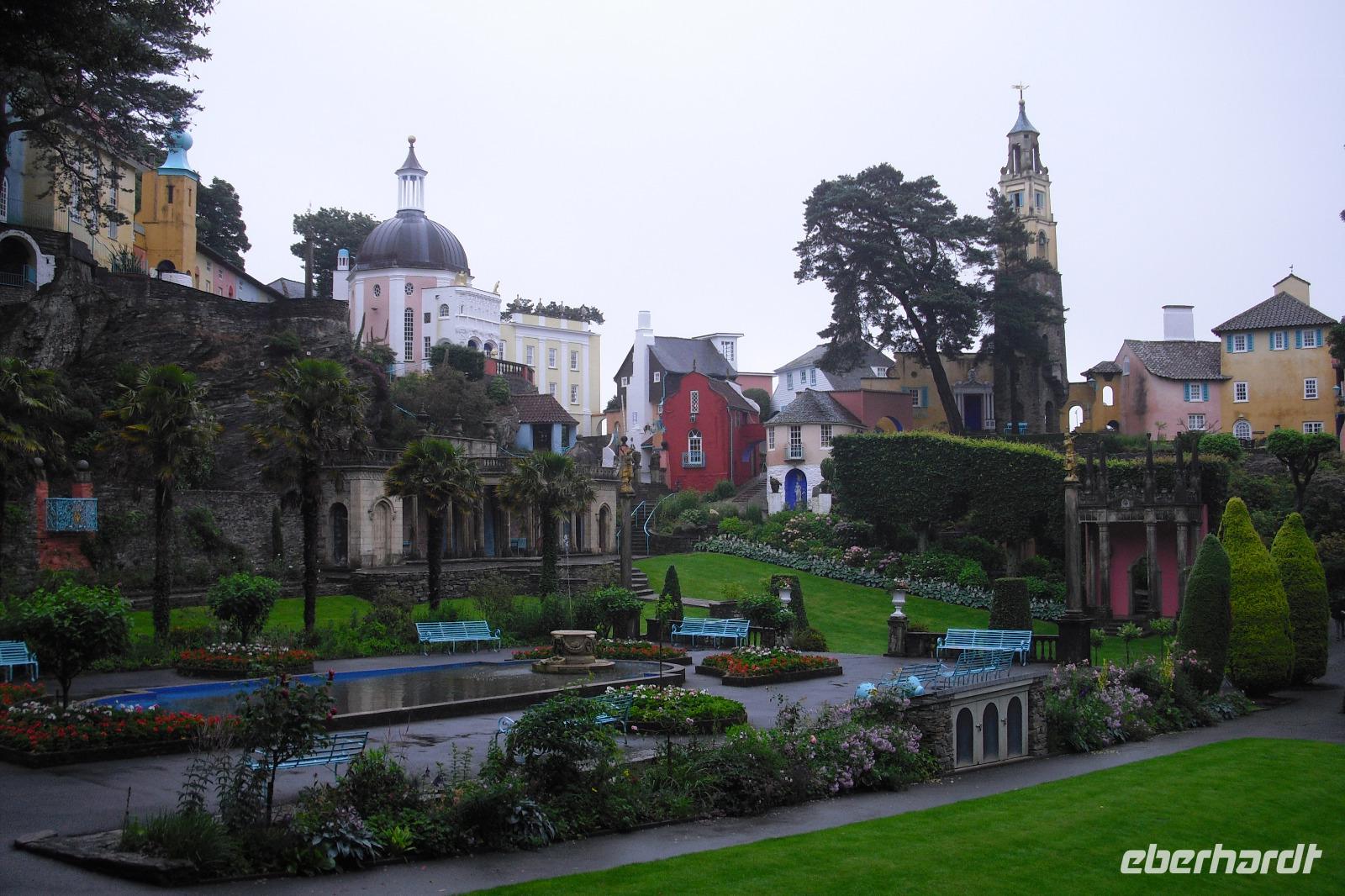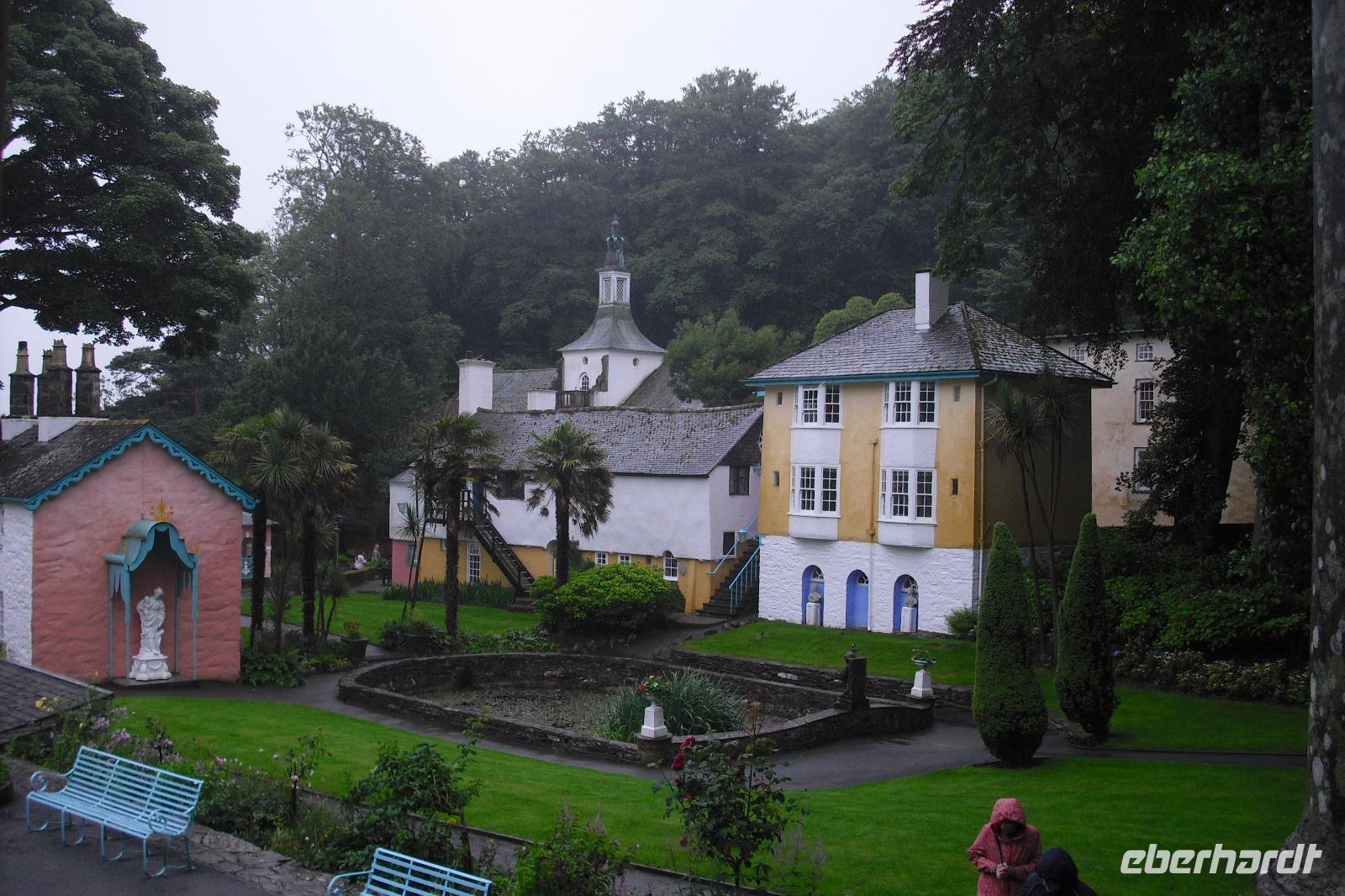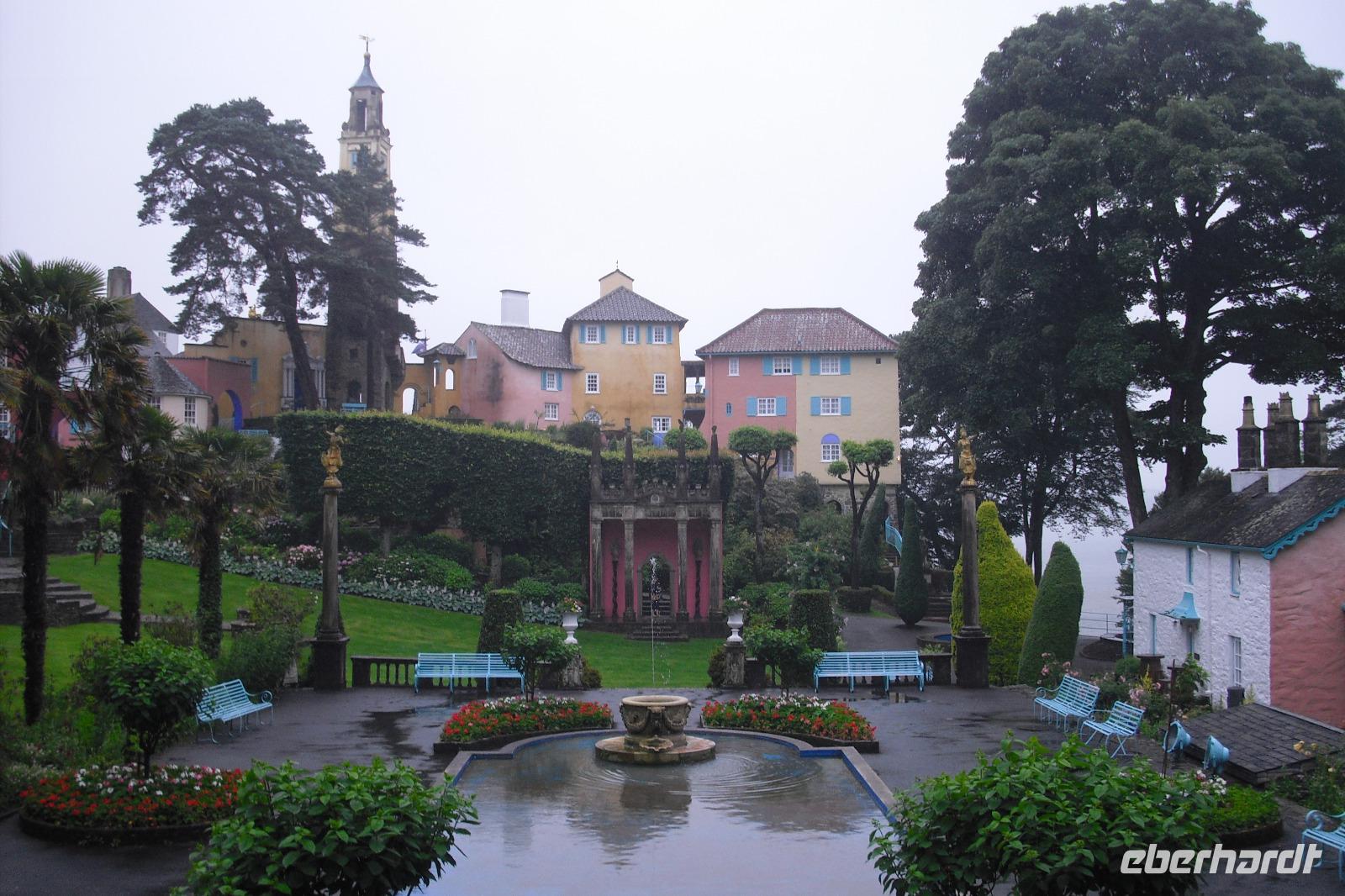 Das Wetter wollte sich noch nicht zum Guten wenden und so besuchten wir Portmeirion, Kleinitalien in Wales, im Nieselregen. Der Architekt Clough William-Ellis hatte die Idee und begann 1925 mit den Arbeiten. Es sollte mehr als 50 Jahre dauern bis alles fertig war, eine Piazza, ein Campanile und der Garten im italienischen Stil. Fast alle Häuser bieten Unterkunft, denn das Projekt(die Idee) hatte und hat auch einen ökonomischen Hintergrund, selbst wir hatten einen Eintrittspreis zu entrichten. Aber das Ganze? Eine für Wales ziemlich bedeutsame Attraktion! Portmeirion war auch Kulisse für mehrere Filme, so für die frühere Fernsehserie THE PRISONER im deutschen Fernsehen.