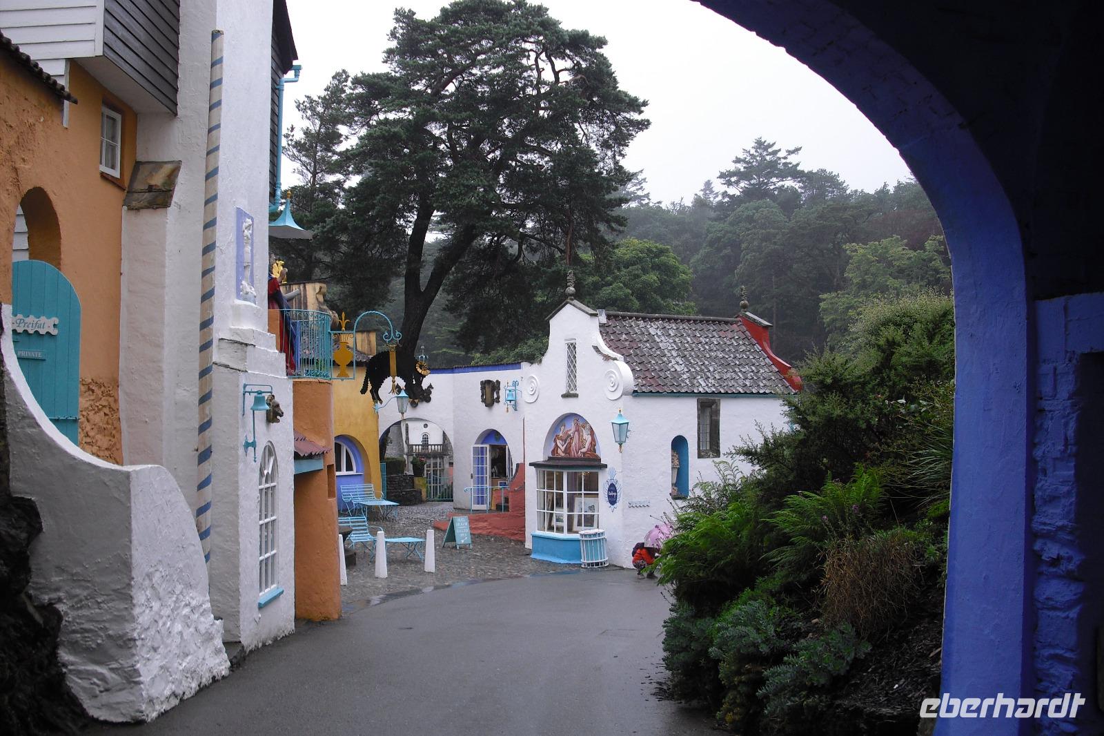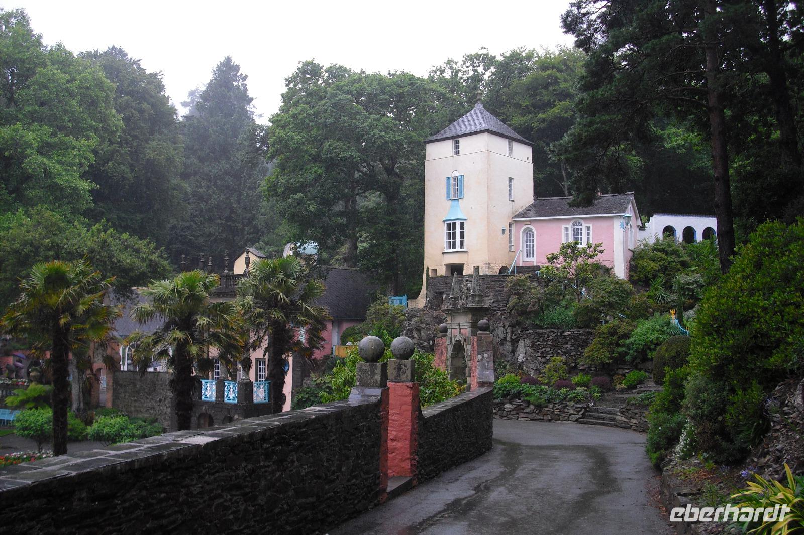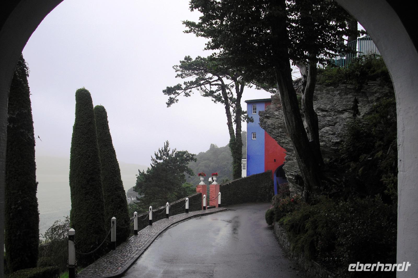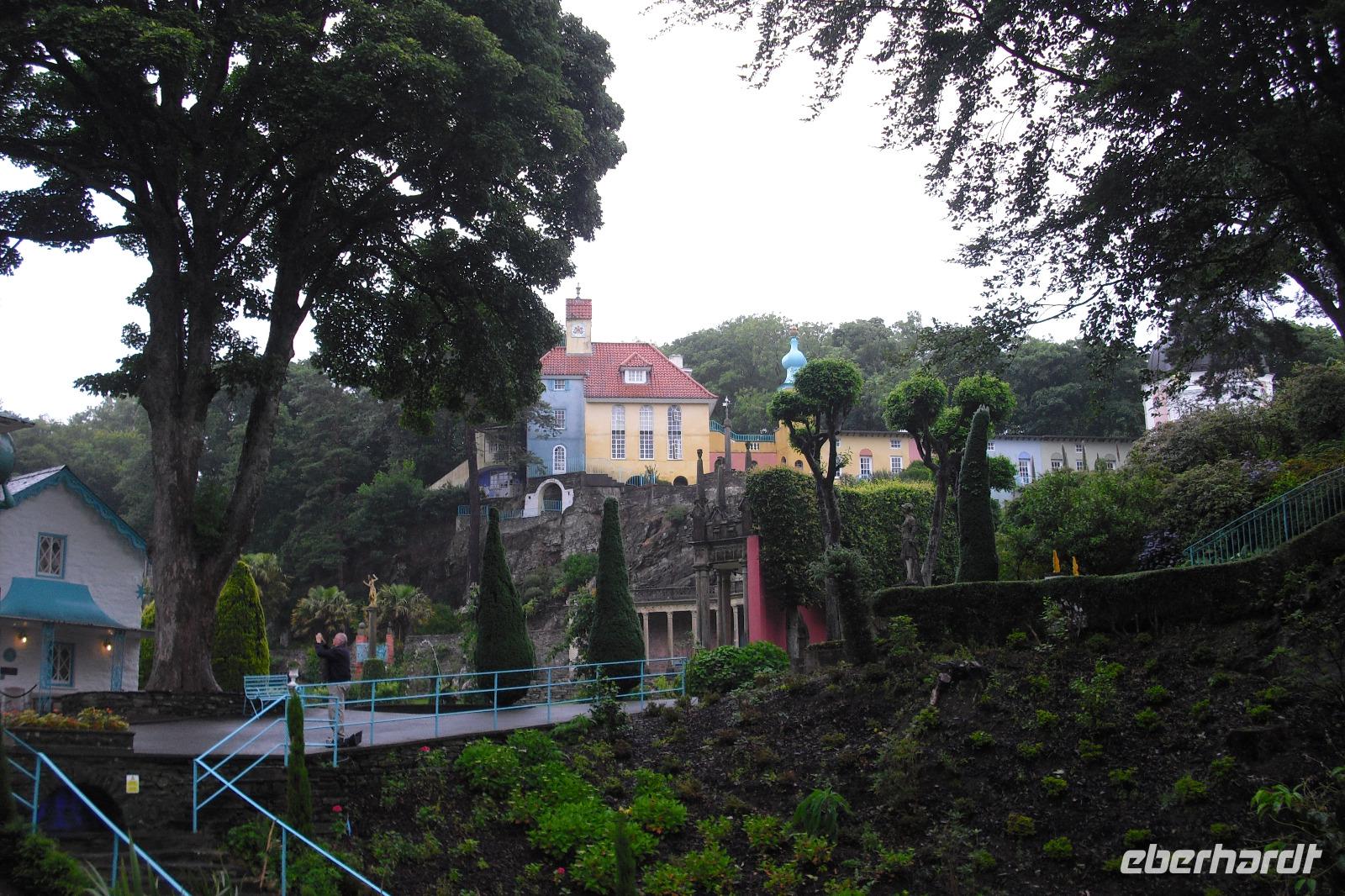 Das Wetter wollte sich noch nicht zum Guten wenden und so besuchten wir Portmeirion, Kleinitalien in Wales, im Nieselregen. Der Architekt Clough William-Ellis hatte die Idee und begann 1925 mit den Arbeiten. Es sollte mehr als 50 Jahre dauern bis alles fertig war, eine Piazza, ein Campanile und der Garten im italienischen Stil. Fast alle Häuser bieten Unterkunft, denn das Projekt(die Idee) hatte und hat auch einen ökonomischen Hintergrund, selbst wir hatten einen Eintrittspreis zu entrichten. Aber das Ganze? Eine für Wales ziemlich bedeutsame Attraktion! Portmeirion war auch Kulisse für mehrere Filme, so für die frühere Fernsehserie THE PRISONER im deutschen Fernsehen.