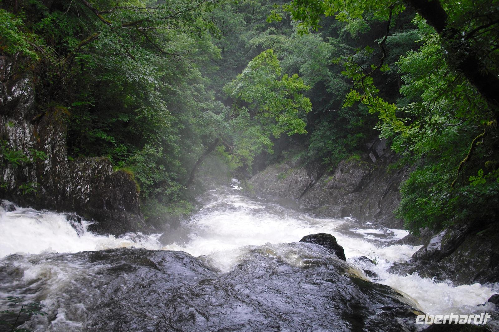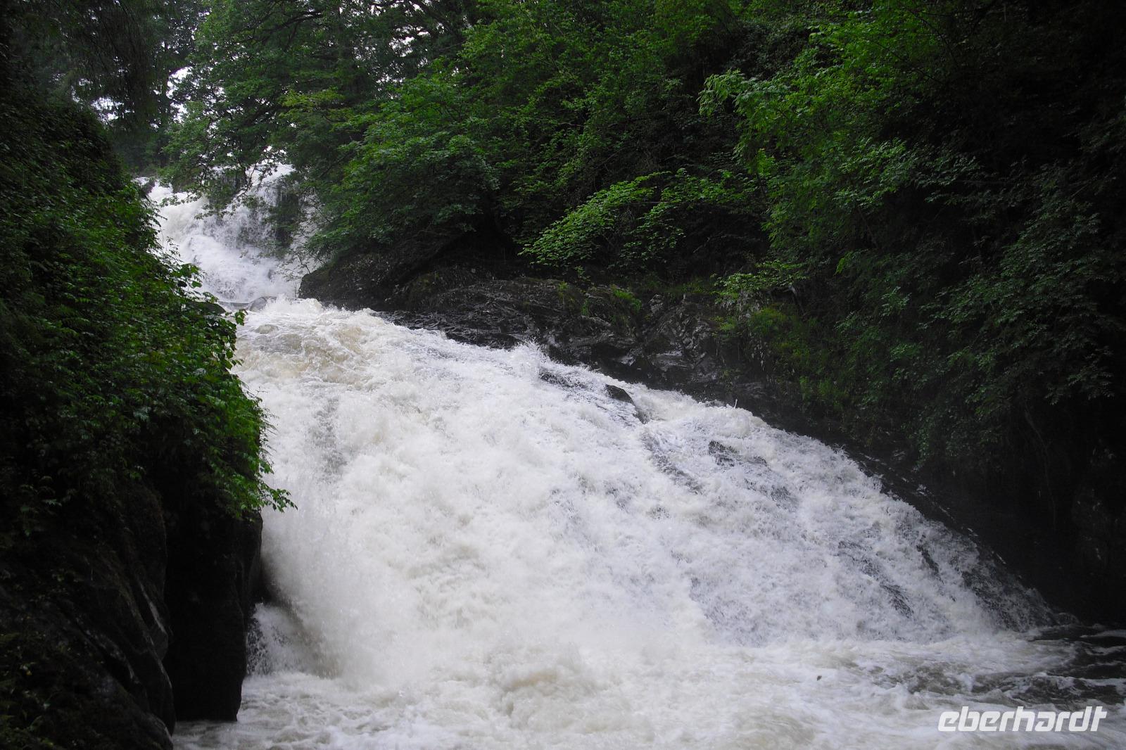 Auf dem Weg zum Hotel in Aberystwyth lag es nahe, noch einen Stopp an der Devil´s Bridge einzulegen. Hier rauscht der River Mynach durch eine enge Klamm und über diese Klamm wurden 3 Brücken gebaut. Im 11.Jh. von den Mönchen der Strata Florida Abbey, im 18.Jh. die Steinbrücke in der Mitte und 1901 die heutige Brücke mit Fahrstraße. Und die Legende vom Teufel? Die erfährt man vor Ort.