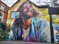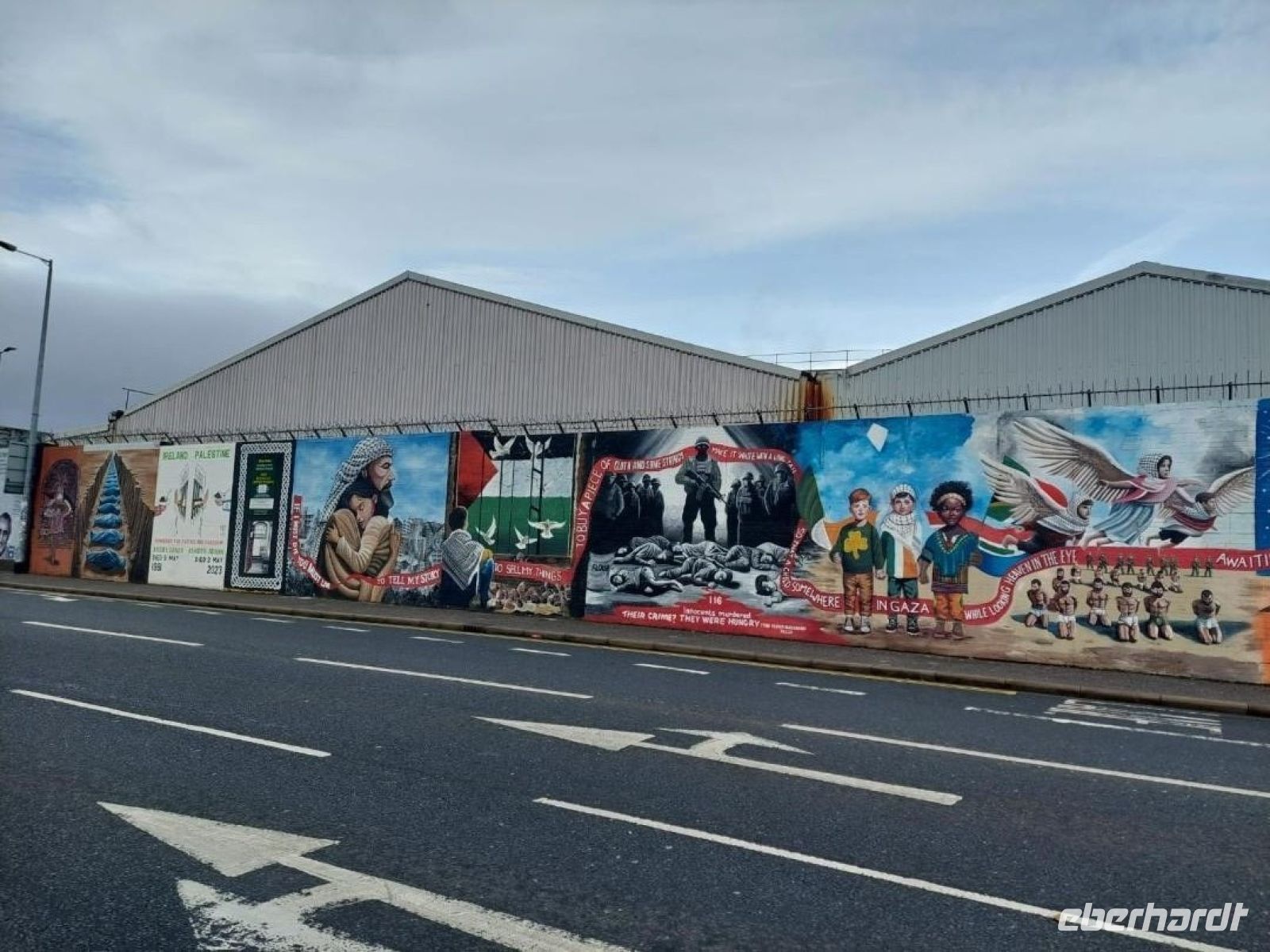 Es folgte eine Stadtrundfahrt durch Belfast. Vorbei an der ehemaligen „Townhall“, der „Albert Clock“ dem „Big Ben“ oder auch „schiefen Turm“ von Belfast, überquerten wir den River „Lagan“ über die Albert Bridge hinüber in das Ost-Belfaster Arbeiterviertel, wo einst der Musiker Van Morrisson aufwuchs, bis hinauf zum Sitz des nordirischen Parlaments „Stormont“; von dort zurück in die Stadt und vorbei am City Airport und tauchten wir sogleich ein in die ganz eigene Welt der Westbelfaster Arbeiterquartiere „Falls Road“ und „Shankill“ mit seinen berühmten Wandbildern „Murals“ und der sogenannten „Peace-Wall“. Wir hielten unterwegs hier & dort an, um die Erklärungen der Reiseleiterin zu der jüngeren, teilweise sehr leidvollen Geschichte dieser Stadt an authentischer Stätte besser aufnehmen zu können.