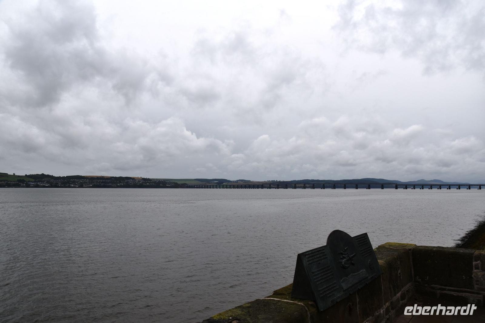 Danach fahren wir über die neue Firth of Forth Roadbridge weiter nach Dundee, wo wir vor der Stadt auch noch den Firth of Tay überqueren müssen. Auf Sichtweite liegt westlich daneben die immerhin 2,75 Meilen lange Railwaybridge, deren Mittelteil bei einem Wintersturm 1879 einstürzte und 75 Menschen in dem sie gerade überquerenden Zug mit in den Tod riss.