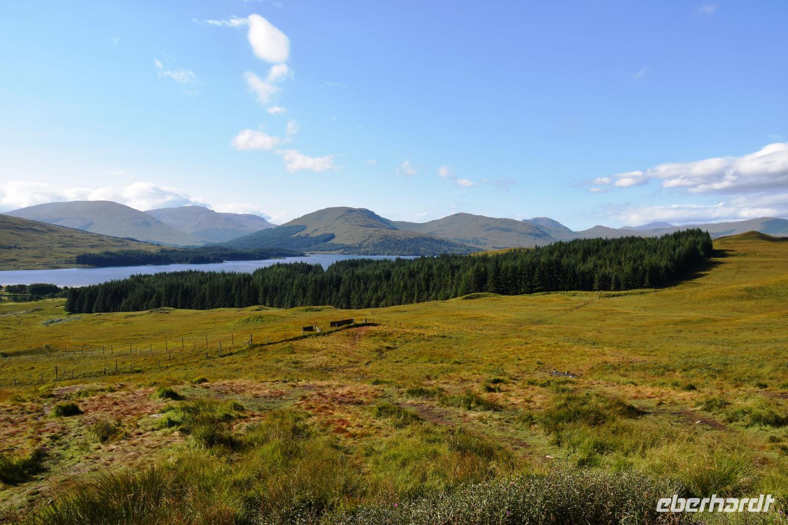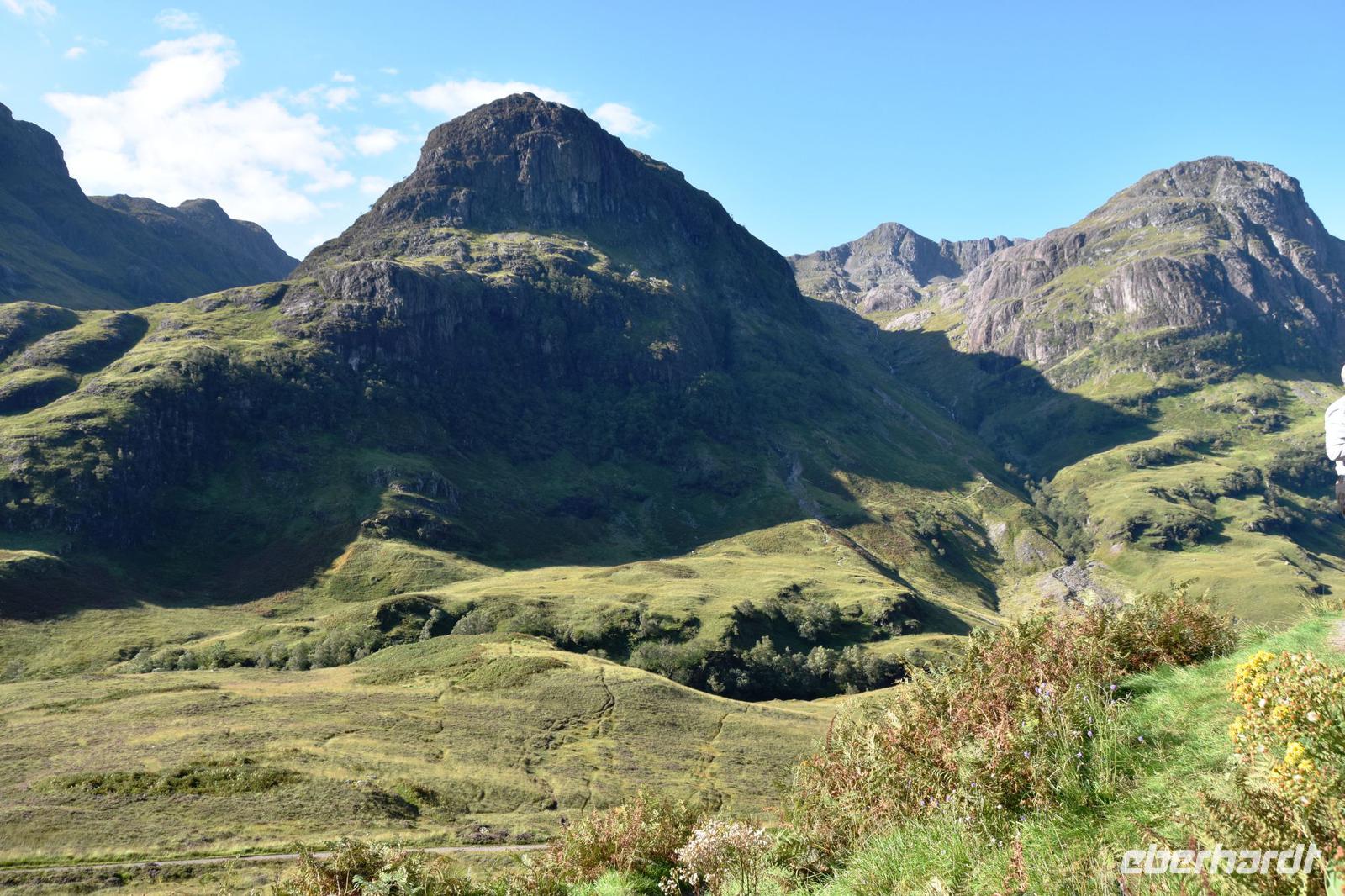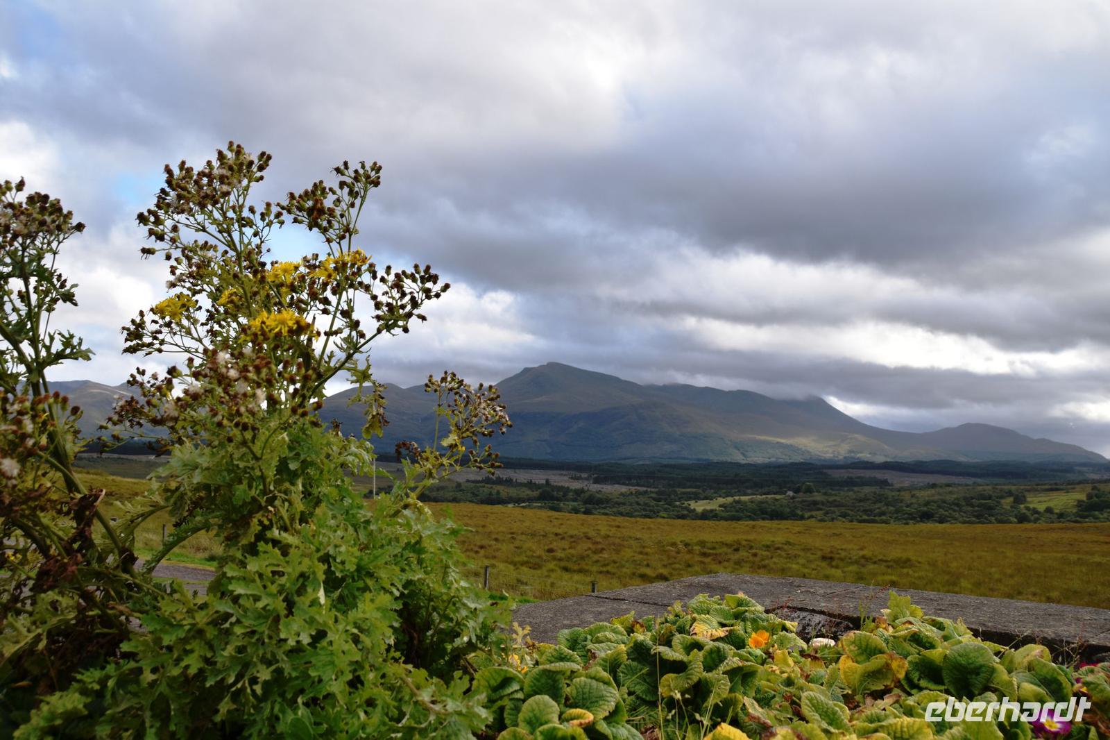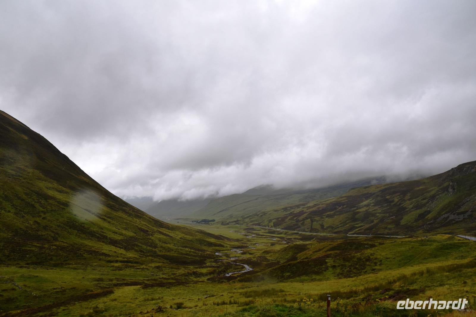 Die Schlucht und durch das wildromantische Tal hinauf geht es, bis unter den 1019 m hohen „Hirten", dann über das Rannoch Moor und vorbei am Loch Tulla bis Tyndrum, wo wir eine Pause am Rasthaus „Grüner Stiefel" einlegen.