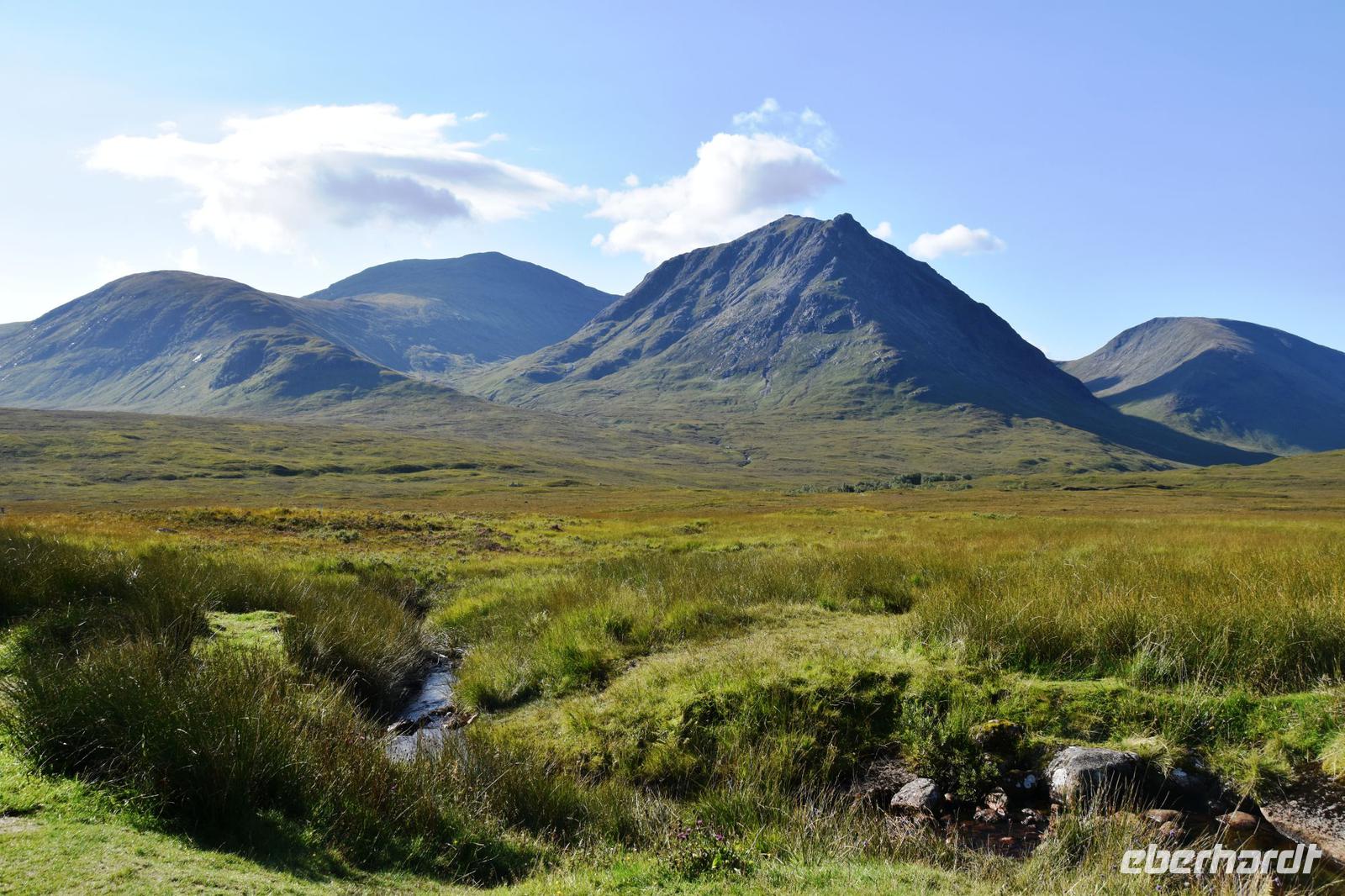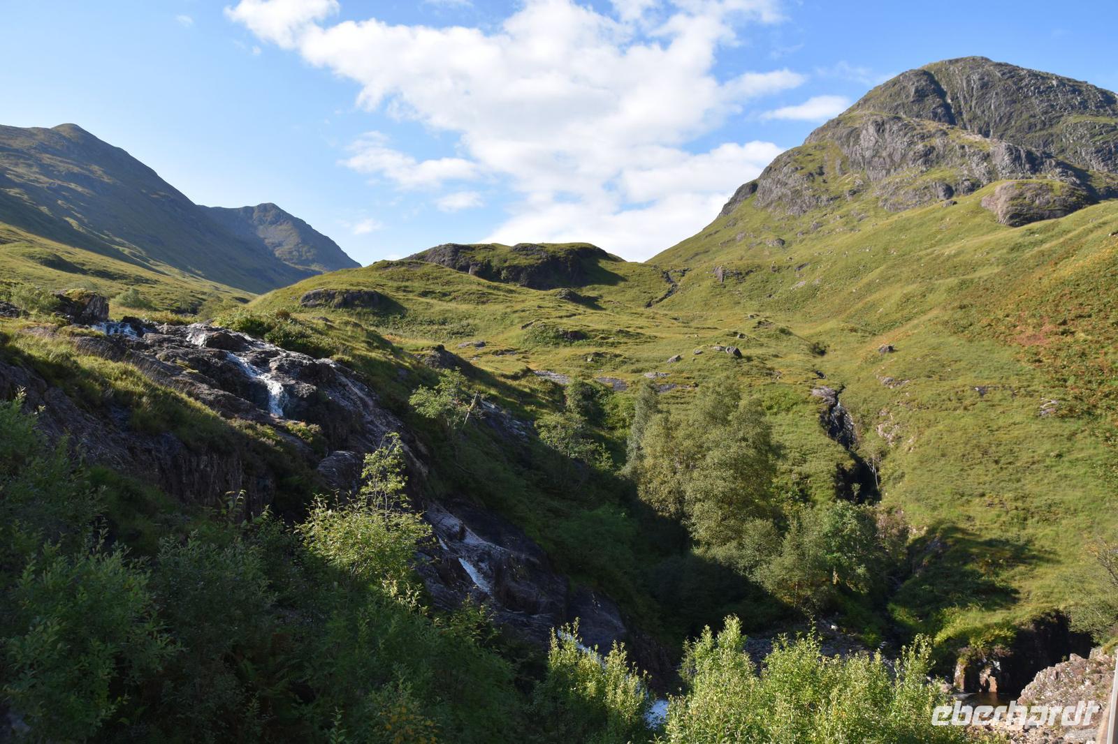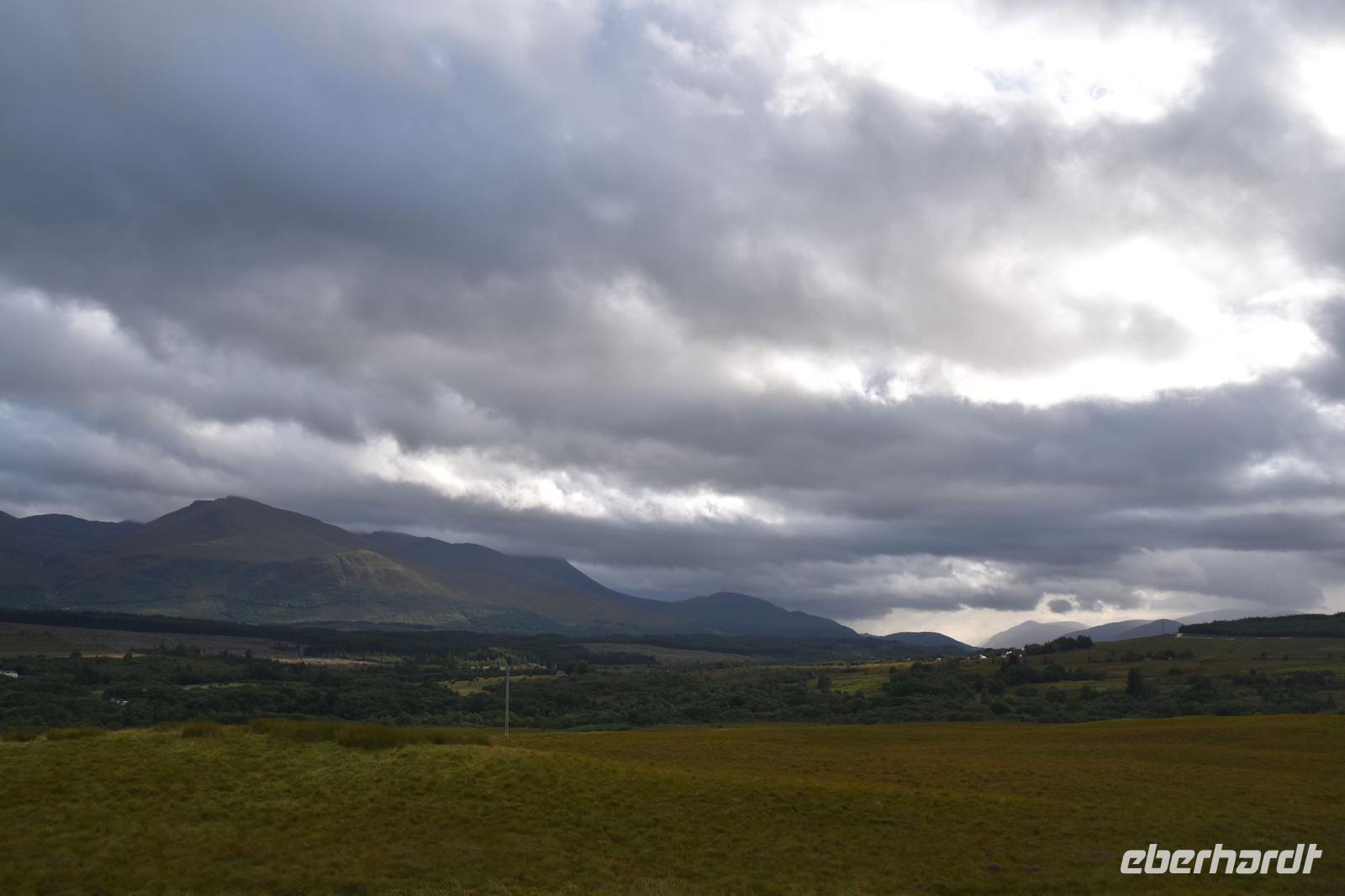 Die Schlucht und durch das wildromantische Tal hinauf geht es, bis unter den 1019 m hohen „Hirten", dann über das Rannoch Moor und vorbei am Loch Tulla bis Tyndrum, wo wir eine Pause am Rasthaus „Grüner Stiefel" einlegen.