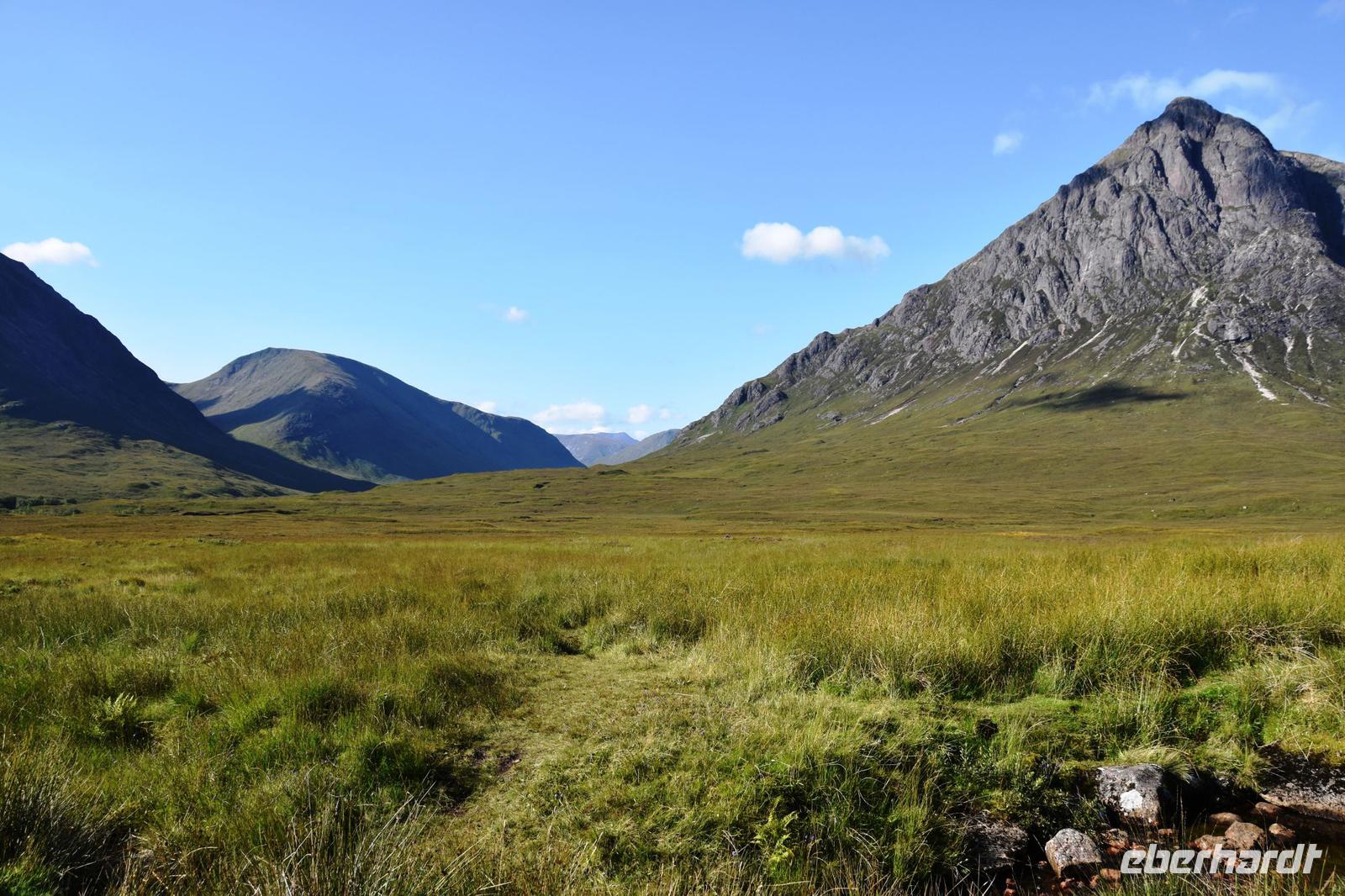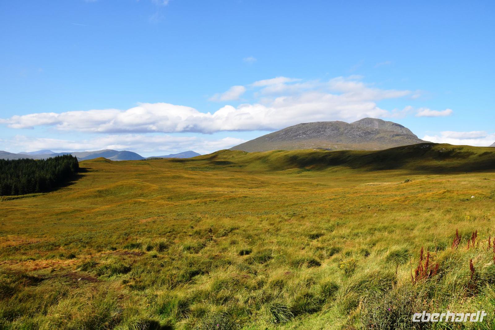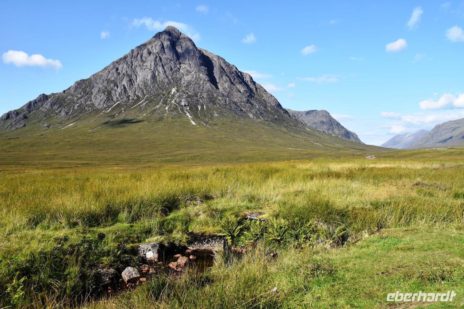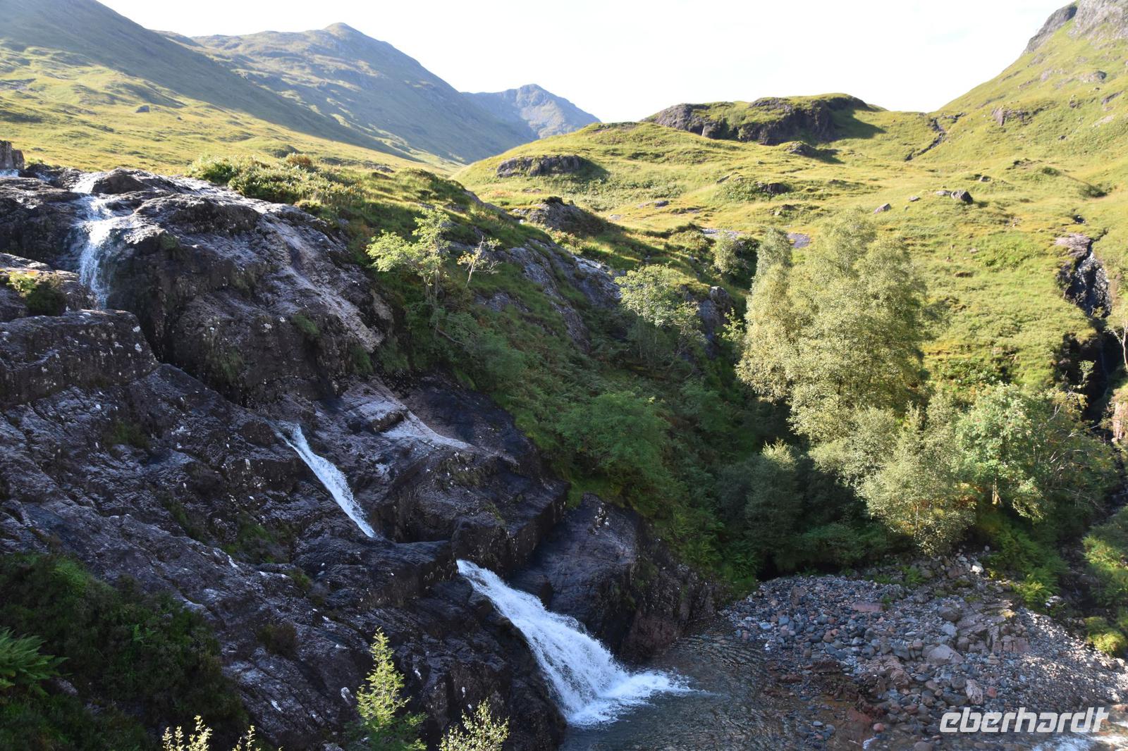 Die Schlucht und durch das wildromantische Tal hinauf geht es, bis unter den 1019 m hohen „Hirten", dann über das Rannoch Moor und vorbei am Loch Tulla bis Tyndrum, wo wir eine Pause am Rasthaus „Grüner Stiefel" einlegen.