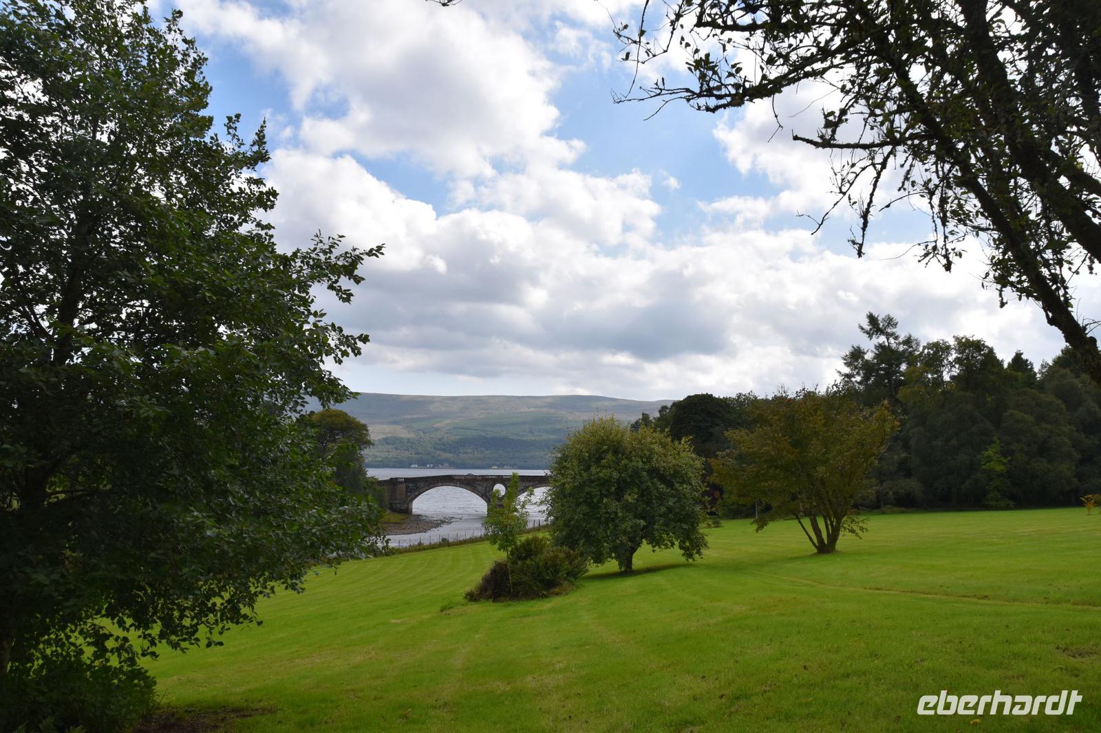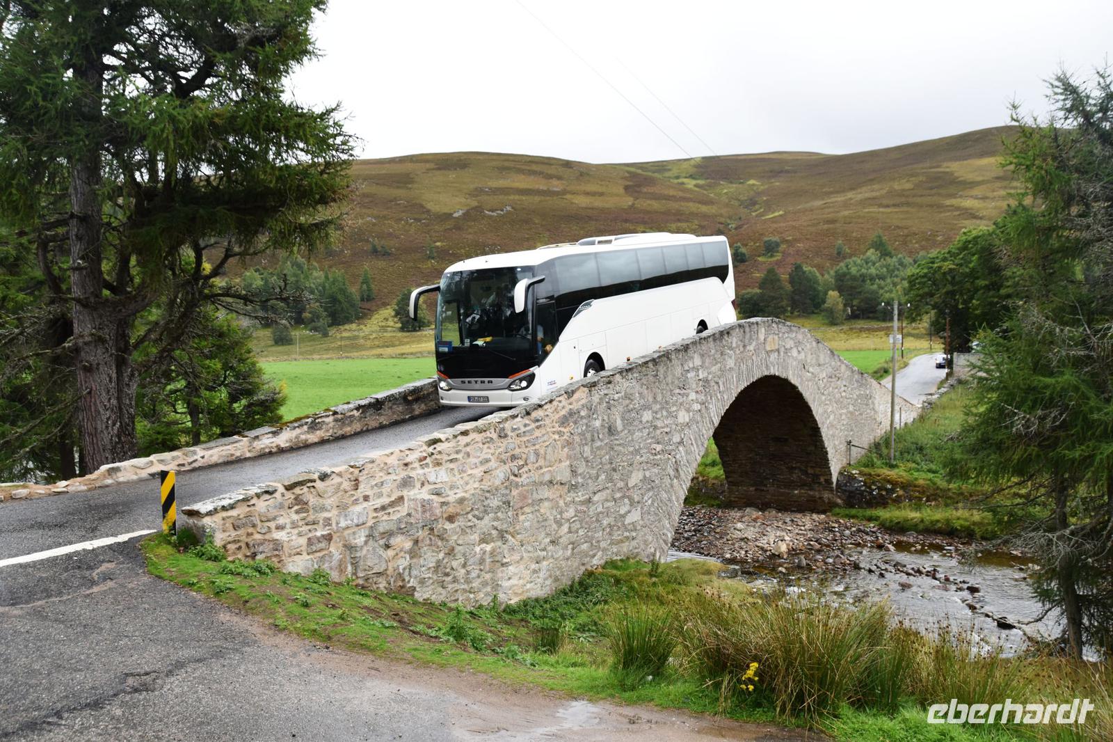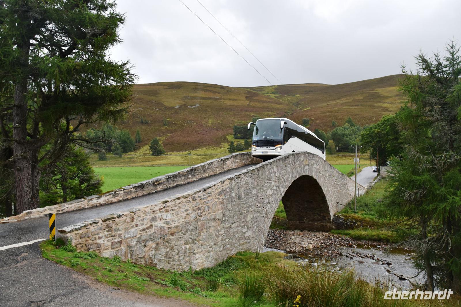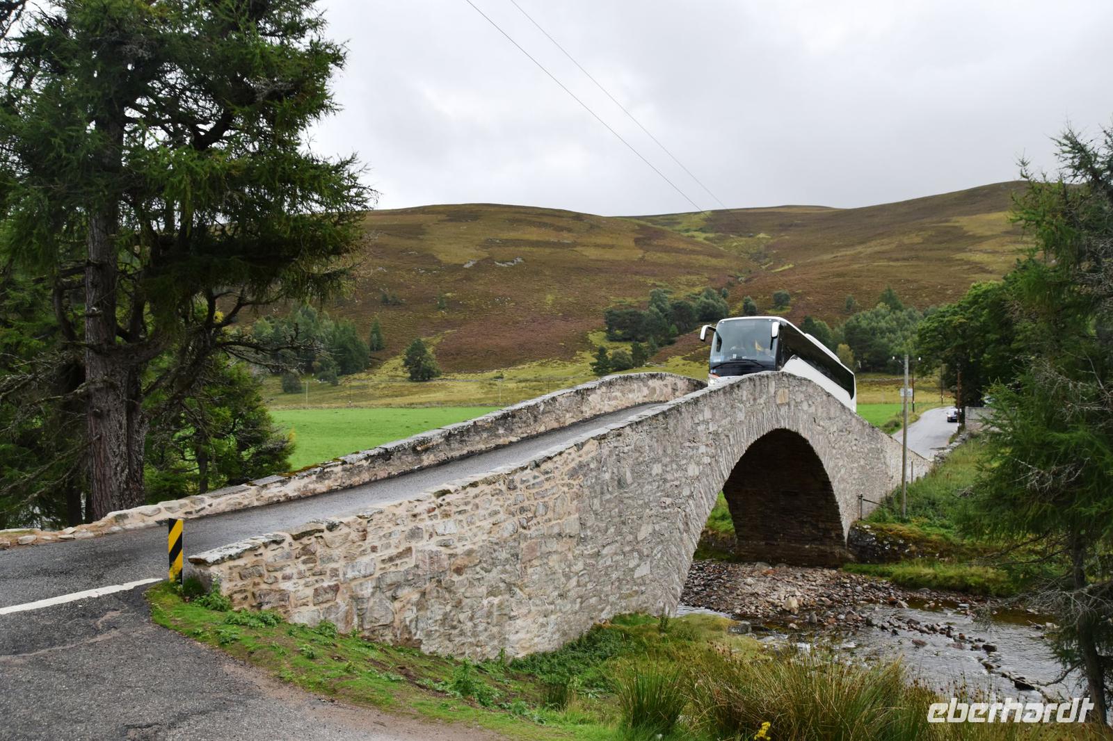 Es ist wieder schönes, aber kühles Wetter. Die Koffer werden verladen und wir fahren in das Great Glen, eine andere Region der Highlands. Auf der Fahrt hinauf nach Norden machen wir einen Abstecher über Carrbridge und hier noch einen Fotostopp an der von 1716 erhaltenen Packpferdbrücke.