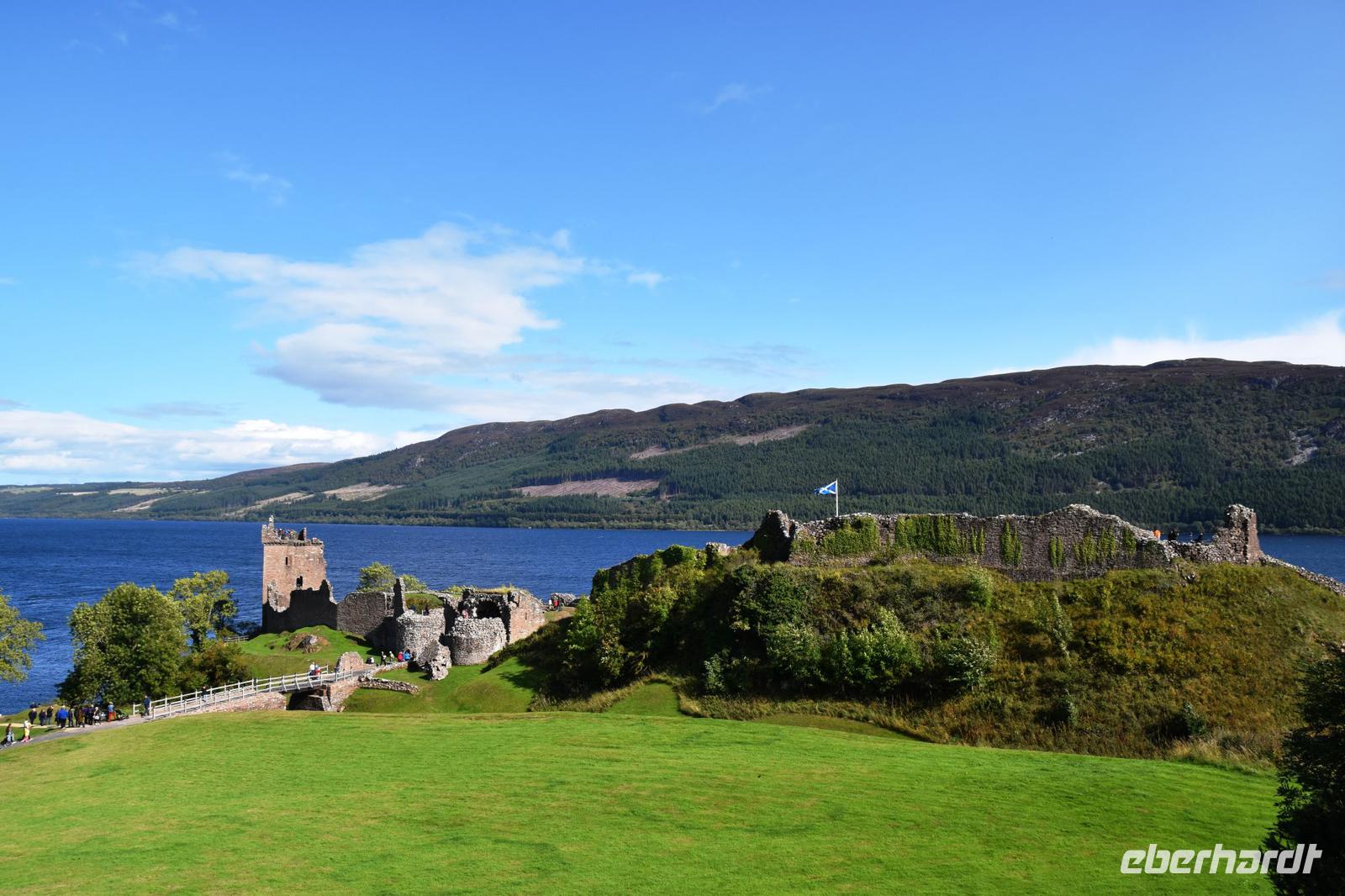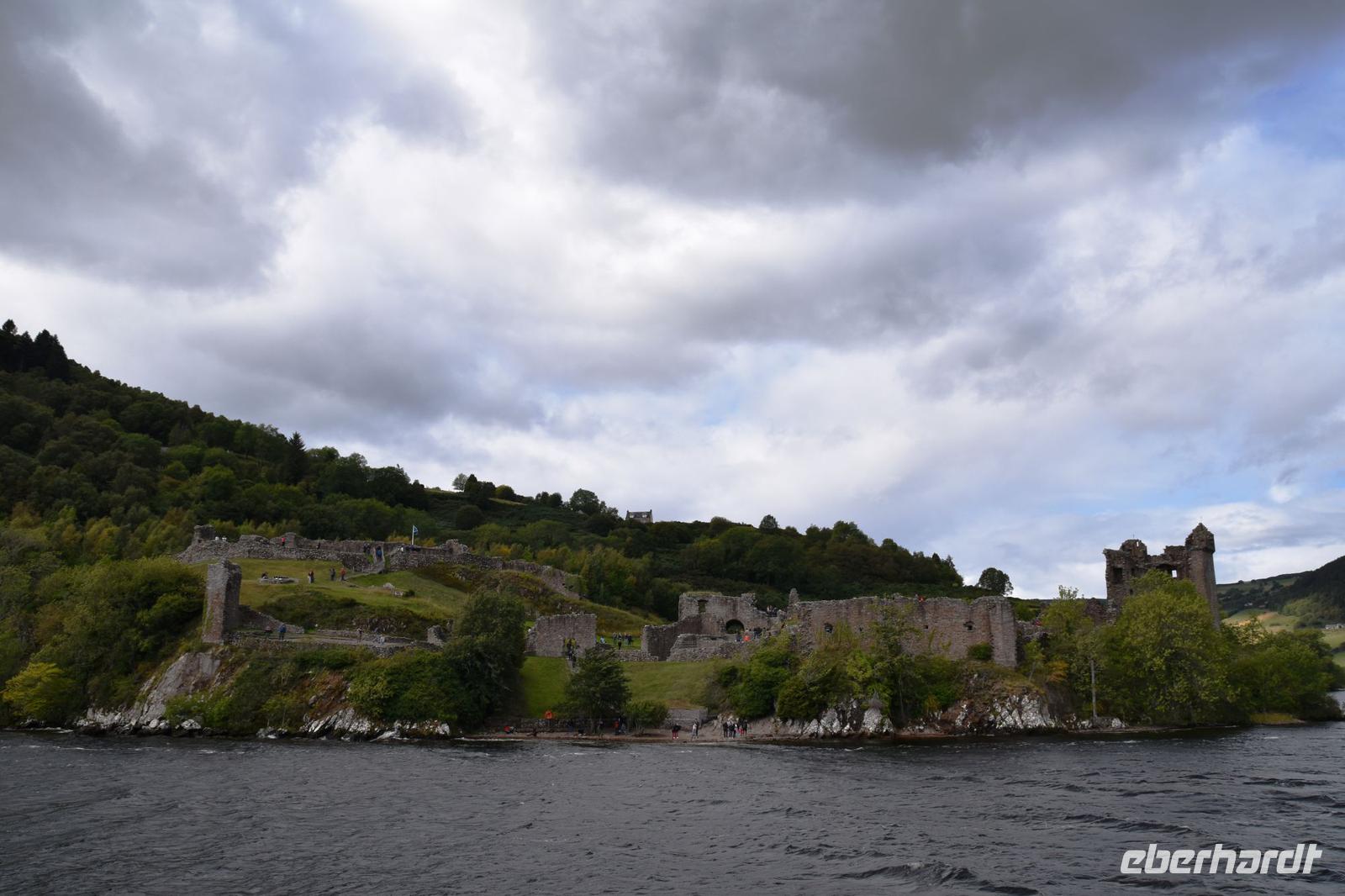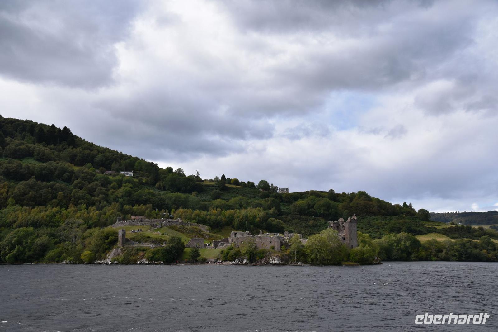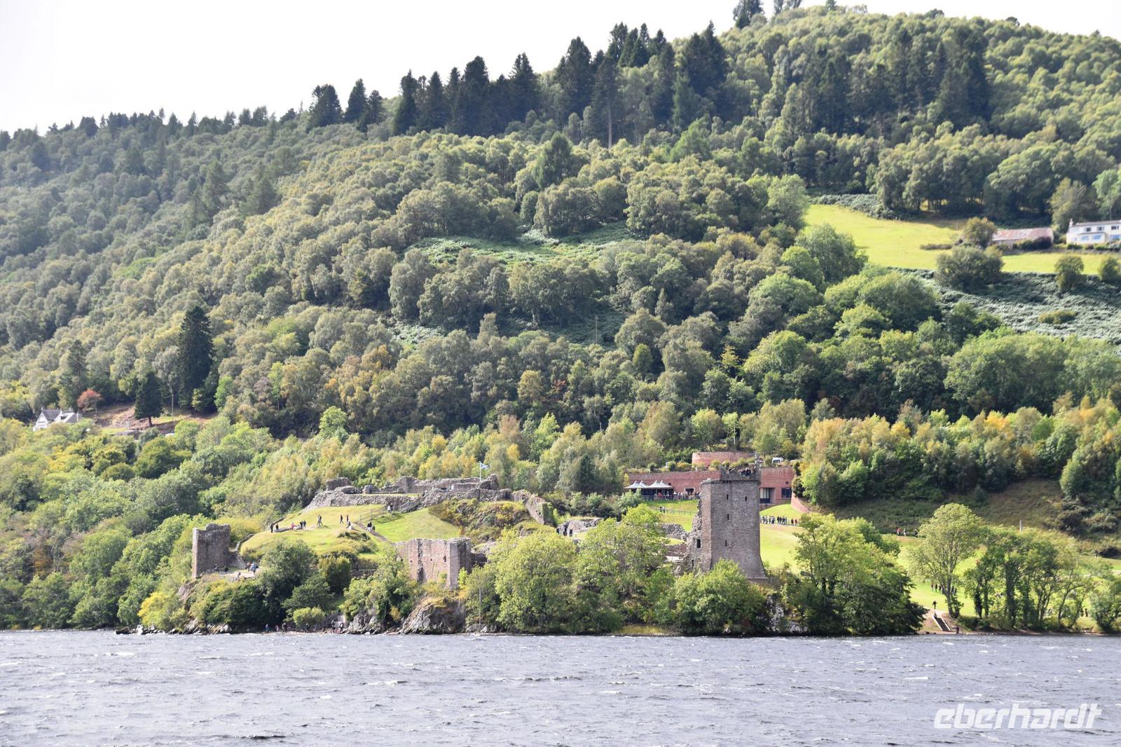 Zum Mittag fahren wir durch Inverness in das Great Glen, in den großen Grabenbruch. Der nördlichste der Seen darin ist Loch Ness. Am Clansman Hotel steigen wir aus und gehen beim nahen Schiffsanleger an Bord des Motorschiffes der Jacobite Cruises. Es bringt uns sicher über den See zu den Ruinen des Urquhart Castle. Nessy können wir nicht entdecken, aber es hat auch keiner Haribo mit.