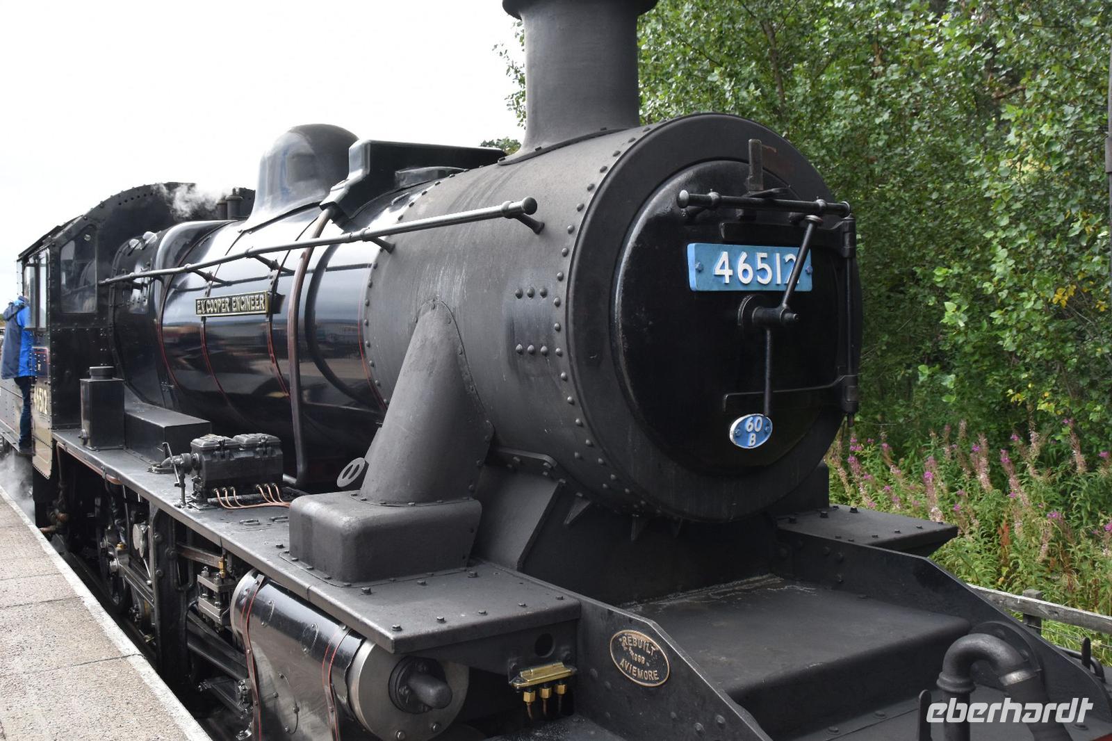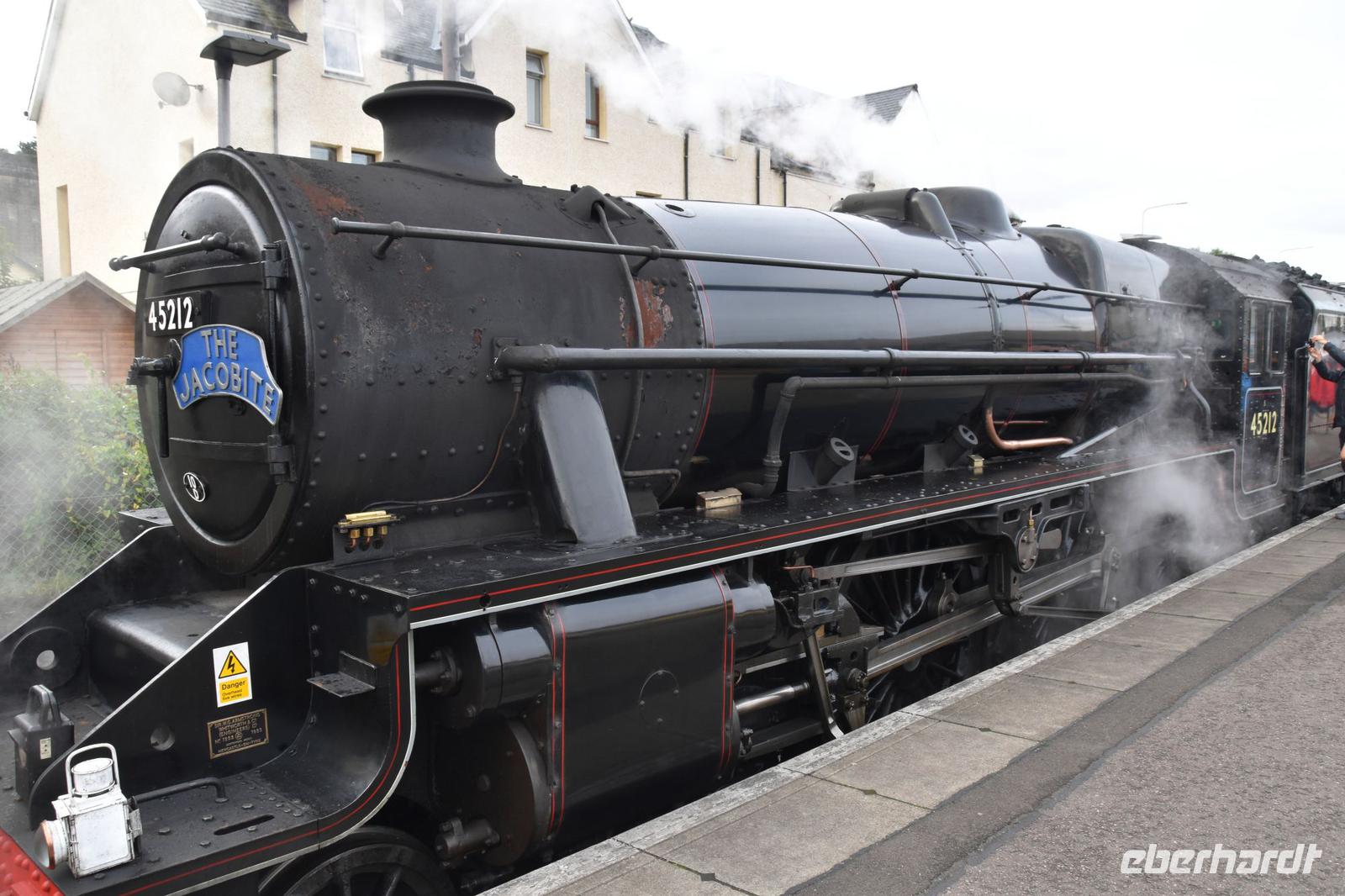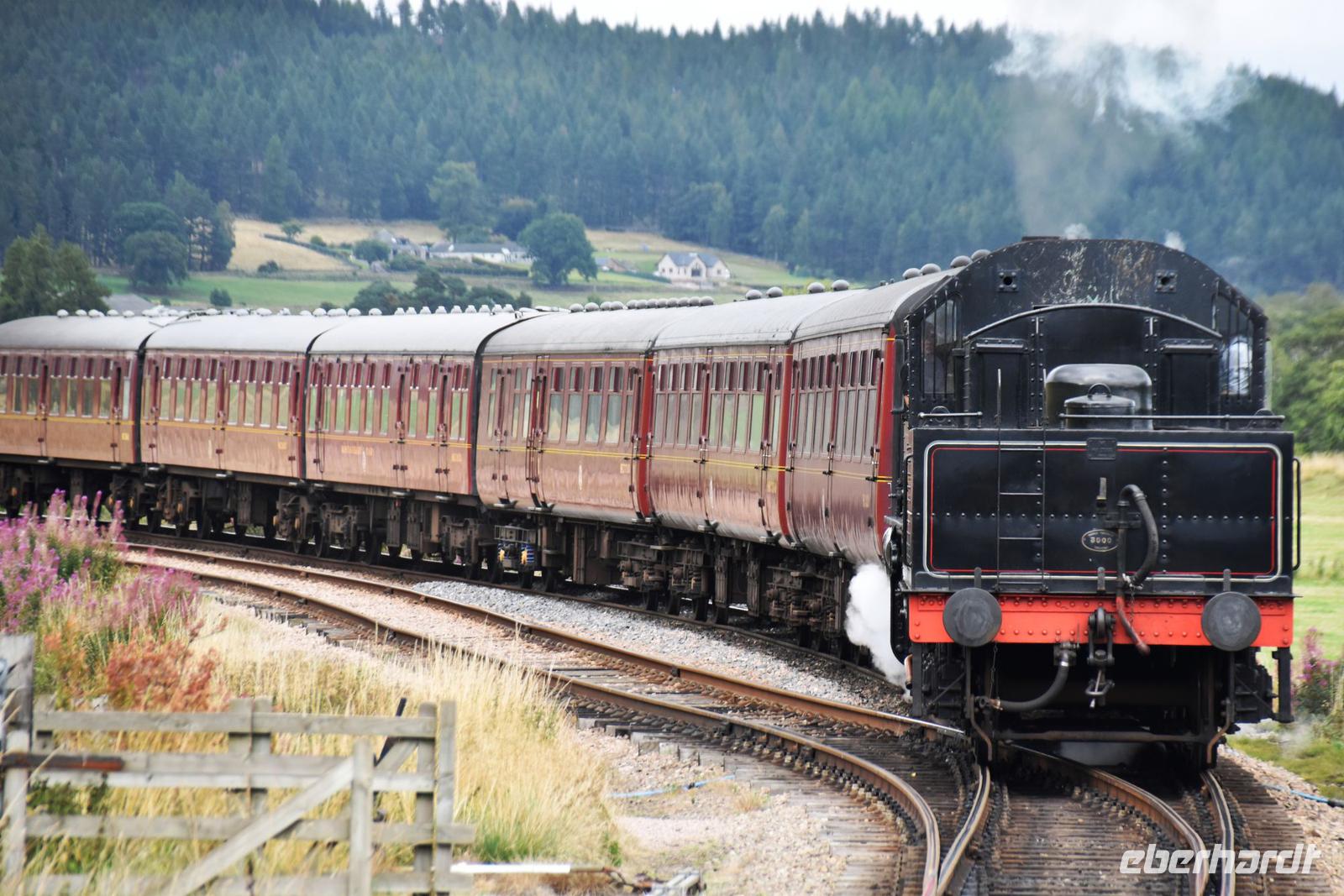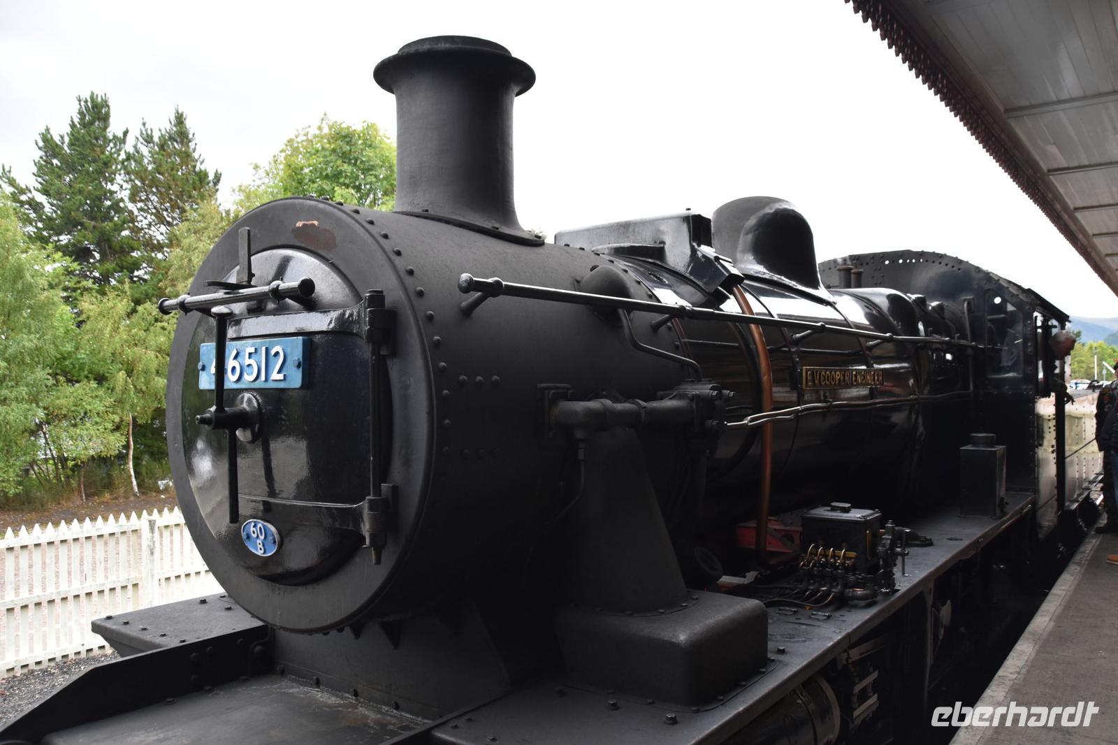 Gezogen wird der Zug durch eine Dampflok Baujahr1952. Die Ivatt 46512 mit 46512 E.V. Cooper Engineer Engine ist in Swindon gebaut worden und bringt uns über Boat of Garden sicher auf der rekonstruierten alten Strecke von 1863 nach Aviemore.