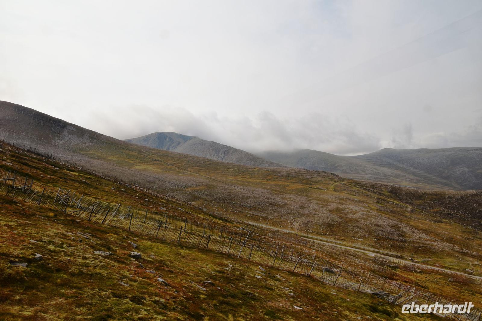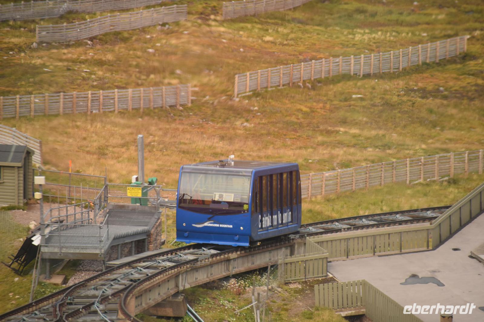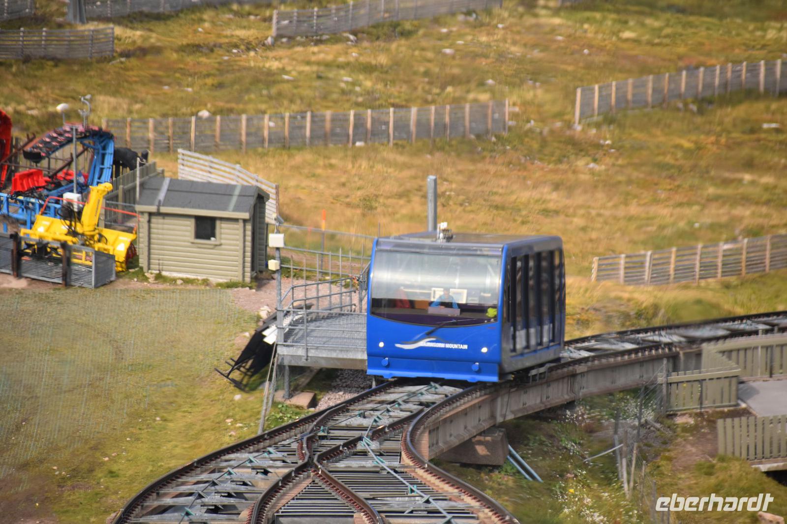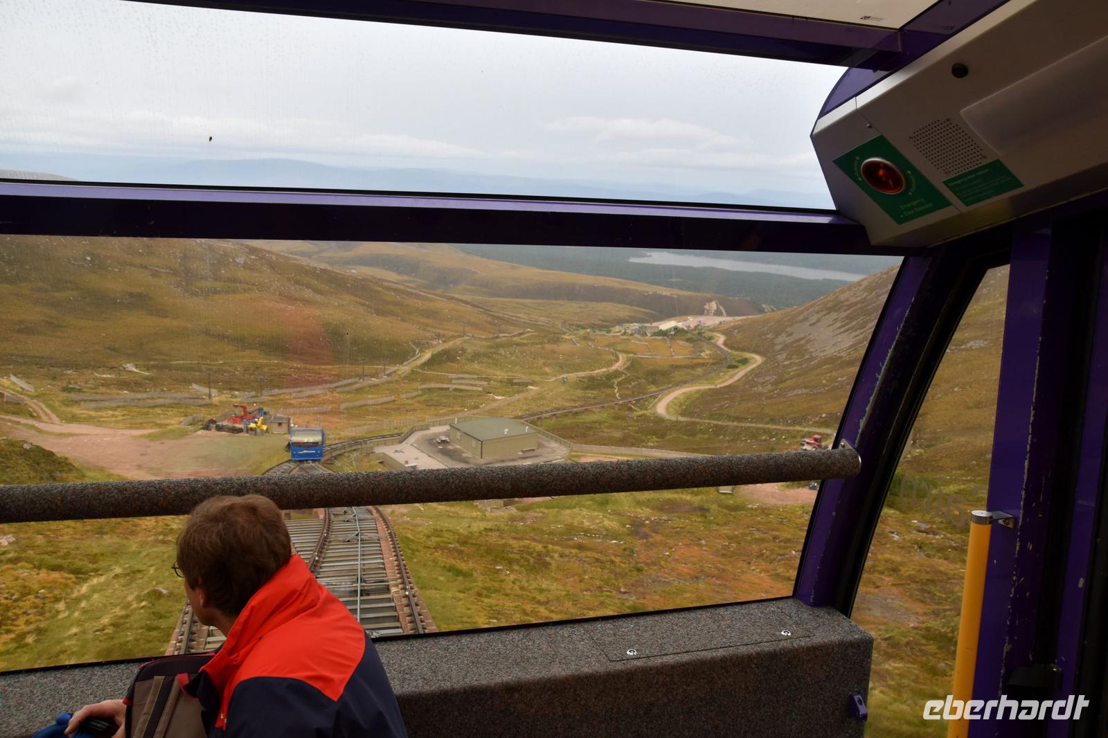 Zu Fahrtzeitbeginn, erreichen wir die Basisstation der Standseilbahn „Cairngorm Mountain Railway". Wir nutzen den ersten Wagen zur gemeinsamen Auffahrt auf der Top-Station, die knapp unter dem 1145 m hohen Cairn Gorm liegt. Dabei fährt die Bahn 40 km/h schnell und benötigt 9 Minuten für die 1,97 km lange Strecke. Sie wurde durch die Firma Doppelmayer im Dezember 2001 für das Skigebiet gebaut und ersetzte den windanfälligen Sessellift.