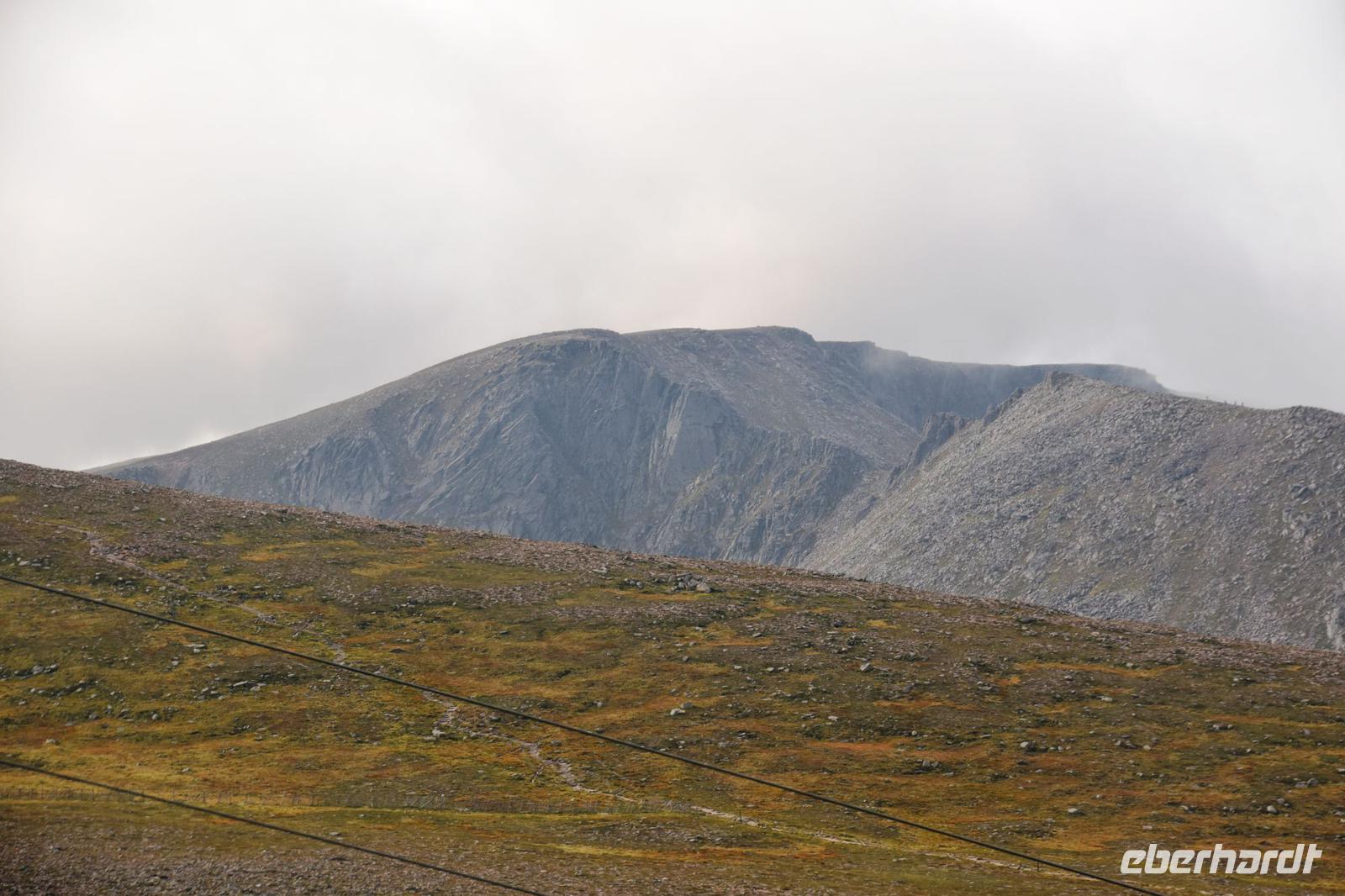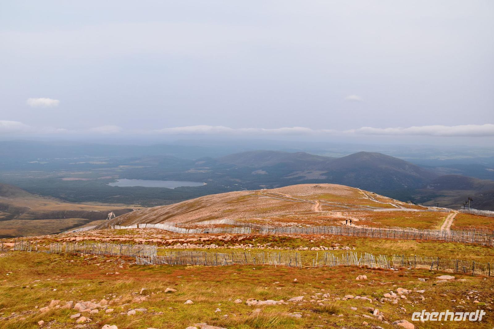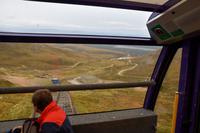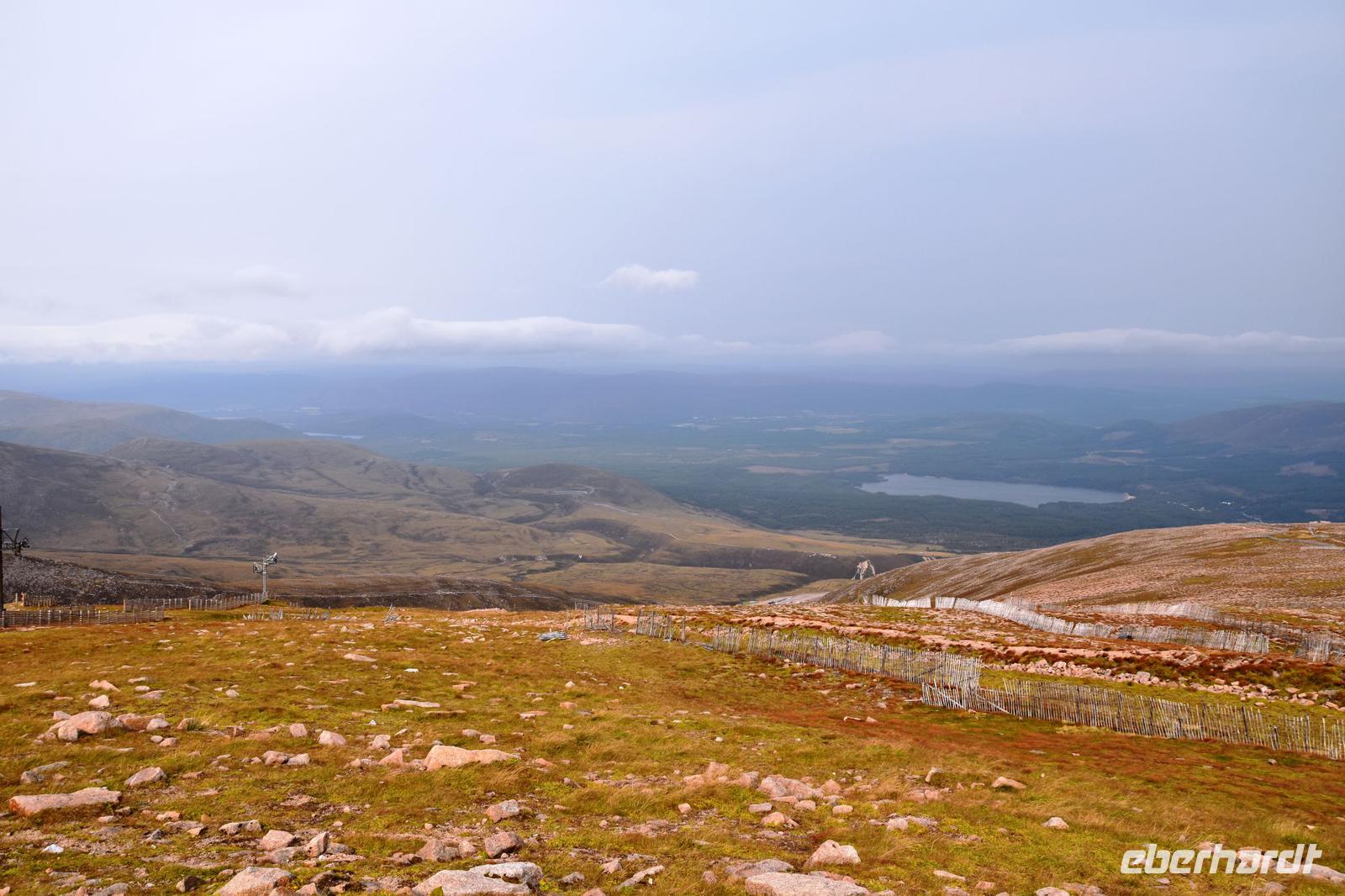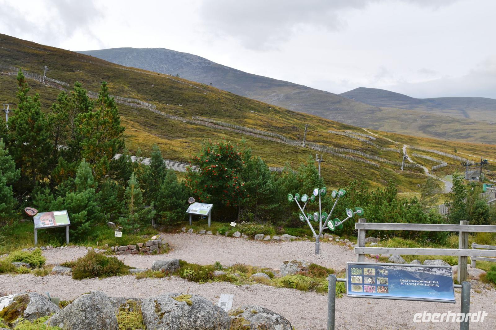 Zu Fahrtzeitbeginn, erreichen wir die Basisstation der Standseilbahn „Cairngorm Mountain Railway". Wir nutzen den ersten Wagen zur gemeinsamen Auffahrt auf der Top-Station, die knapp unter dem 1145 m hohen Cairn Gorm liegt. Dabei fährt die Bahn 40 km/h schnell und benötigt 9 Minuten für die 1,97 km lange Strecke. Sie wurde durch die Firma Doppelmayer im Dezember 2001 für das Skigebiet gebaut und ersetzte den windanfälligen Sessellift.