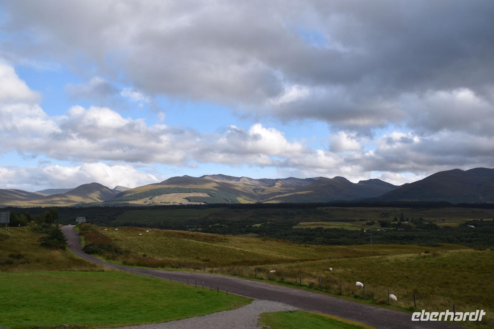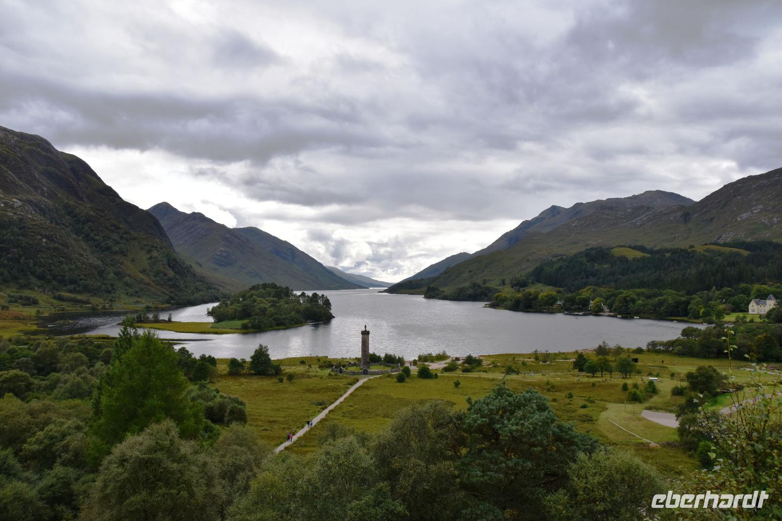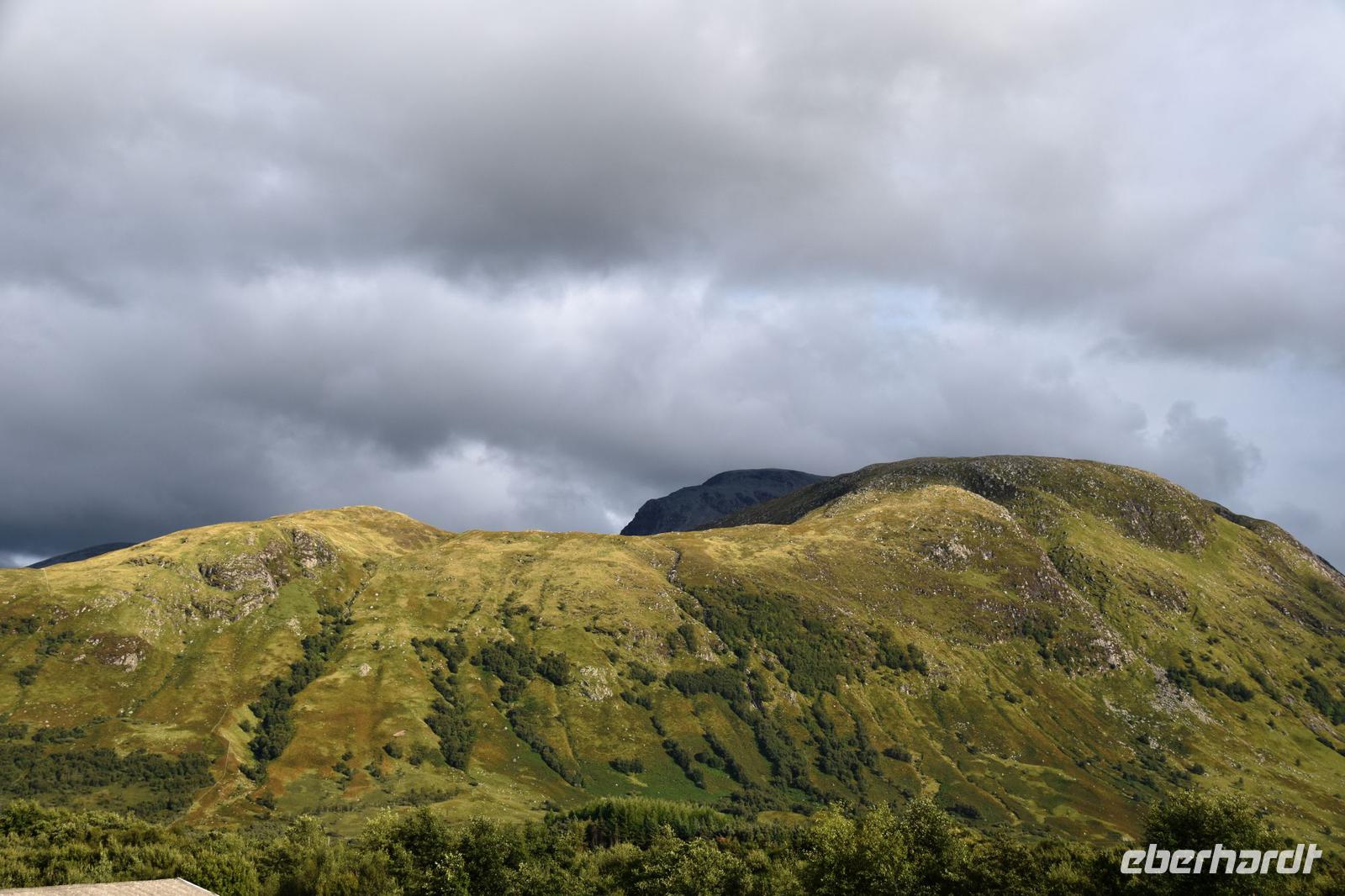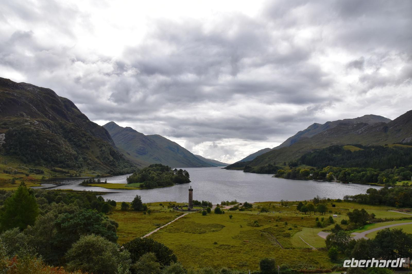 Weiter südlich, in Fort Augustus besichtigen wir die Schleusentreppen des Kaledonischen Kanals, bevor es an zwei weiteren Seen entlang geht. Am Commando Memorial, oberhalb der Spean Bridge, stoppen wir nochmals, um einen Blick auf das Ben Nevis Massiv zu haben. Leider verbirgt sich der Gipfel in den Wolken.
