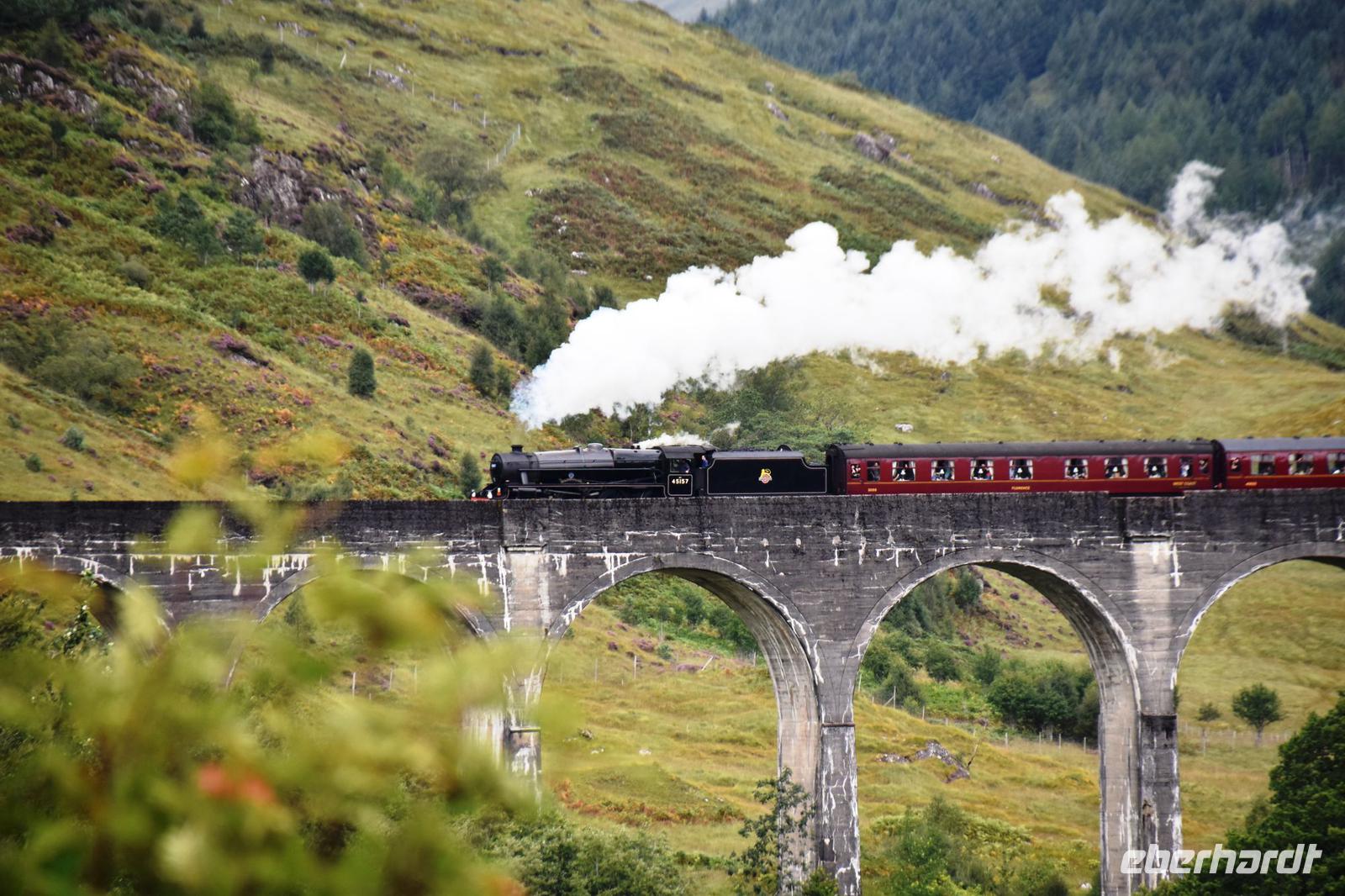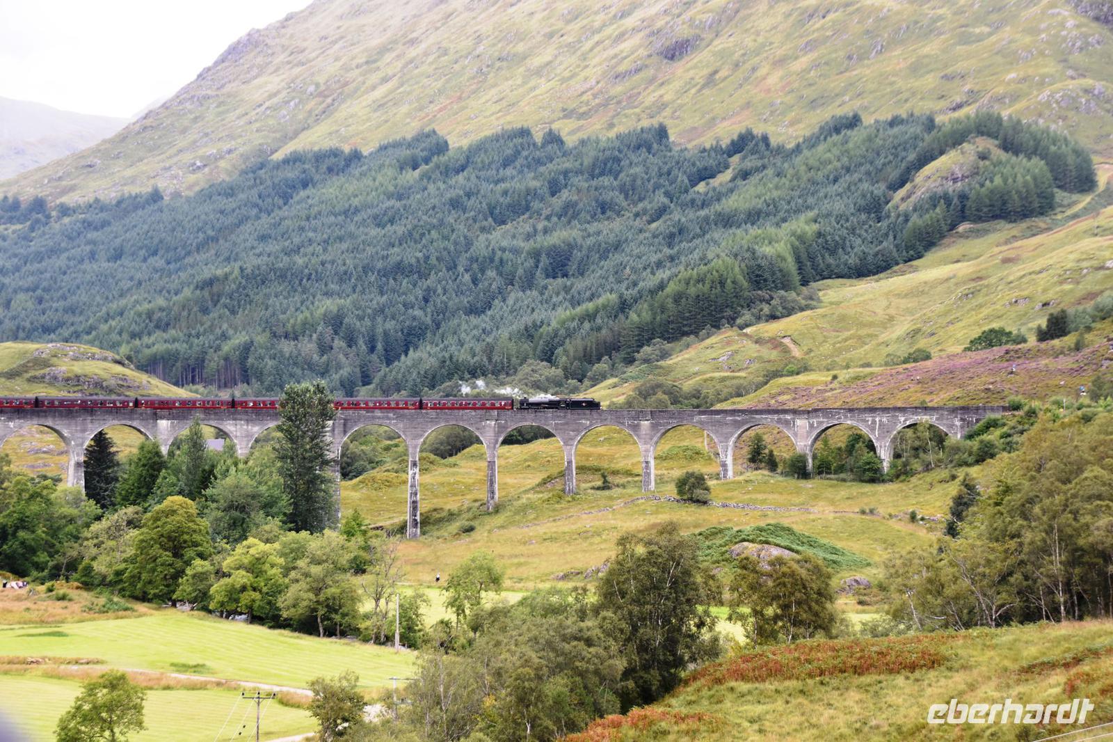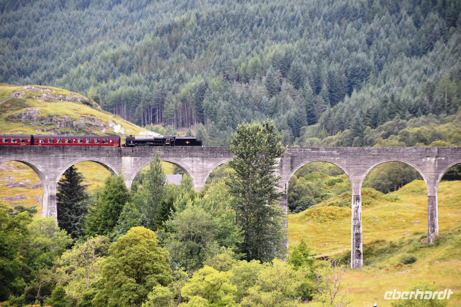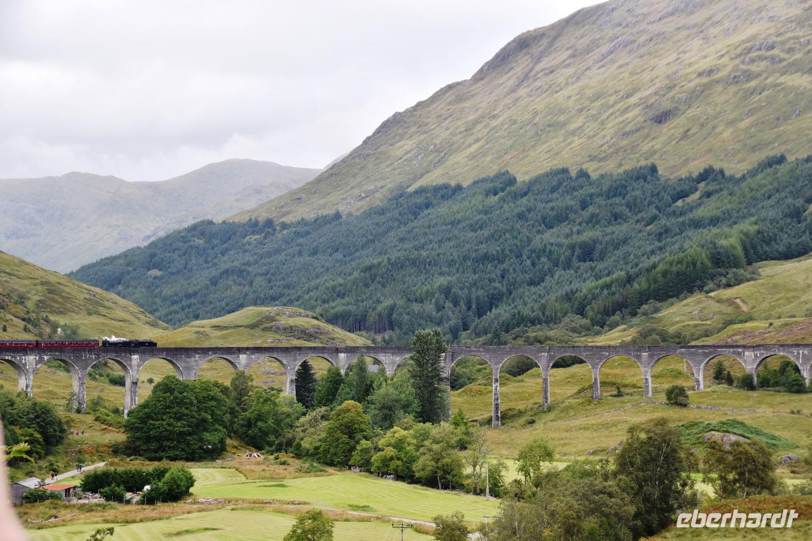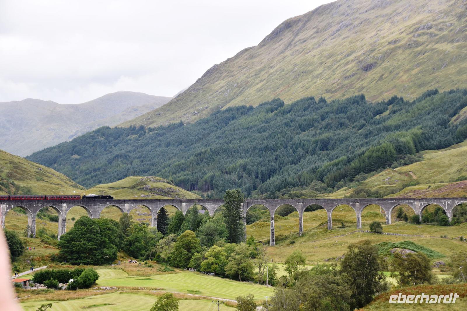 Am frühen Nachmittag treffen sich alle wieder am Bus, von dessen Parkplatz wir die Hebrideninseln Eigg, Rum und Skye alle schön sehen. Bei der Rückfahrt stoppen wir am Loch Uamh, an Prince Charlies Cairn. Rechtzeitig kommen wir dann am Glenfinnian Viaduct und dem Glenfinnian Memorial an, klettern auf den Aussichtshügel und machen die Kameras scharf. 15:20 Uhr kommt ein dampflokbespannter Gegenzug aus Fort William über den Viaduct und danach fährt unser Zug auf seiner Rückfahrt wieder über die Brücke.