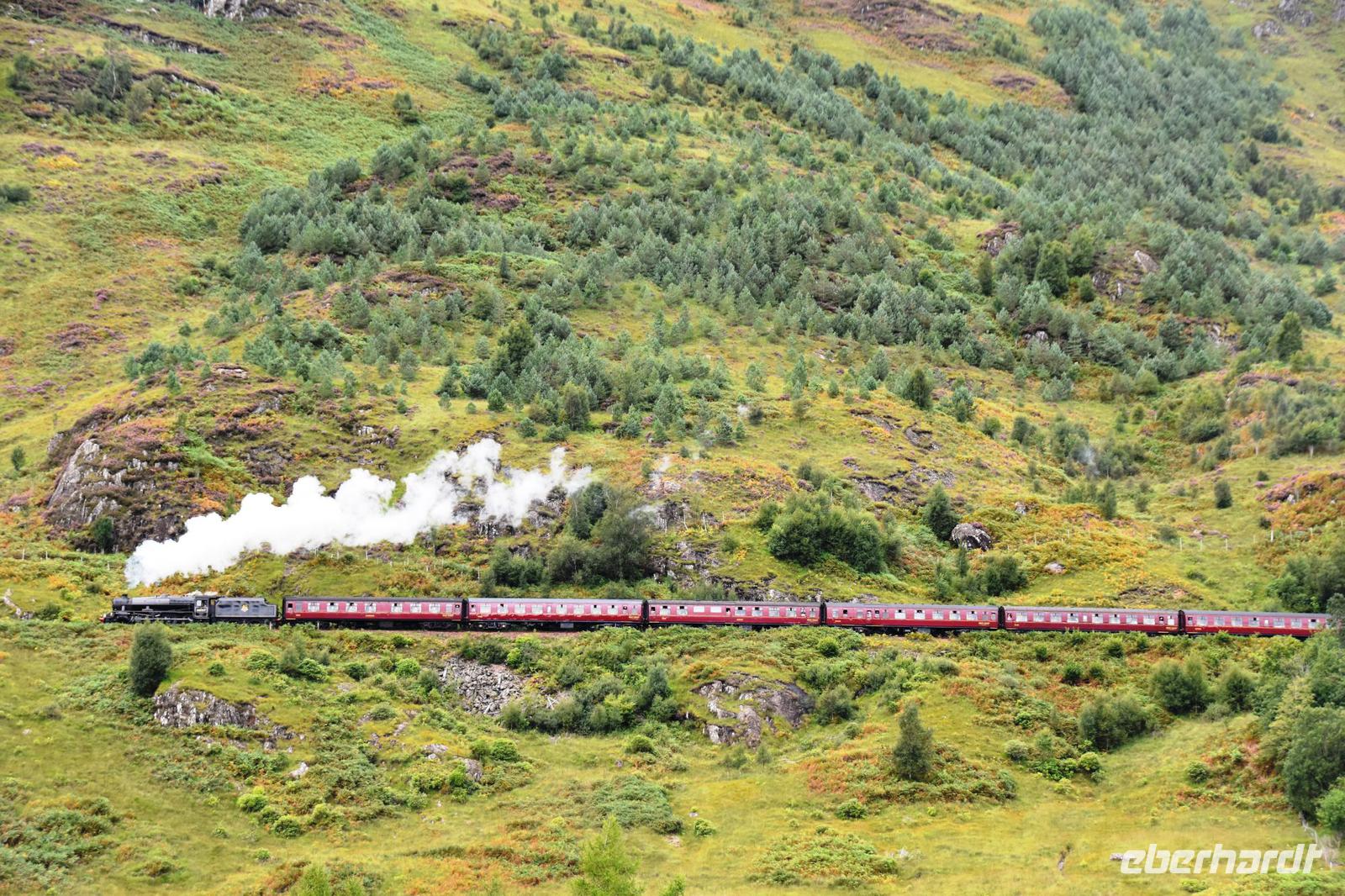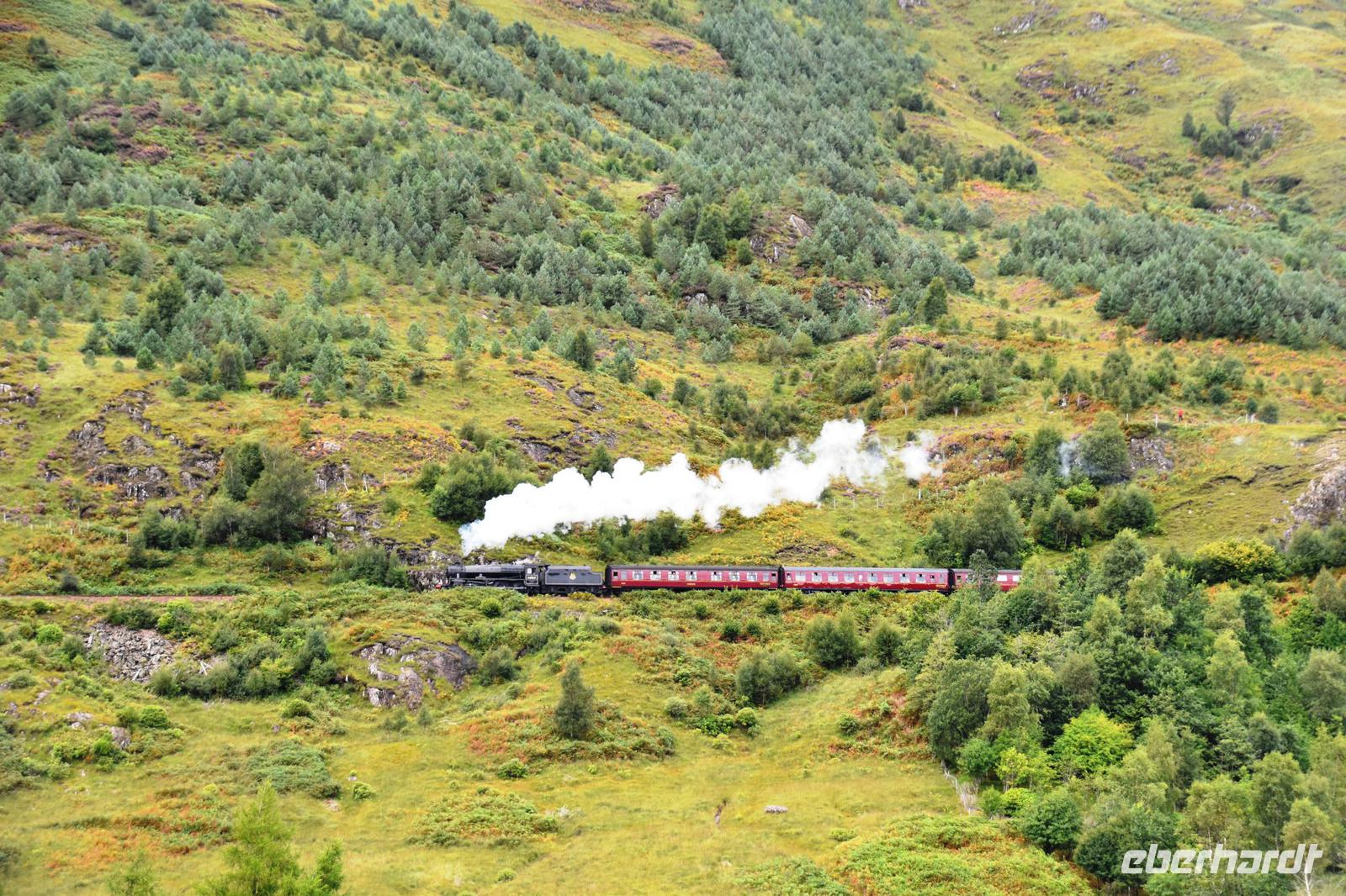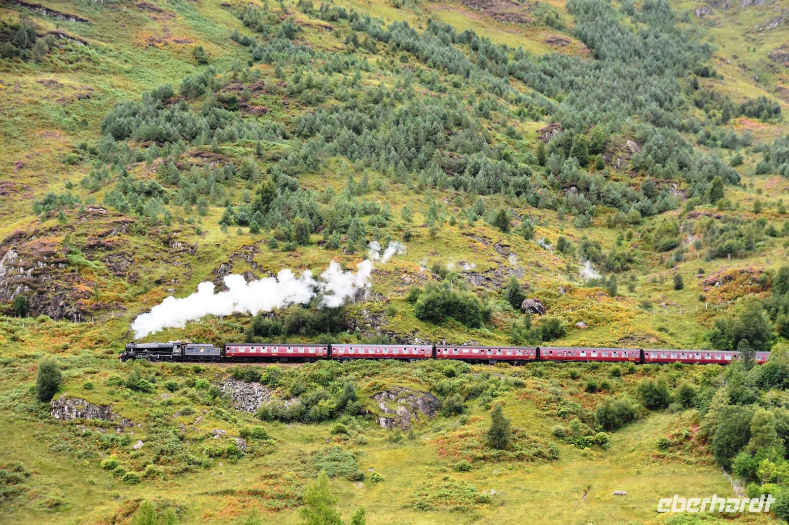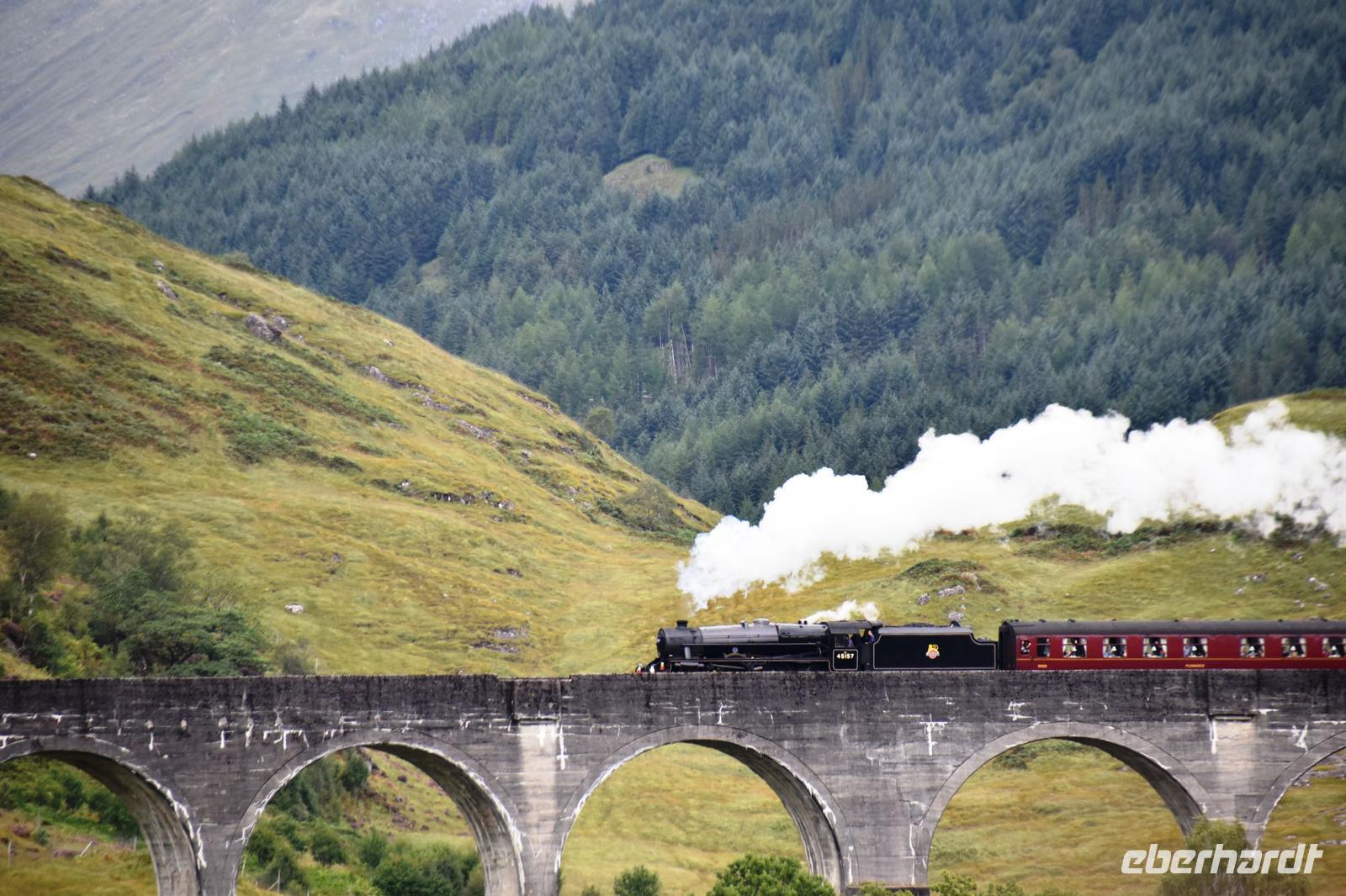 Am frühen Nachmittag treffen sich alle wieder am Bus, von dessen Parkplatz wir die Hebrideninseln Eigg, Rum und Skye alle schön sehen. Bei der Rückfahrt stoppen wir am Loch Uamh, an Prince Charlies Cairn. Rechtzeitig kommen wir dann am Glenfinnian Viaduct und dem Glenfinnian Memorial an, klettern auf den Aussichtshügel und machen die Kameras scharf. 15:20 Uhr kommt ein dampflokbespannter Gegenzug aus Fort William über den Viaduct und danach fährt unser Zug auf seiner Rückfahrt wieder über die Brücke.