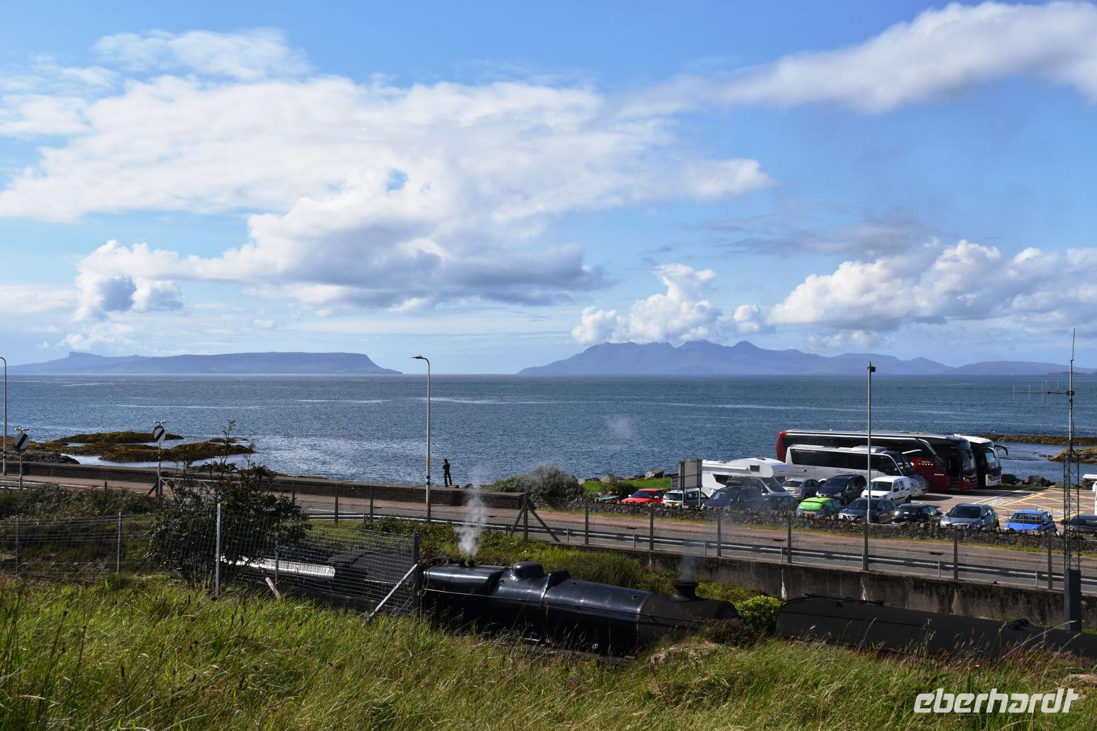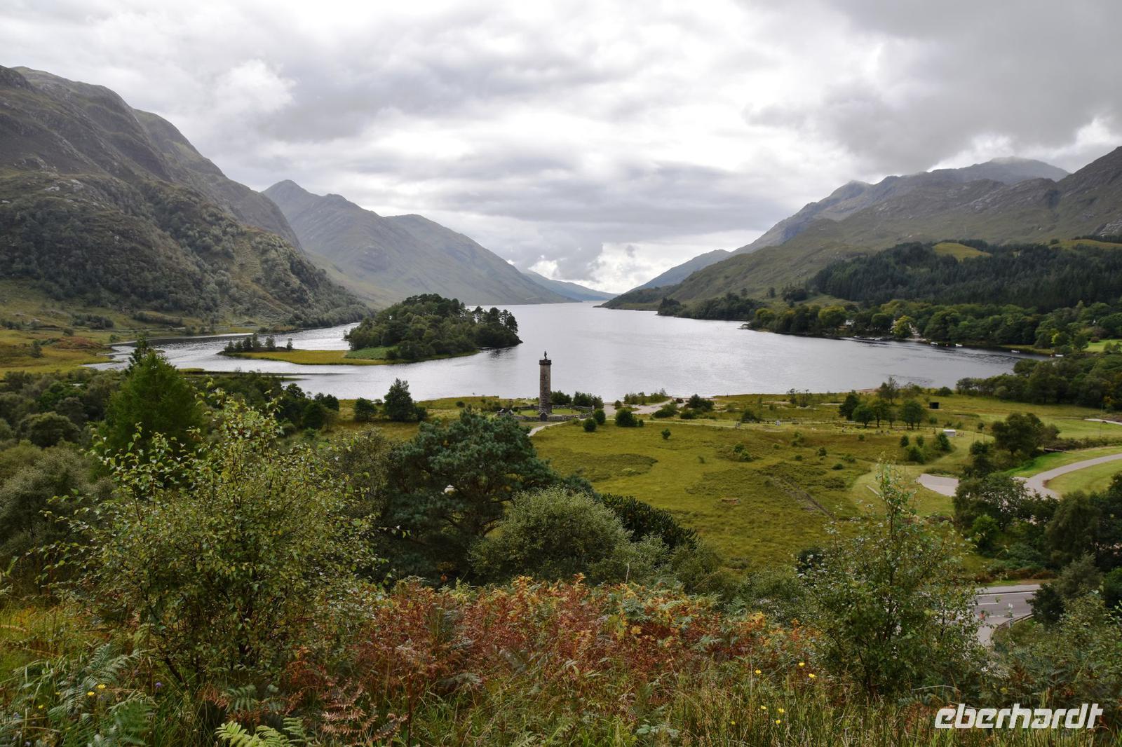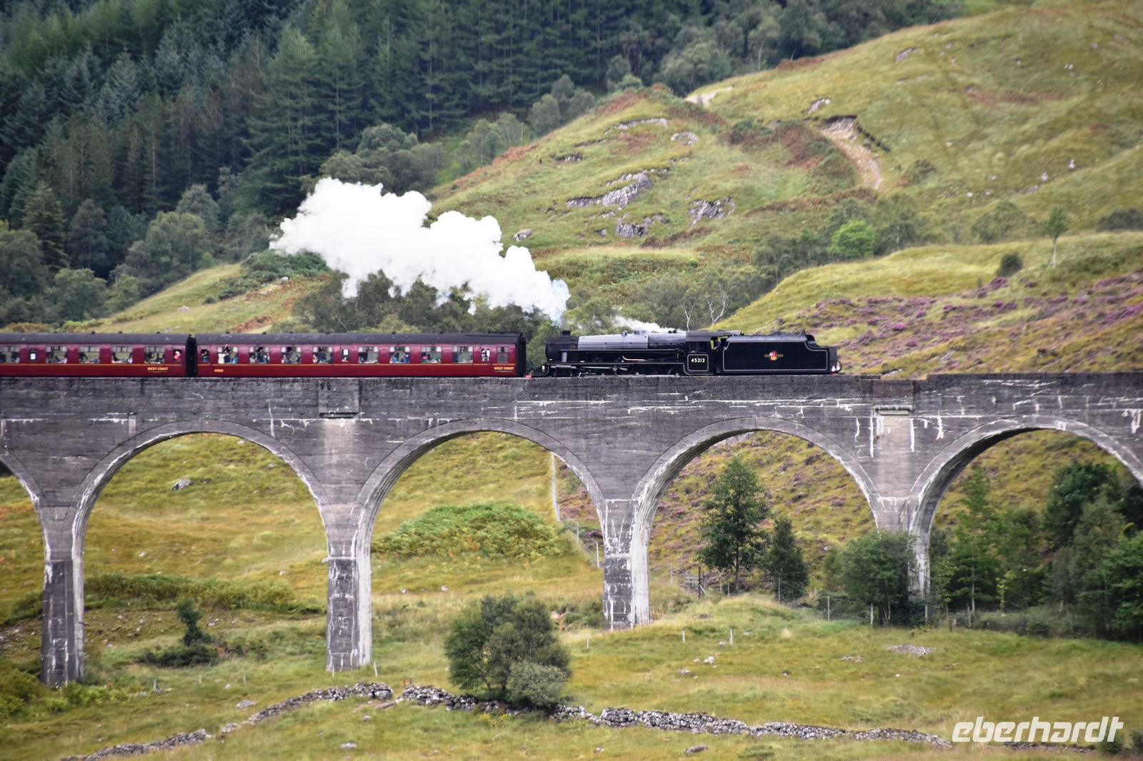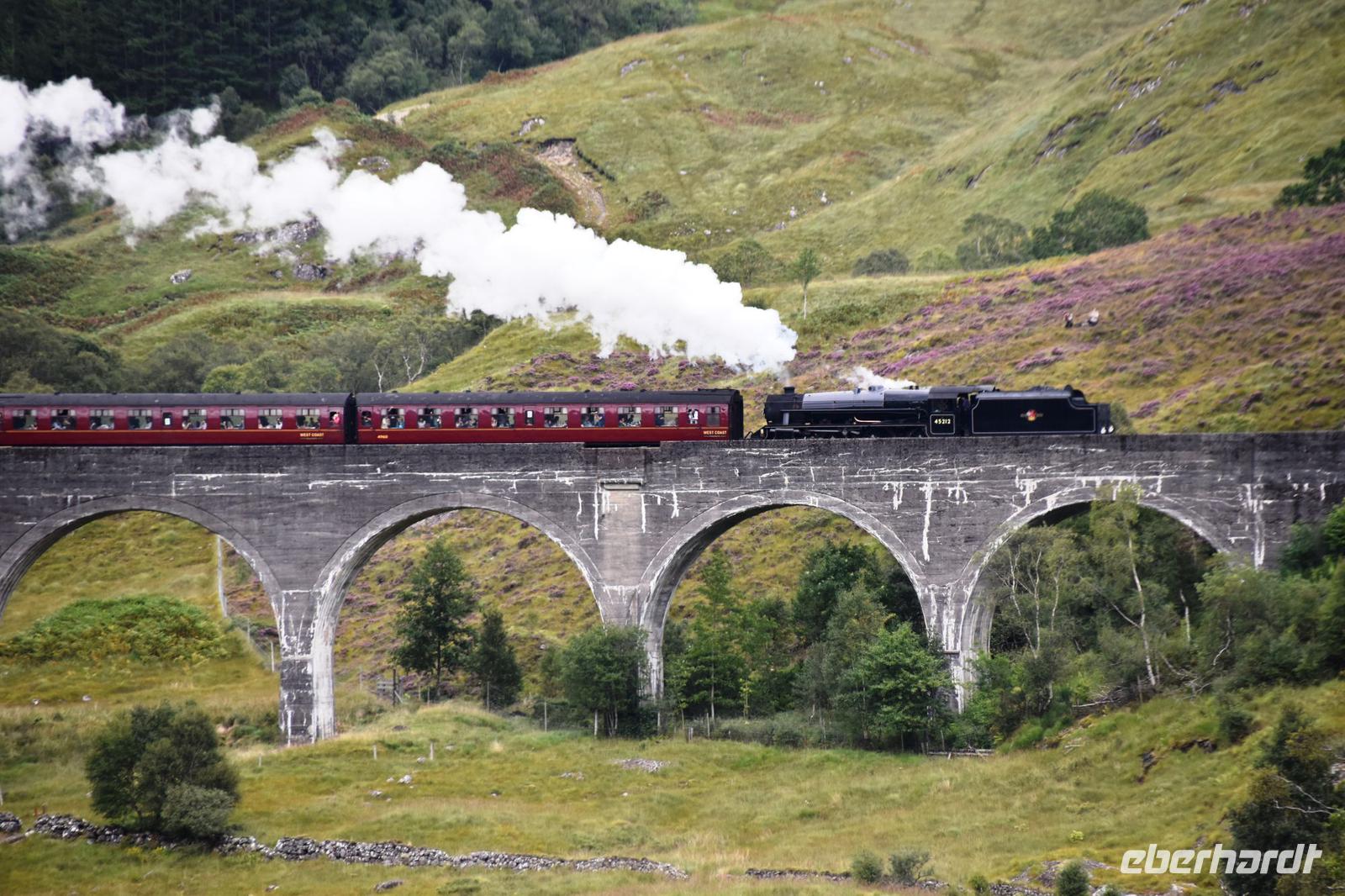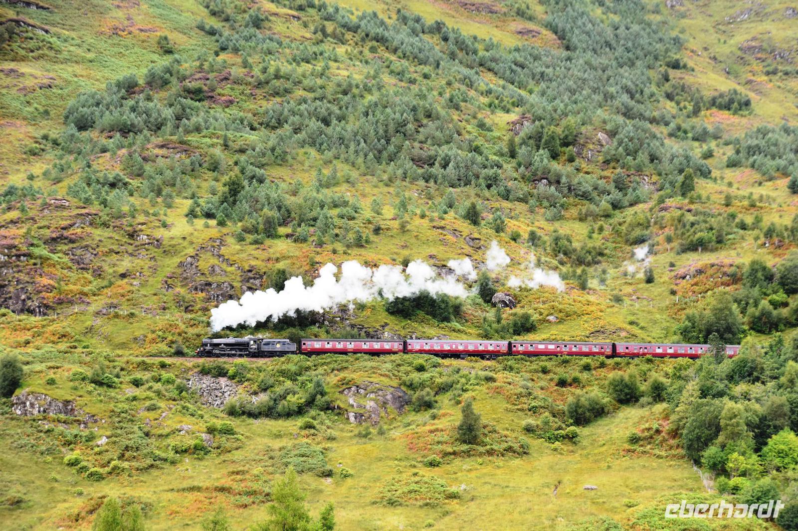 Am frühen Nachmittag treffen sich alle wieder am Bus, von dessen Parkplatz wir die Hebrideninseln Eigg, Rum und Skye alle schön sehen. Bei der Rückfahrt stoppen wir am Loch Uamh, an Prince Charlies Cairn. Rechtzeitig kommen wir dann am Glenfinnian Viaduct und dem Glenfinnian Memorial an, klettern auf den Aussichtshügel und machen die Kameras scharf. 15:20 Uhr kommt ein dampflokbespannter Gegenzug aus Fort William über den Viaduct und danach fährt unser Zug auf seiner Rückfahrt wieder über die Brücke.