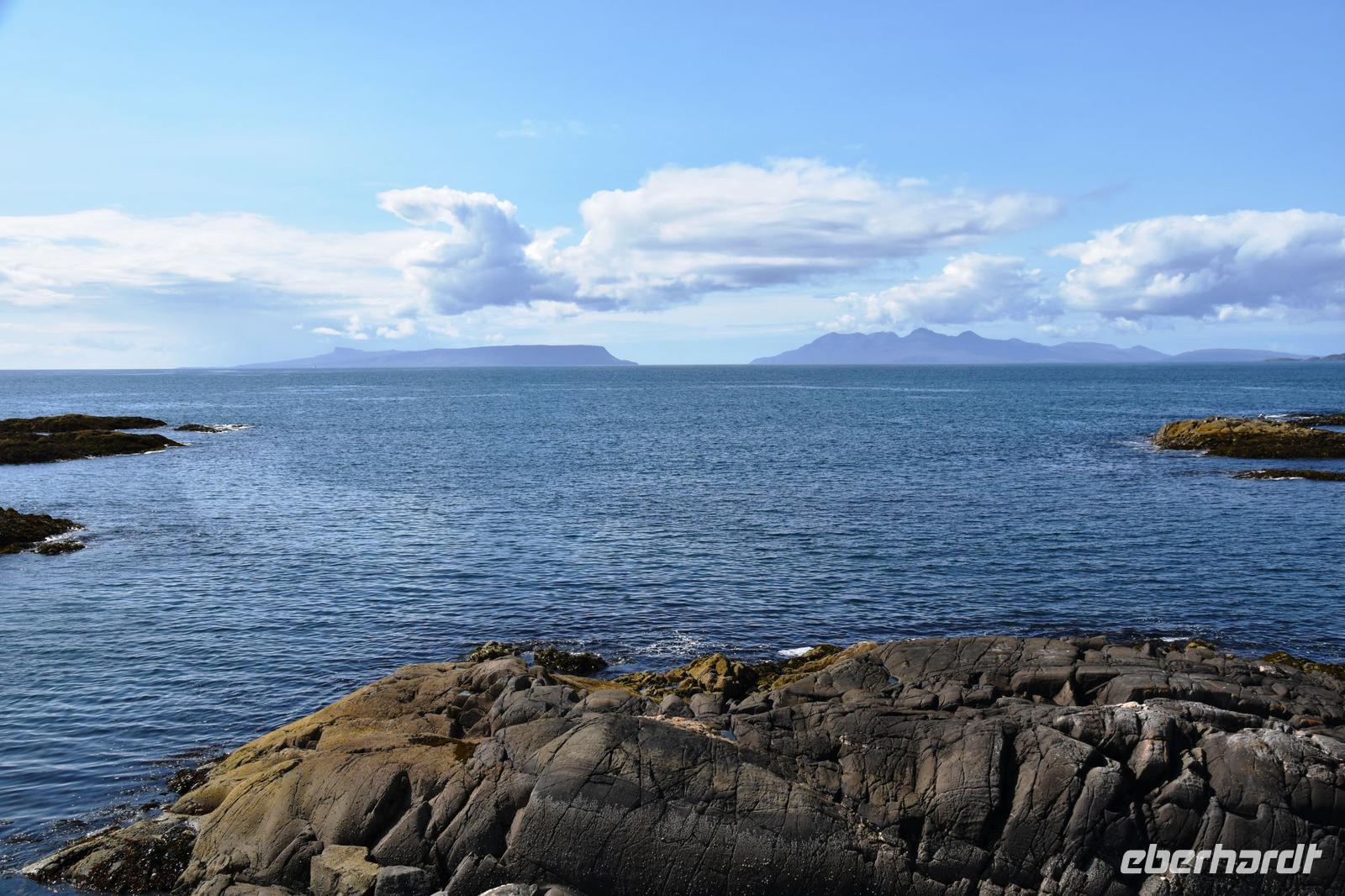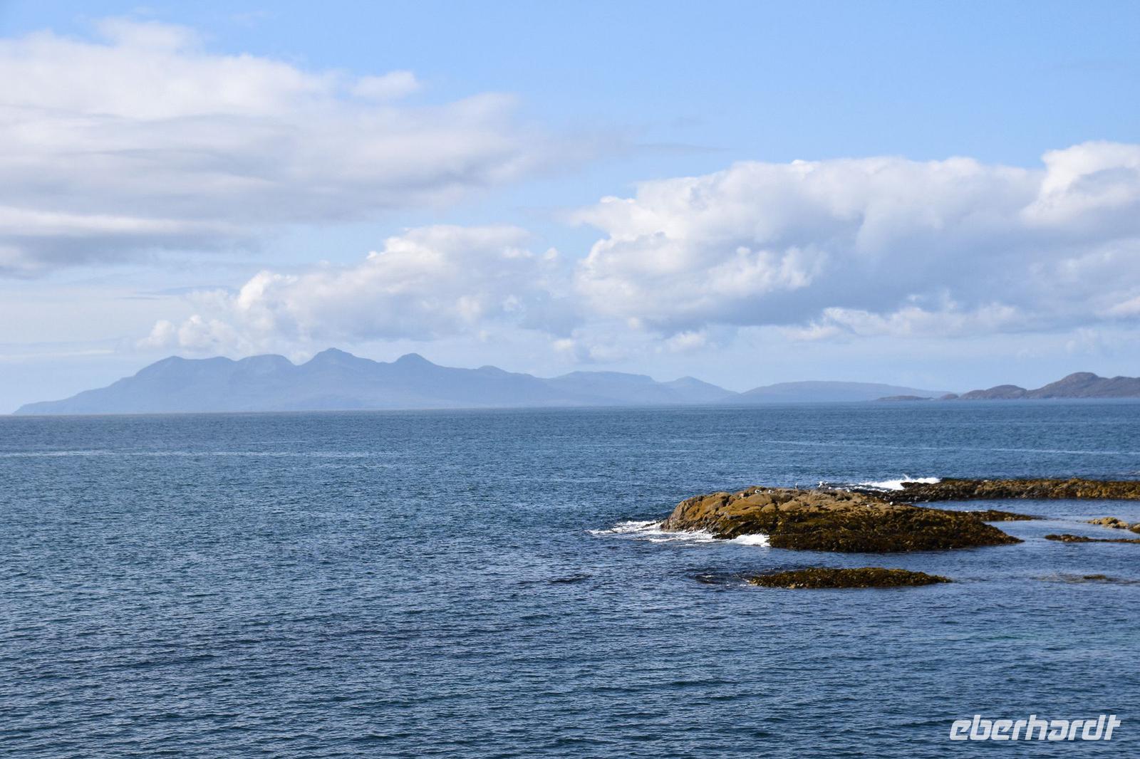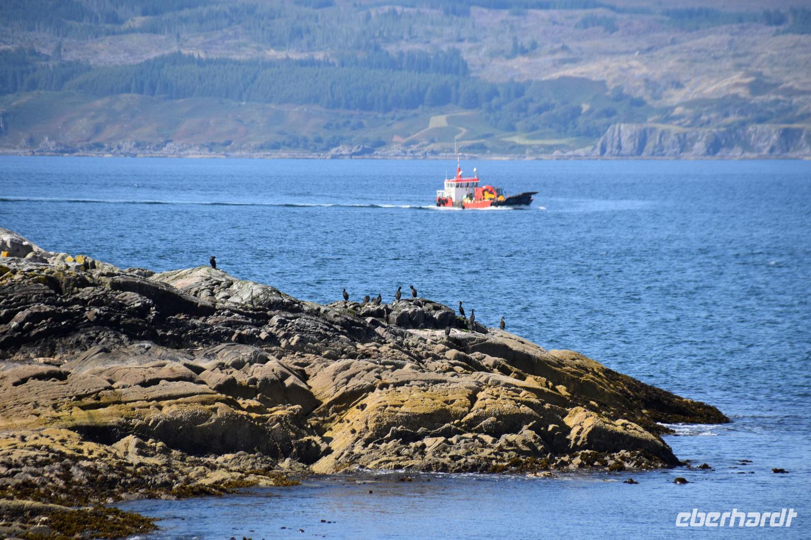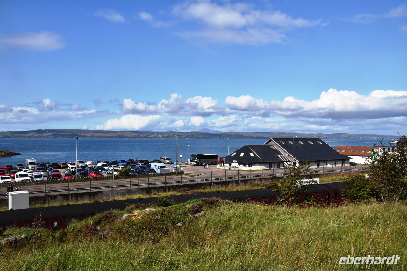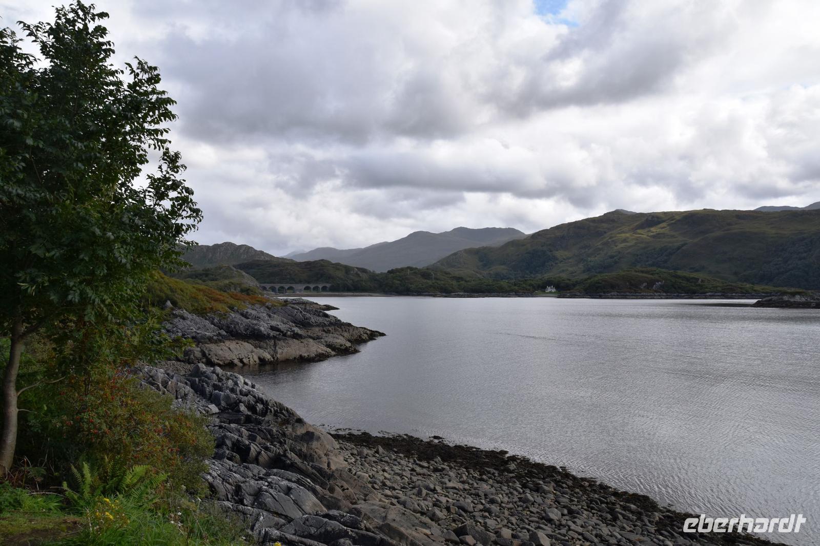 Am frühen Nachmittag treffen sich alle wieder am Bus, von dessen Parkplatz wir die Hebrideninseln Eigg, Rum und Skye alle schön sehen. Bei der Rückfahrt stoppen wir am Loch Uamh, an Prince Charlies Cairn. Rechtzeitig kommen wir dann am Glenfinnian Viaduct und dem Glenfinnian Memorial an, klettern auf den Aussichtshügel und machen die Kameras scharf. 15:20 Uhr kommt ein dampflokbespannter Gegenzug aus Fort William über den Viaduct und danach fährt unser Zug auf seiner Rückfahrt wieder über die Brücke.