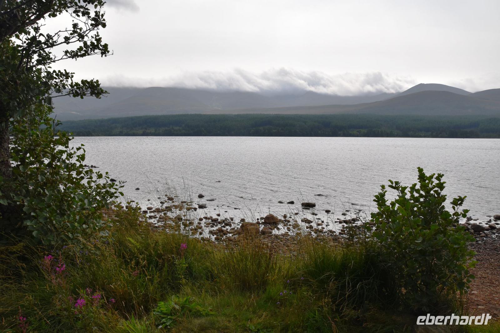 Wieder im Tal machen wir am Loch Morlich, wo sich die Berge im dunklen Wasser des Sees spiegeln, einen Fotostopp.