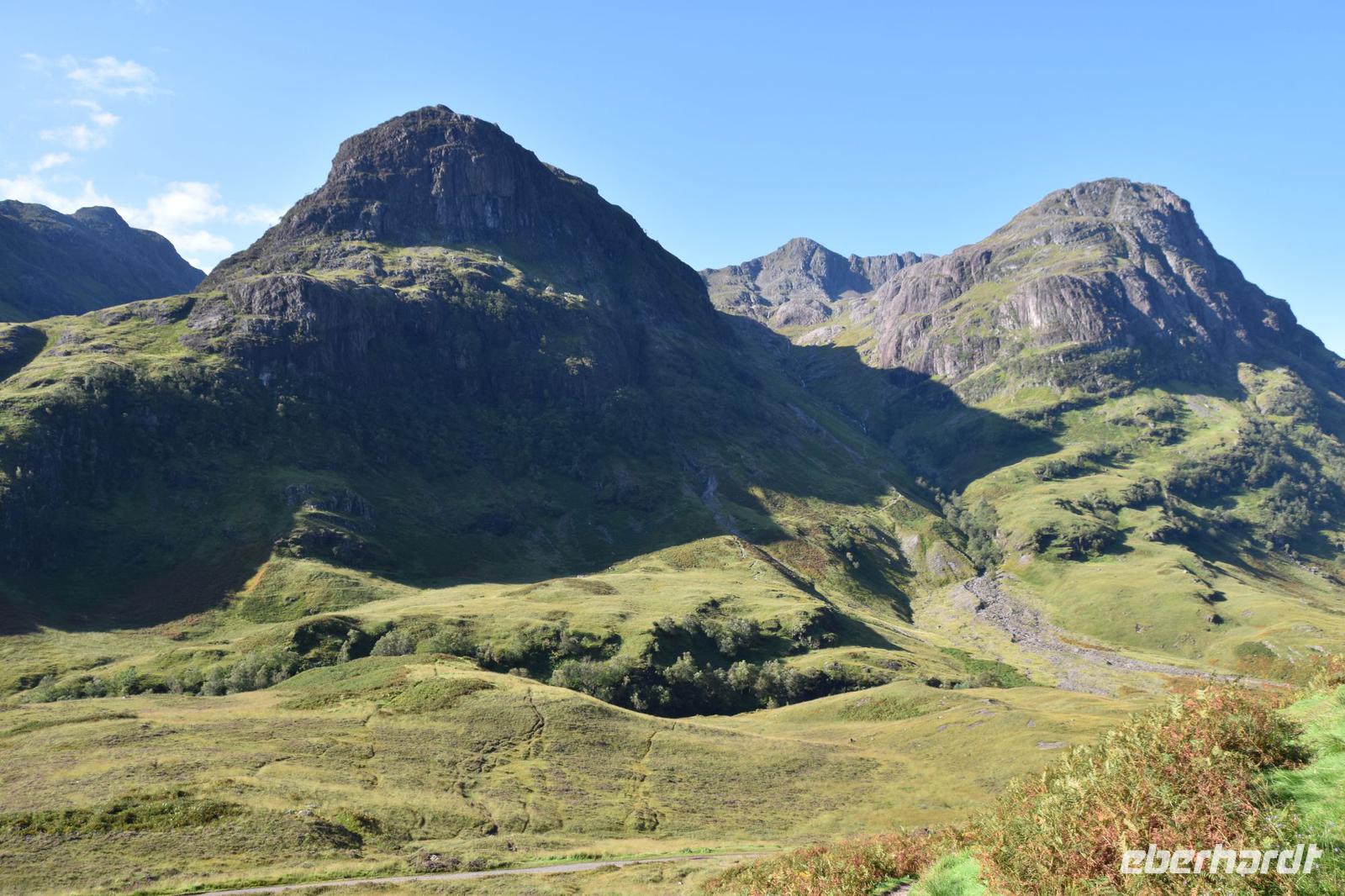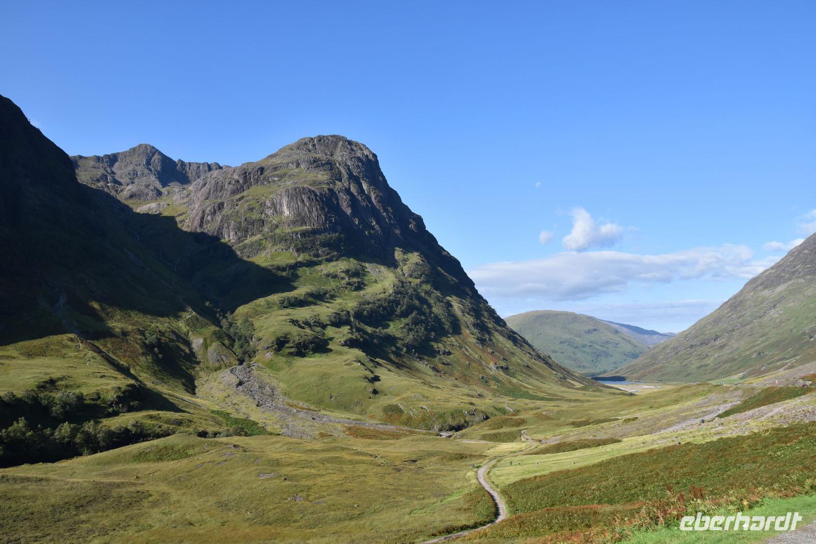 Bei wieder herrlichem Wetter beginnt unsere heutige und abschließende Landschaftsfahrt durch die Highlands. Zuerst fahren wir am Loch Linneh entlang nach Süden und biegen dann nach der Brücke ins Glencoe ab.