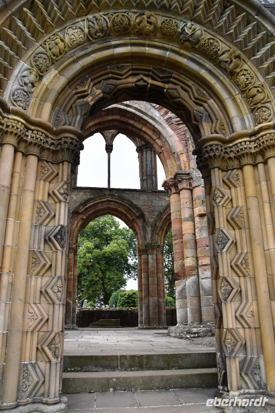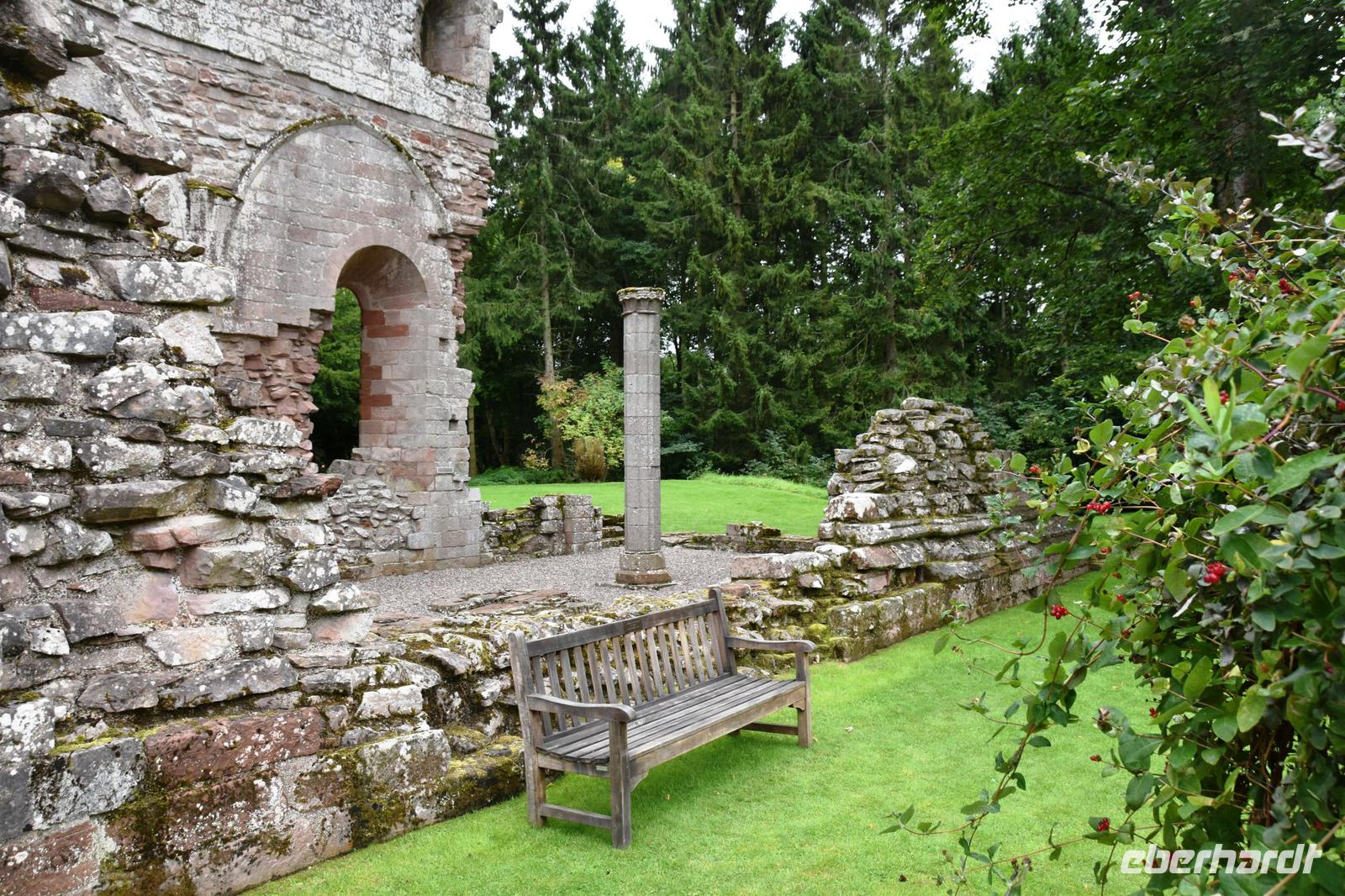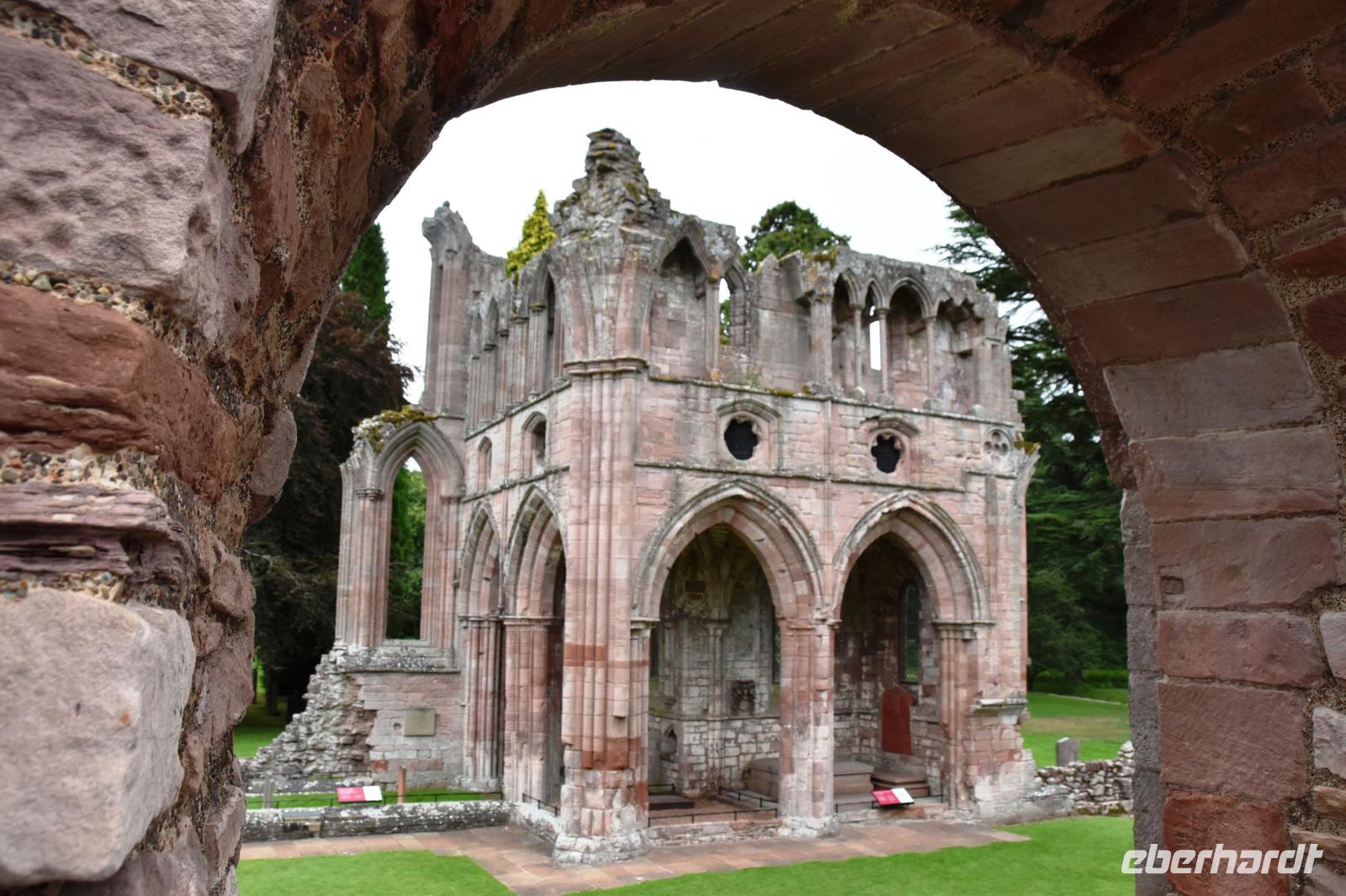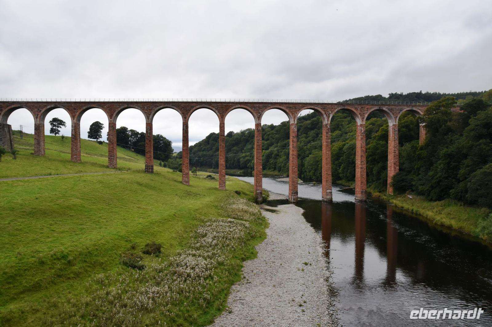 Vorbei an Melrose fahren wir durch das romantische Tal de Tweed nach Dryburgh, machen einen Fotostopp am Leaderfoot Viadukt von 1865, der auch Drygrange Railway Viaduct genannt wird. Dann fahren wir hinauf zum Aussichtspunkt Scotts View und von hier weiter zur Dryburgh Abbey, wo sich Sir Walter Scotts Grab befindet. Der Baumbestand mit Zedern und Mammutbäumen im Park ist faszinierend. Kurze Zeit später statten wir noch der Jedburgh Abbey einen Besuch ab. An der schottischen-englischen Grenze spielt ein Piper für uns.