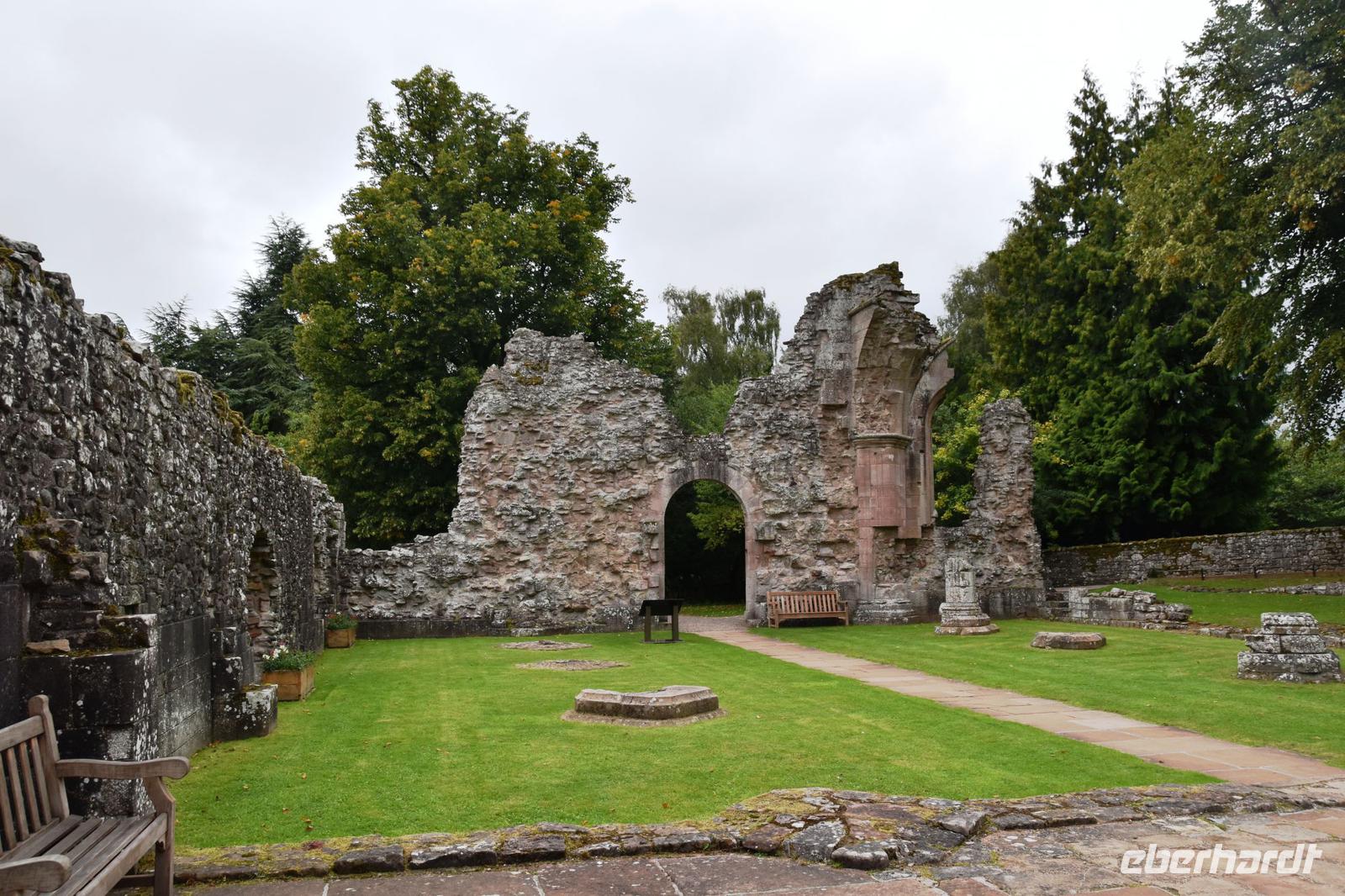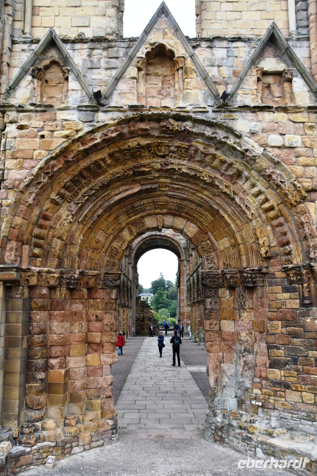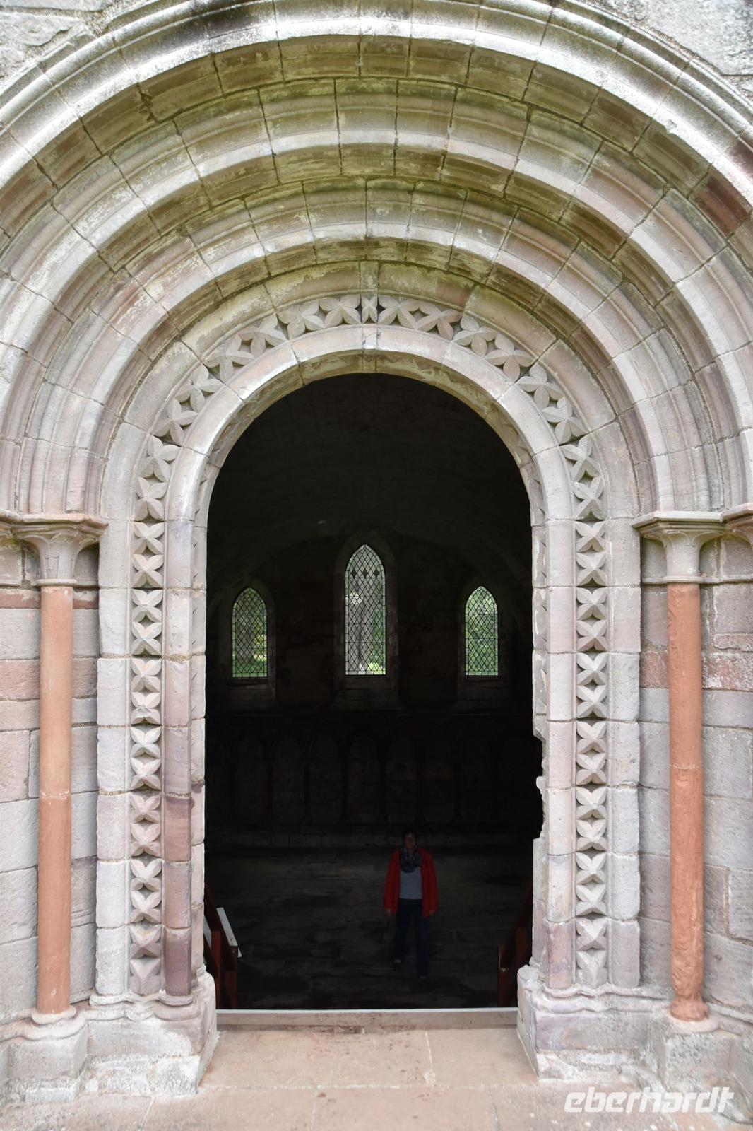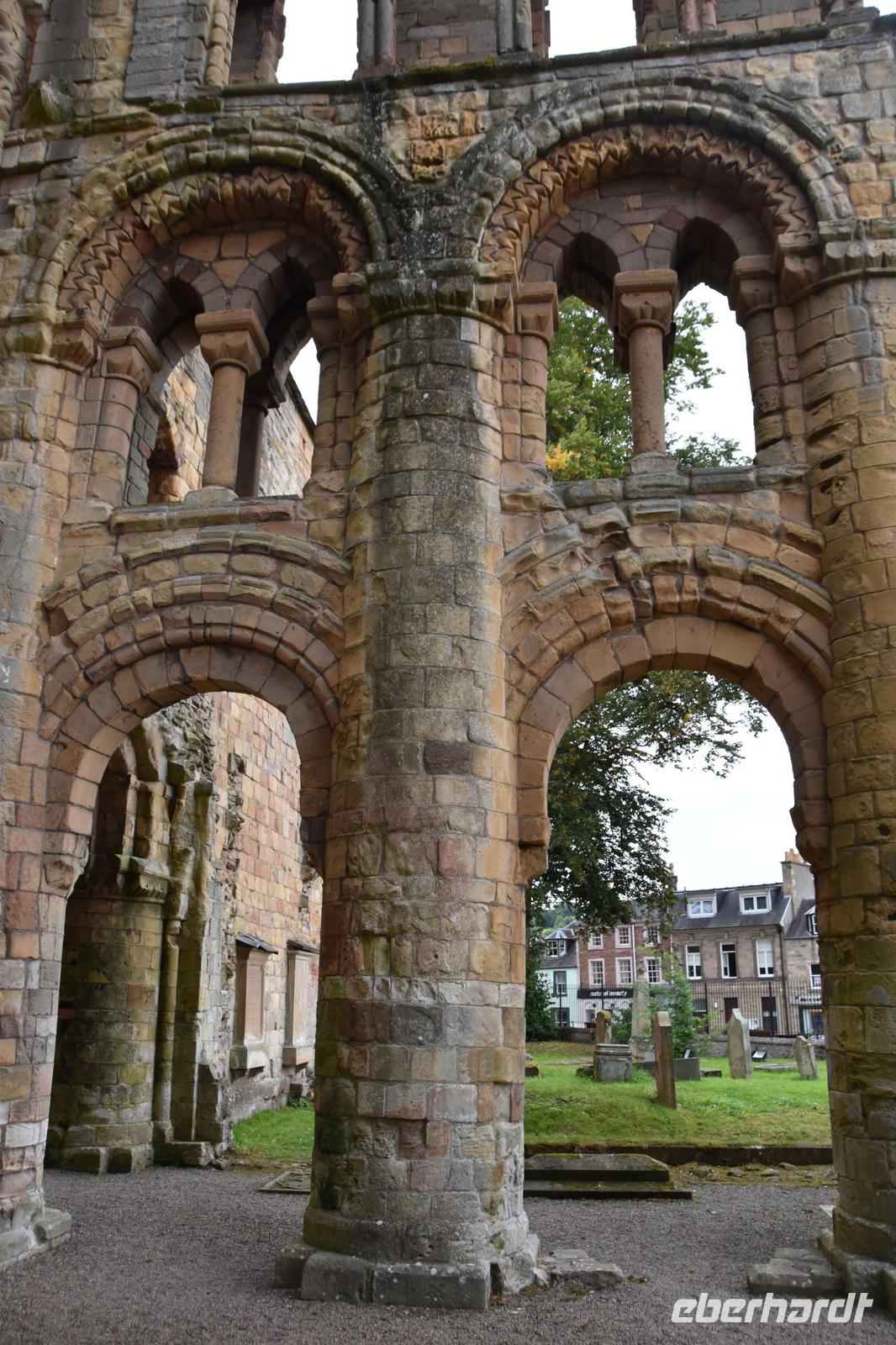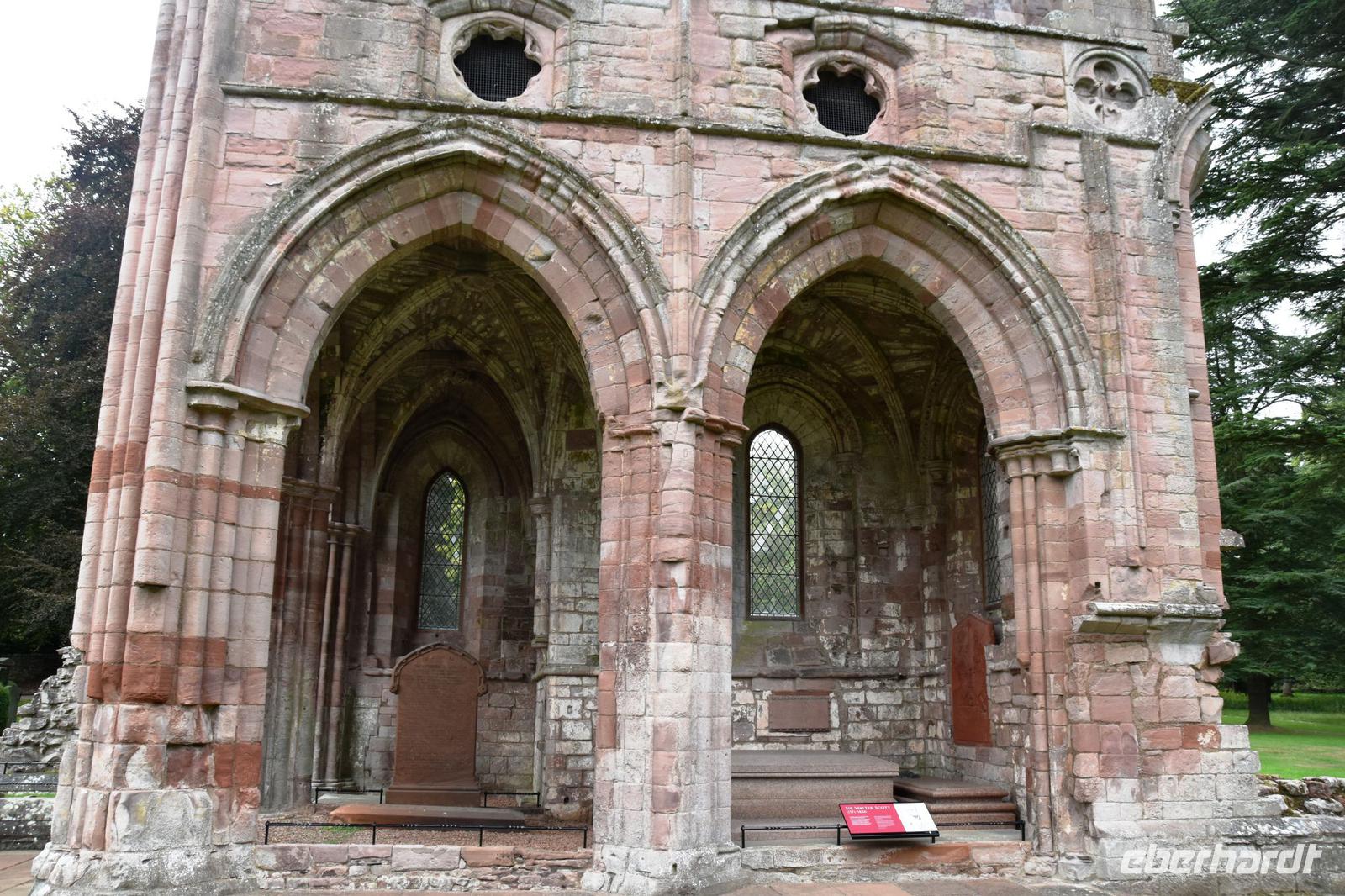 Vorbei an Melrose fahren wir durch das romantische Tal de Tweed nach Dryburgh, machen einen Fotostopp am Leaderfoot Viadukt von 1865, der auch Drygrange Railway Viaduct genannt wird. Dann fahren wir hinauf zum Aussichtspunkt Scotts View und von hier weiter zur Dryburgh Abbey, wo sich Sir Walter Scotts Grab befindet. Der Baumbestand mit Zedern und Mammutbäumen im Park ist faszinierend. Kurze Zeit später statten wir noch der Jedburgh Abbey einen Besuch ab. An der schottischen-englischen Grenze spielt ein Piper für uns.