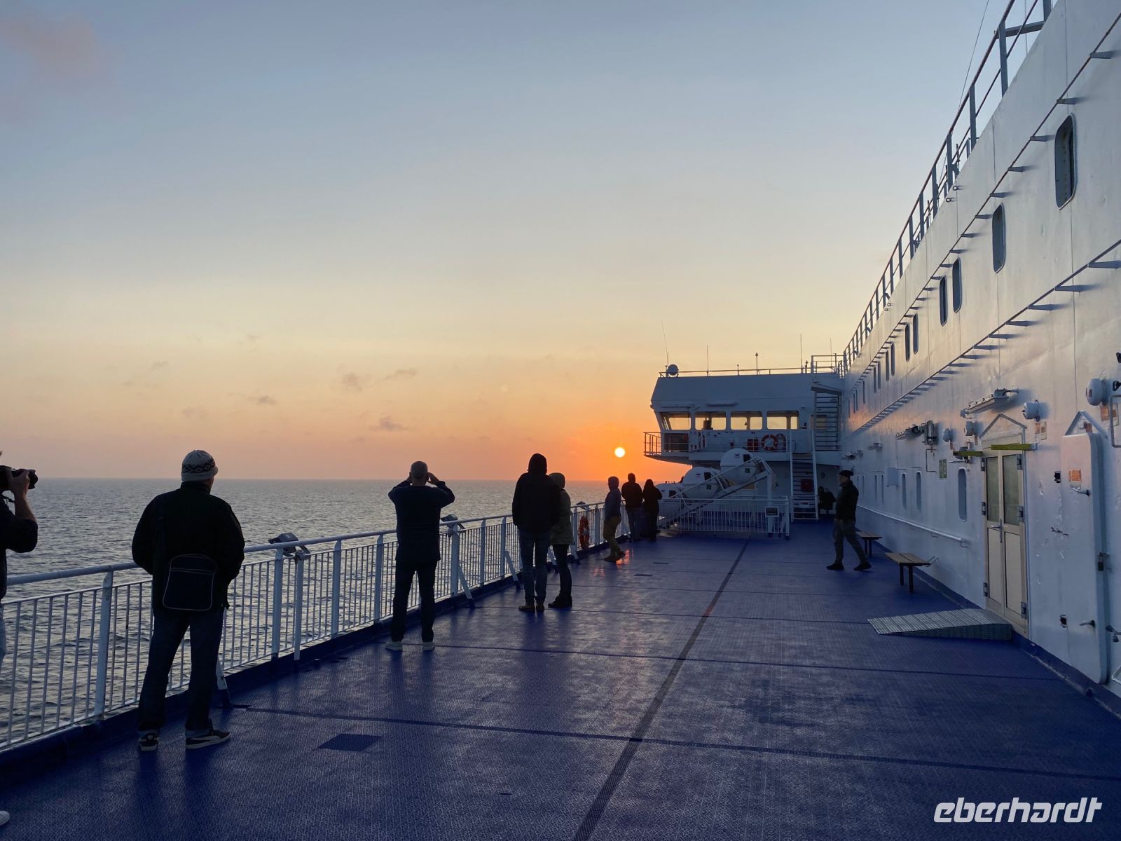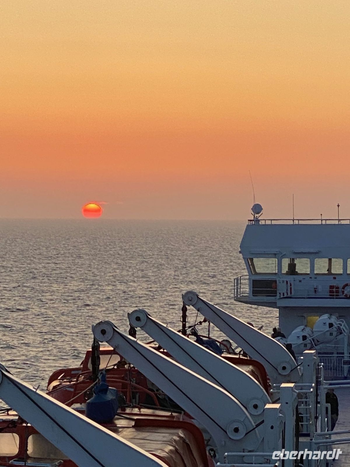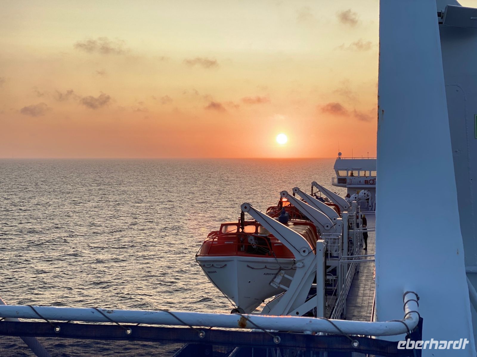 Unsere Gruppe an Bord schrumpft nun auf 13, kein schlechtes Omen allerdings, unsere Reise beginnt bei traumhaftem Wetter. Nachdem alle ihre Kabinen bezogen haben, treffen wir uns auch ohne Verabredung in der Sky Bar am obersten Deck. Später dann mit Verabredung zum Abendessen beim eindrucksvollen Bordbuffet. Der Tag endet mit einem wunderschönen Sonnenuntergang auf offener See. Zufrieden und voll Vorfreude können wir uns vom langen Anreisetag in gemütlichen Kabinen erholen.