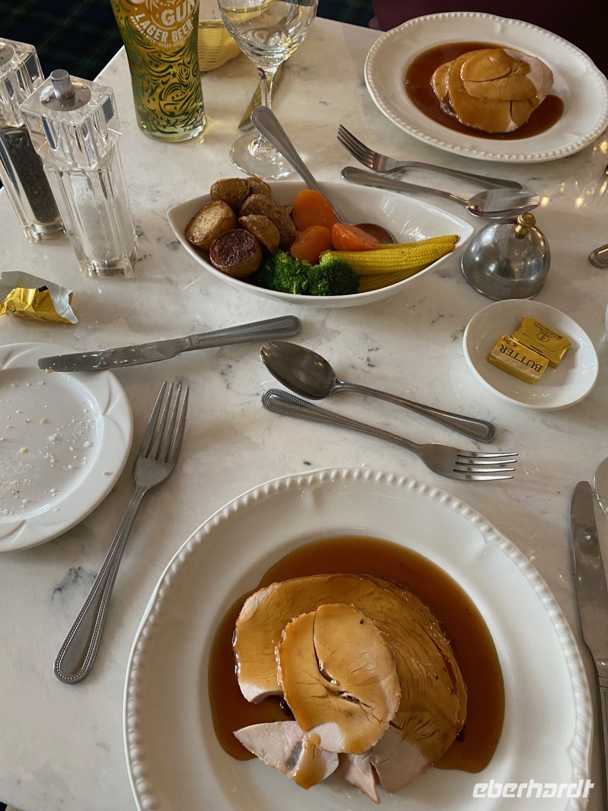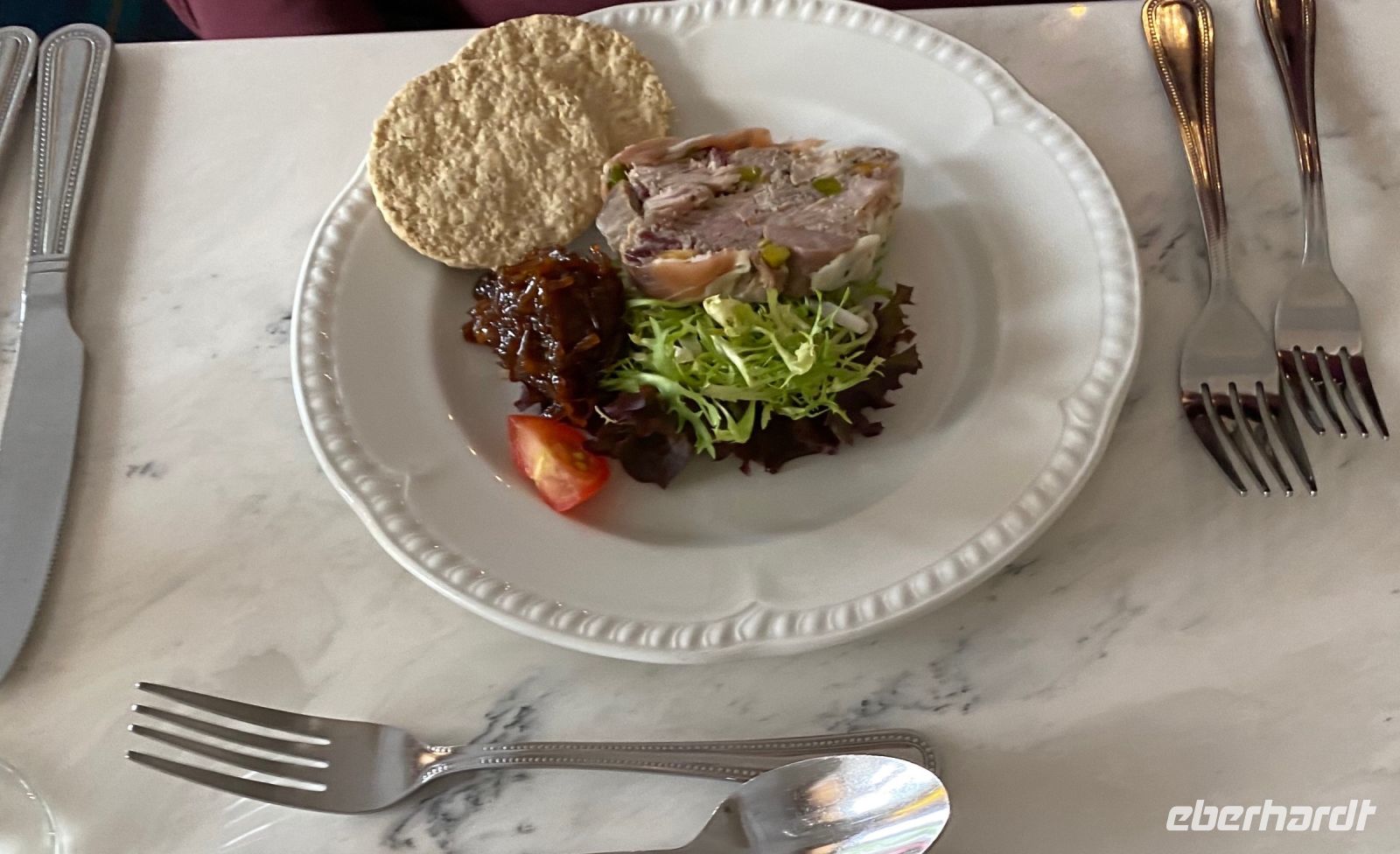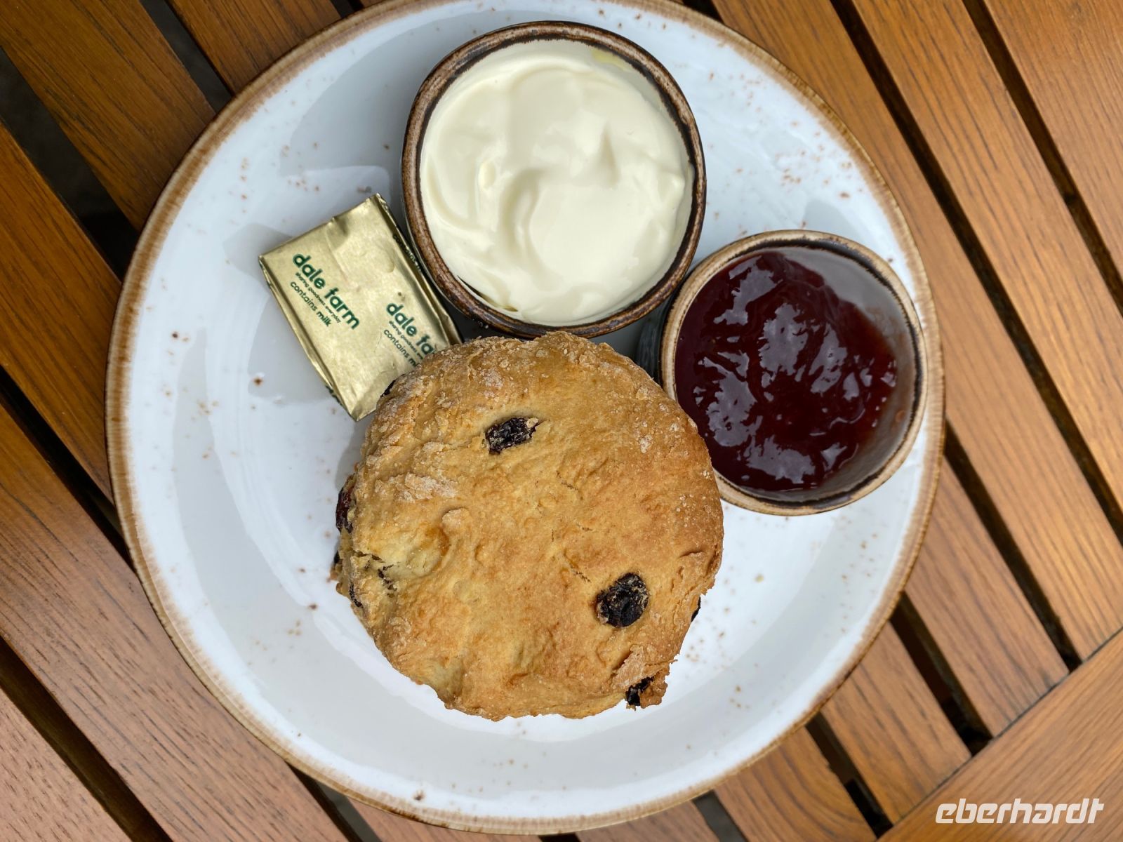 Das Frühstück an Bord vereint ganz Europa. Käse aus Holland, Müesli, Kaffee, Croissants und vieles mehr werden aufgefahren. Die ersten britischen Marmeladen, Pilze, Speck und Bohnen am Buffet stimmen uns aber schon auf die Reise nach Schottland ein.