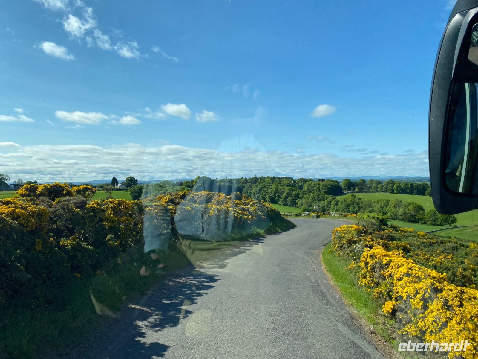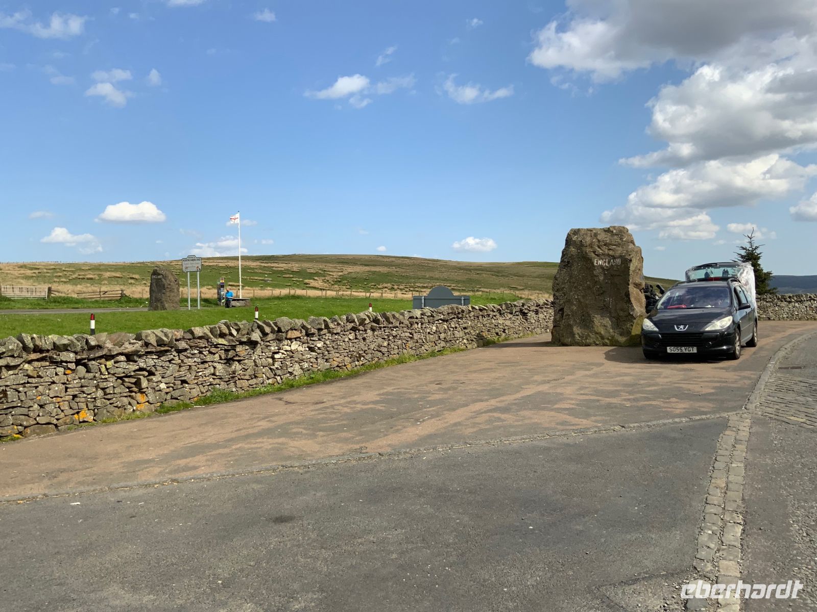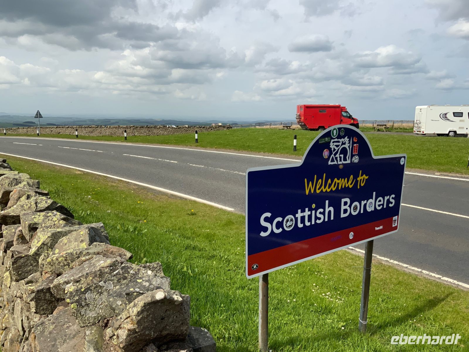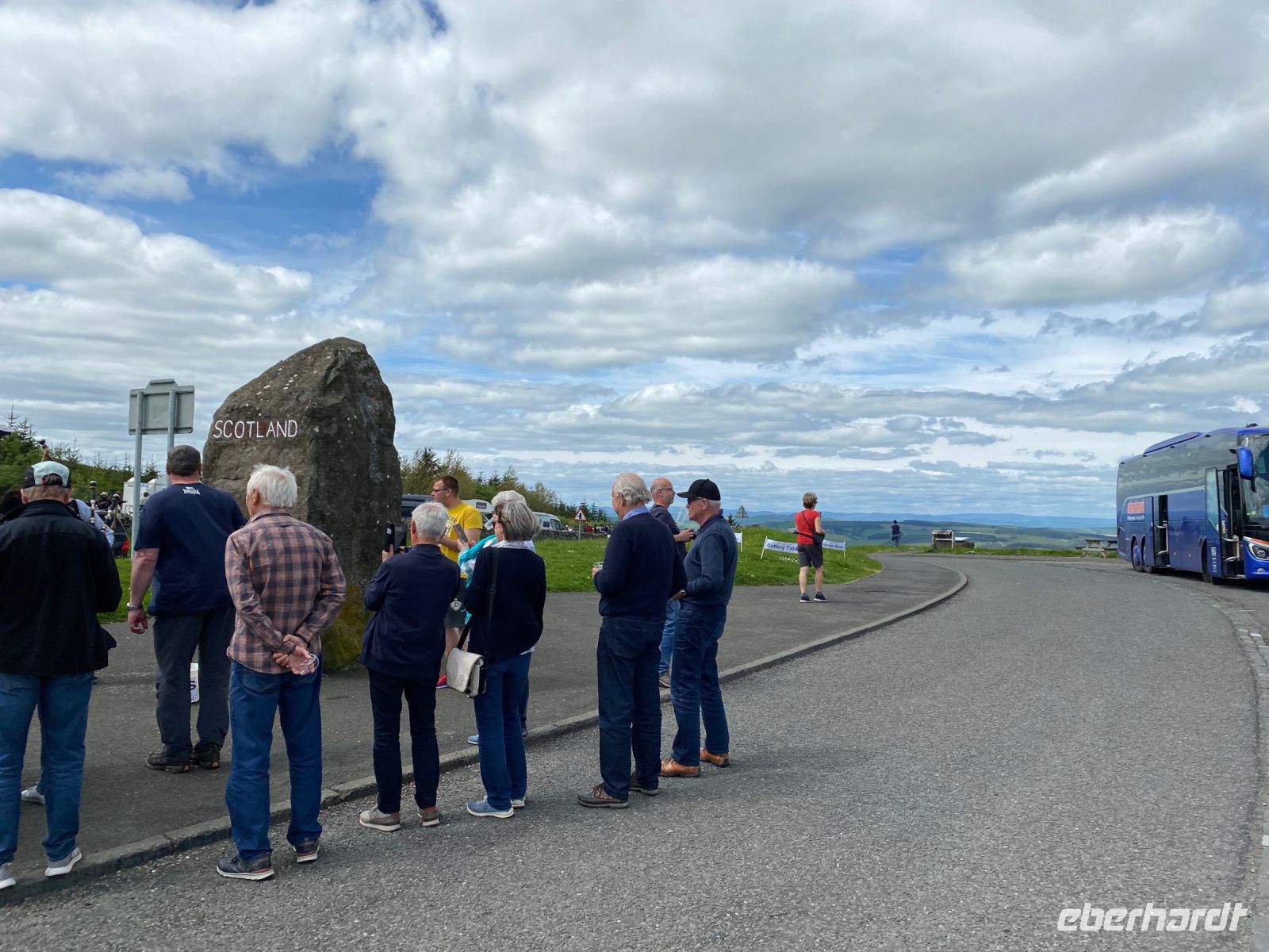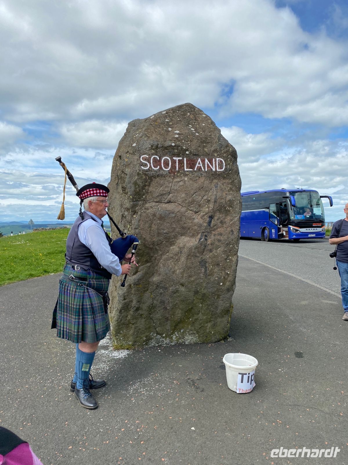 Nicht weit von hier stehen wir dann wie schon zum zweiten Mal auf dem 418 m hohen Pass Carter Bar an der Grenze zu England. Nun ist alles anders als zuvor. Damals war Schottland für uns fremd, nun ist es in nur einer Woche ein vertrauter Teil unseres Lebens geworden. Diesen Anlass feiern wir angemessen. Mit bestem schottischen Whisky in der Hand hören wir Alan zu, der für uns musiziert und uns mit seinem Dudelsack angemessen verabschiedet. Wir sollen bald wiederkommen – sehr gerne! Danke Alan, danke Schottland.