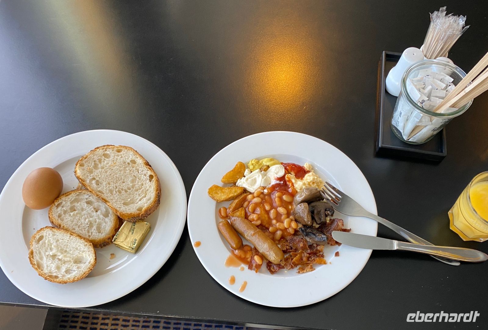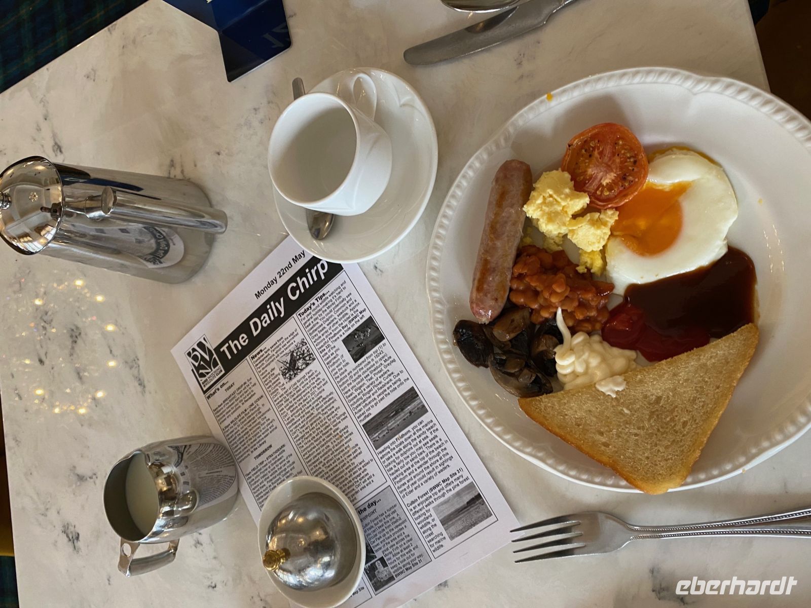 Was ist der Unterschied zwischen einem englischen und einem schottischen Frühstück? Eigentlich nur der Name, wäre da nicht ein kleines Detail. In Schottland wird auch noch Haggis aufgetischt. Immer gibt es Eier, Bacon, Bohnen, diverse Würste, Kartoffelpuffer, Tomaten, Champignons etc., dazu diverse süße Brotaufstriche, vor allem Marmelade und sehr viel Butter. Hafer in diversen Varianten und vieles mehr, dass in Deutschland eher mit anderen Tageszeiten in Verbindung gebracht wird.