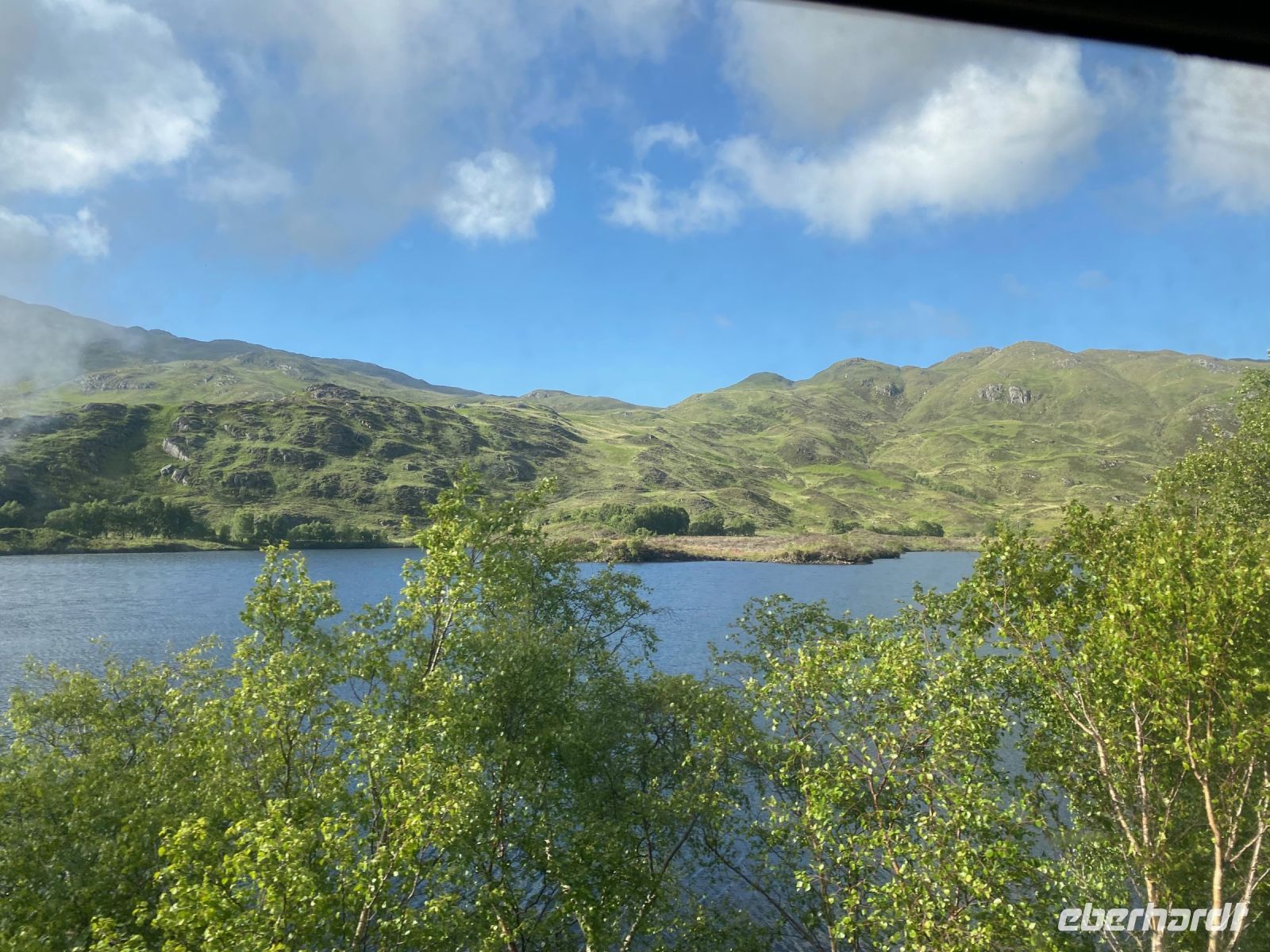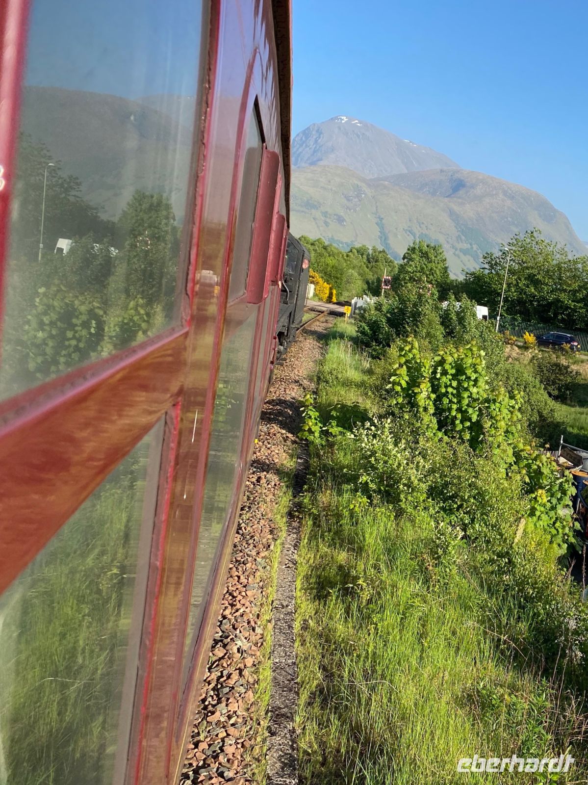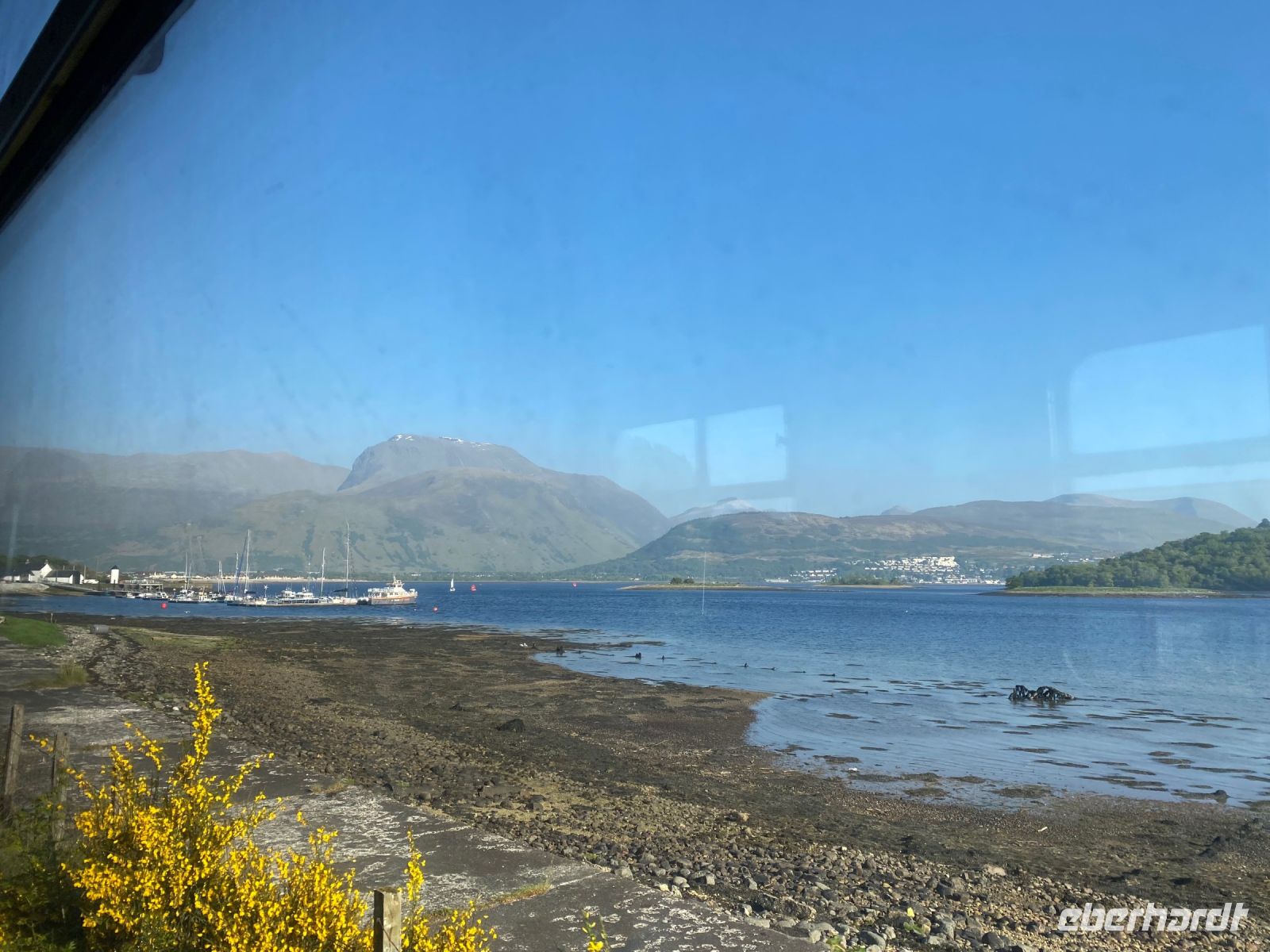 Dann ist es soweit, unsere magische Fahrt beginnt. Maik fährt im Bus voraus nach Fort William, während für uns die längste und sicher faszinierendste Bahnfahrt auf dieser Reise startet. Die Tatsache, dass wir die Strecke schon von der Herfahrt gut kennen, trägt zum besonderen Erlebnis bei. Der Höhepunkt in Metern ist dabei schließlich die Fahrt über das Glenfinnan Viadukt mit Blick auf die Berge, auf Loch Shiel und auf unseren eigenen Zug.