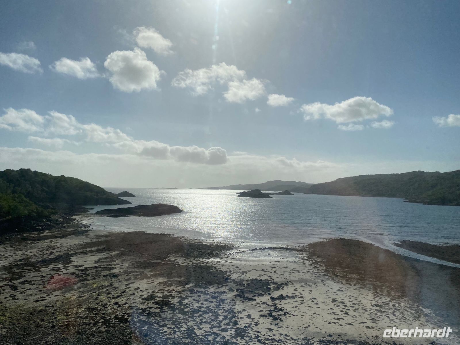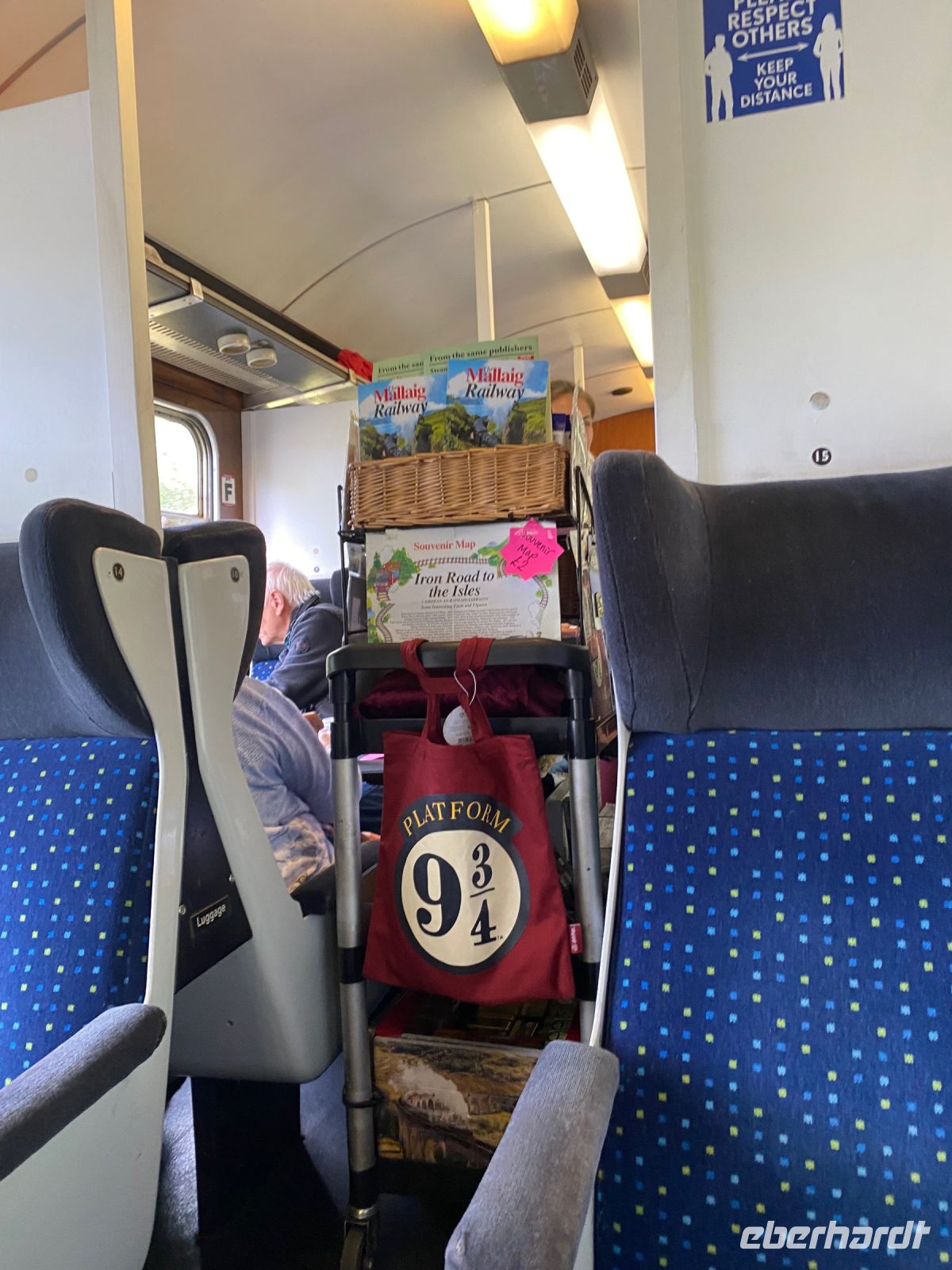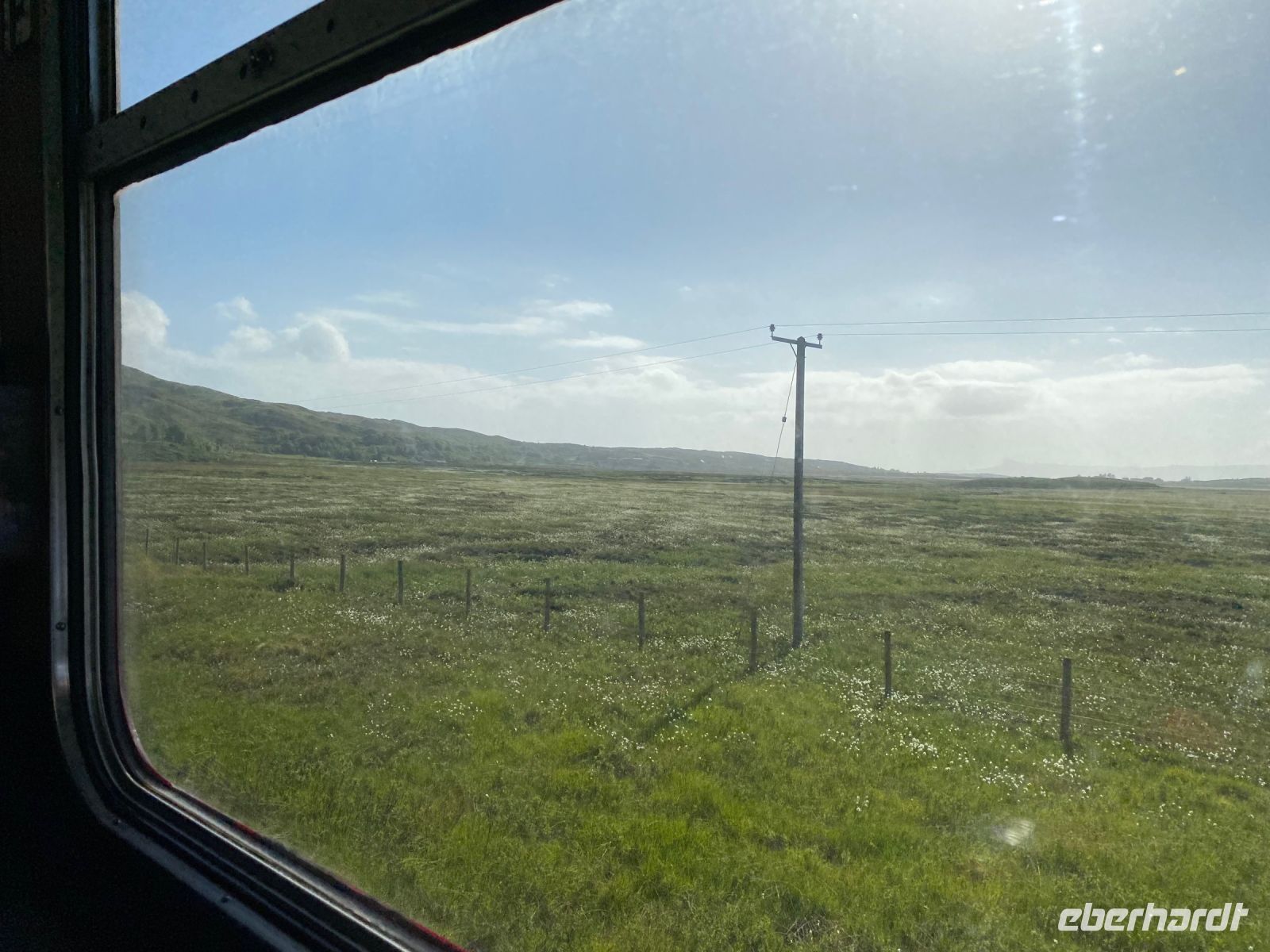 Dann ist es soweit, unsere magische Fahrt beginnt. Maik fährt im Bus voraus nach Fort William, während für uns die längste und sicher faszinierendste Bahnfahrt auf dieser Reise startet. Die Tatsache, dass wir die Strecke schon von der Herfahrt gut kennen, trägt zum besonderen Erlebnis bei. Der Höhepunkt in Metern ist dabei schließlich die Fahrt über das Glenfinnan Viadukt mit Blick auf die Berge, auf Loch Shiel und auf unseren eigenen Zug.