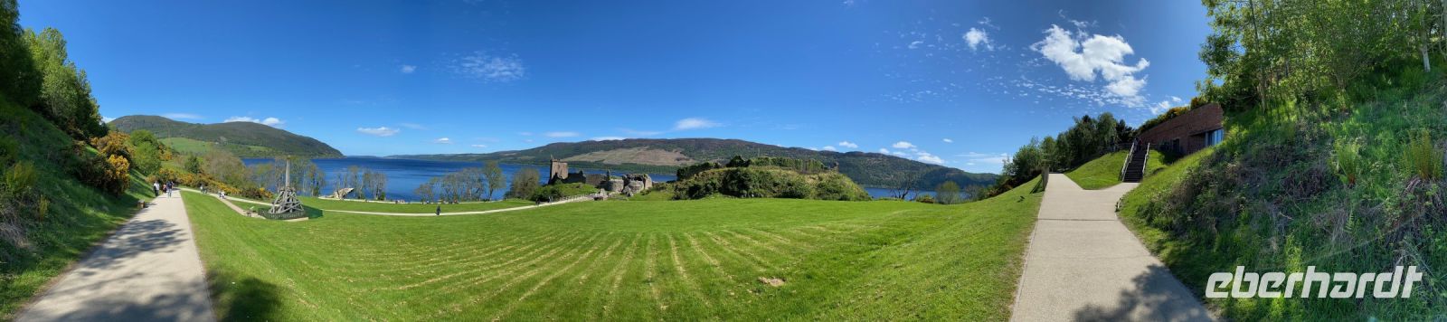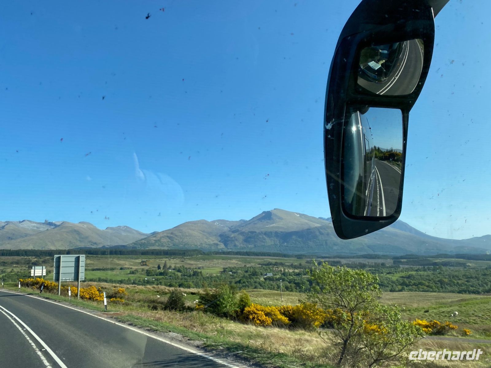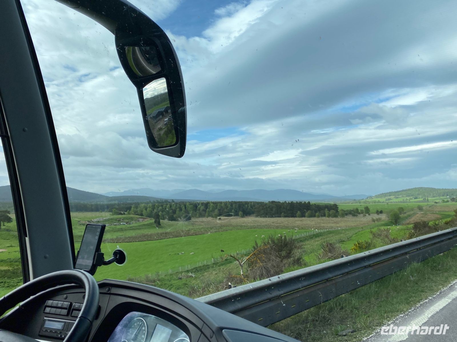Wir wechseln heute aber noch einmal komplett das Verkehrsmittel, zuerst fahren wir gerne wieder mit Maik im Bus mit, es geht am Ort Carrbridge mit seiner alten Brücke vorbei nach Norden, Richtung Inverness, am Fluss Ness. Der ist vor allem wegen des nahen und weltberühmten Loch Ness ein Begriff. Im Bus geht es direkt an diesen mysteriösen See.