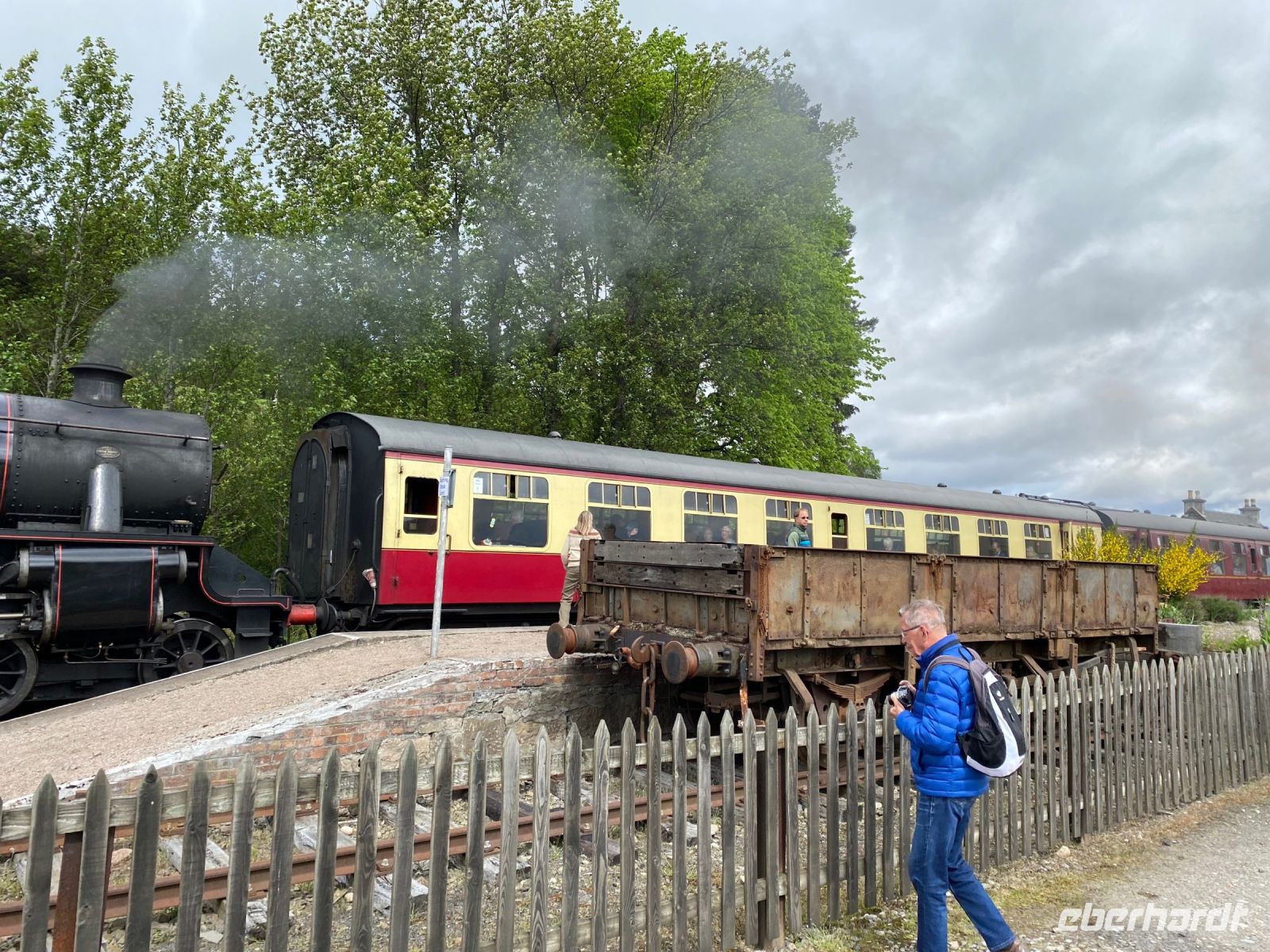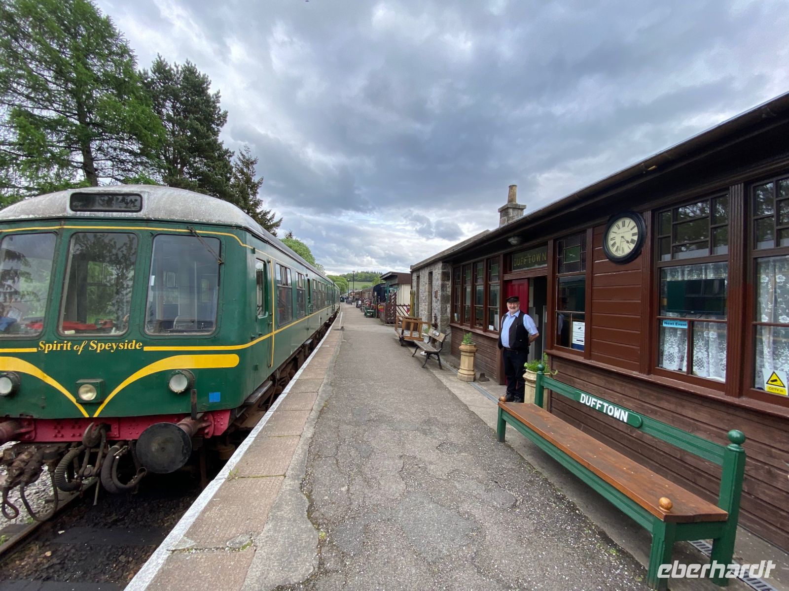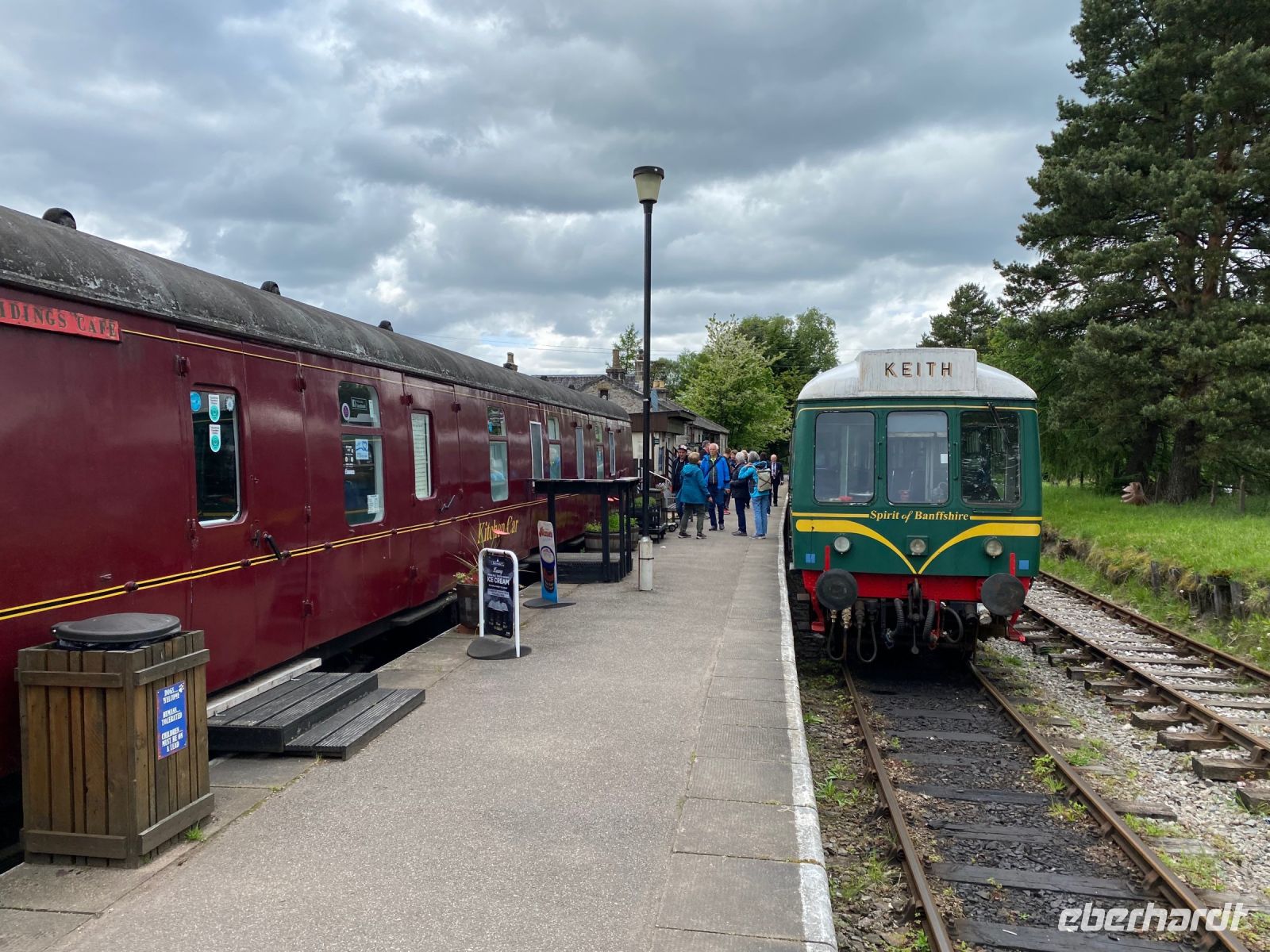 Der heutige Tag beginnt mit einem köstlichen schottischen Frühstück, danach fahren wir zu einem kleinen Städtchen namens Keith. Hier soll unsere Fahrt mit der auch als Whisky Line bekannten Keith & Dufftown Railway nach Dufftown beginnen. Soll, denn der Bahnhof ist verwaist. Was ist passiert? Unser historischer Triebwagenzug hat einen technischen Defekt! Die Bahn wird von einem kleinen Verein betrieben und alle verfügbaren Leute bemühen sich gerade den Zug zu reparieren.
