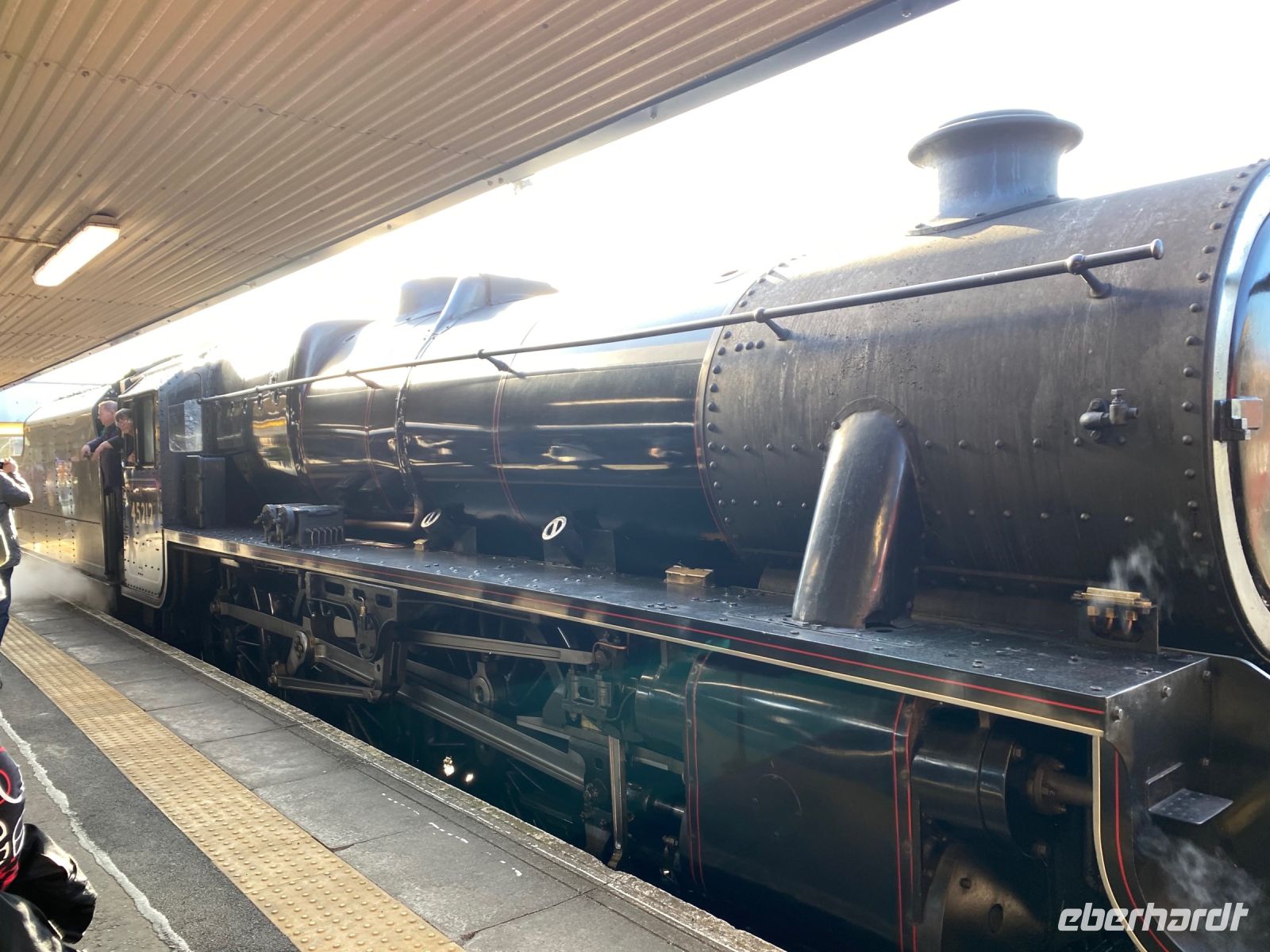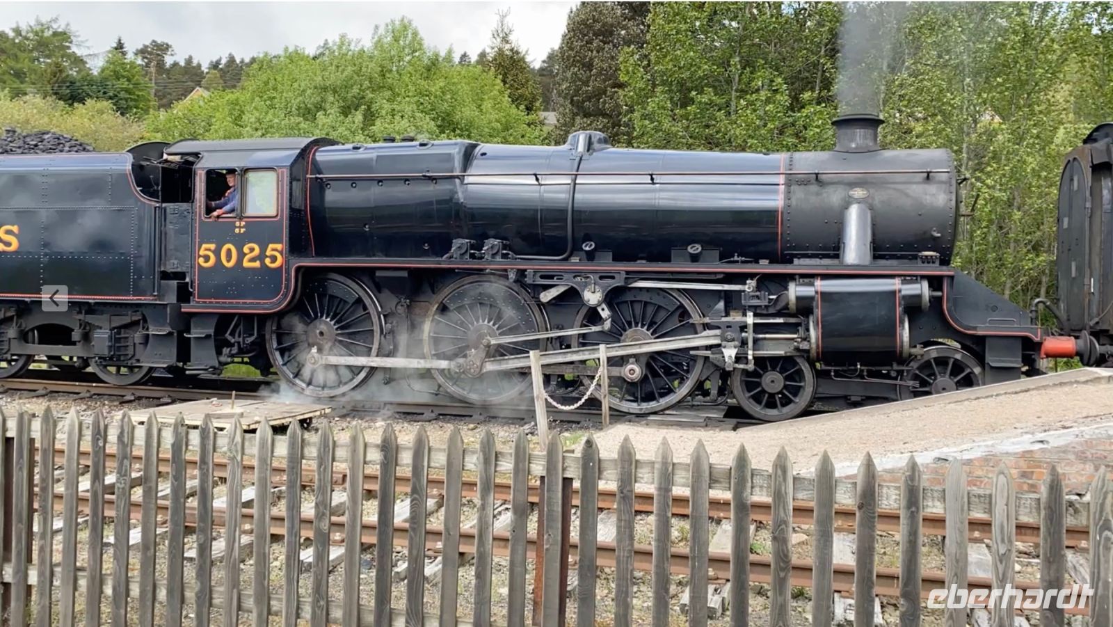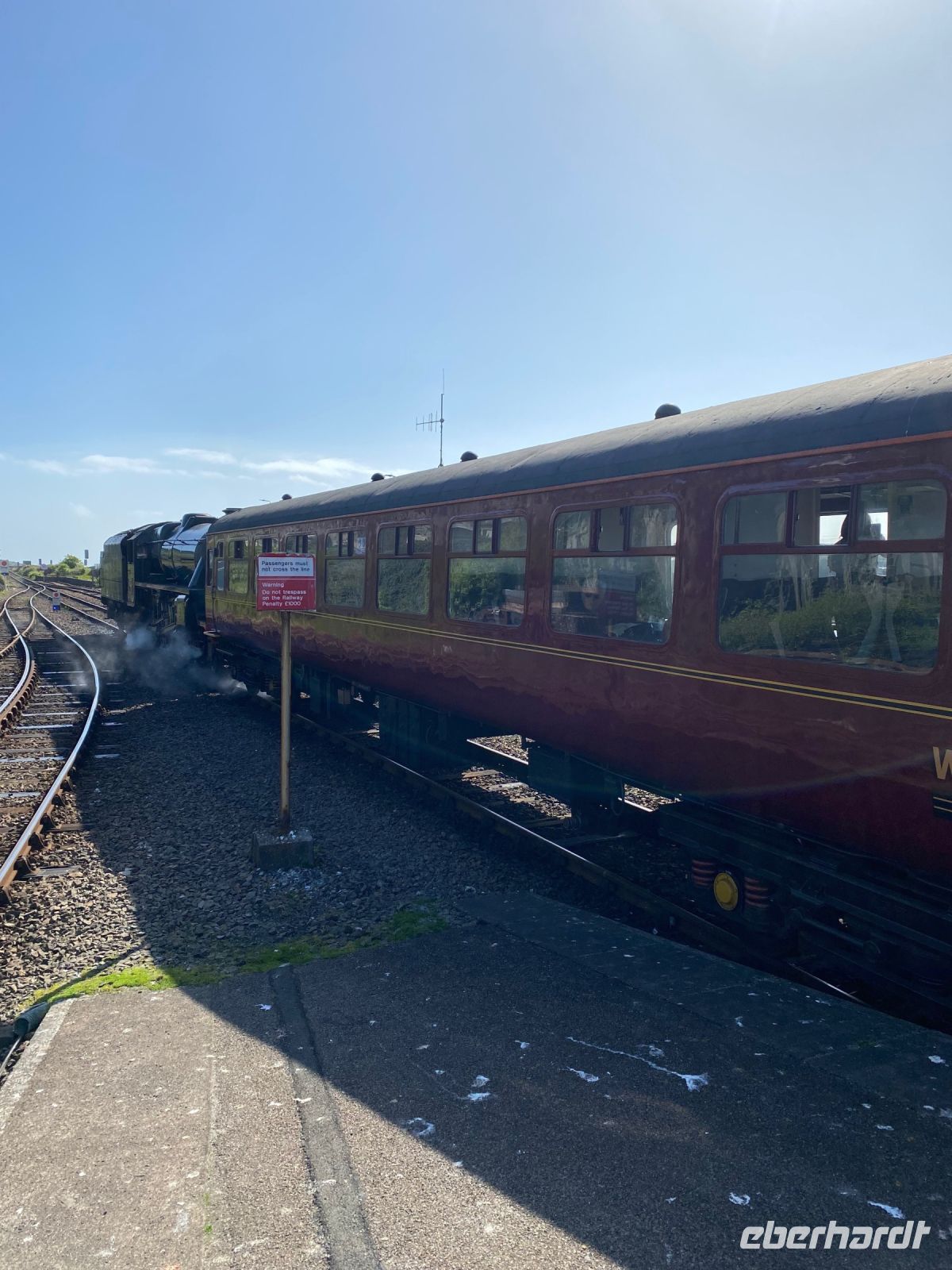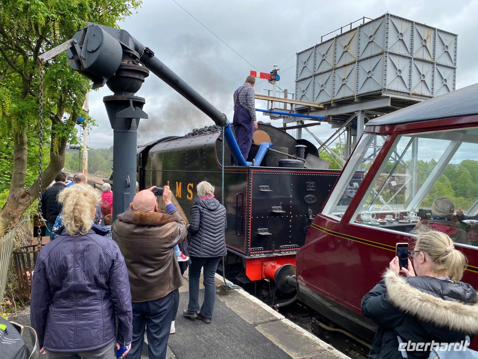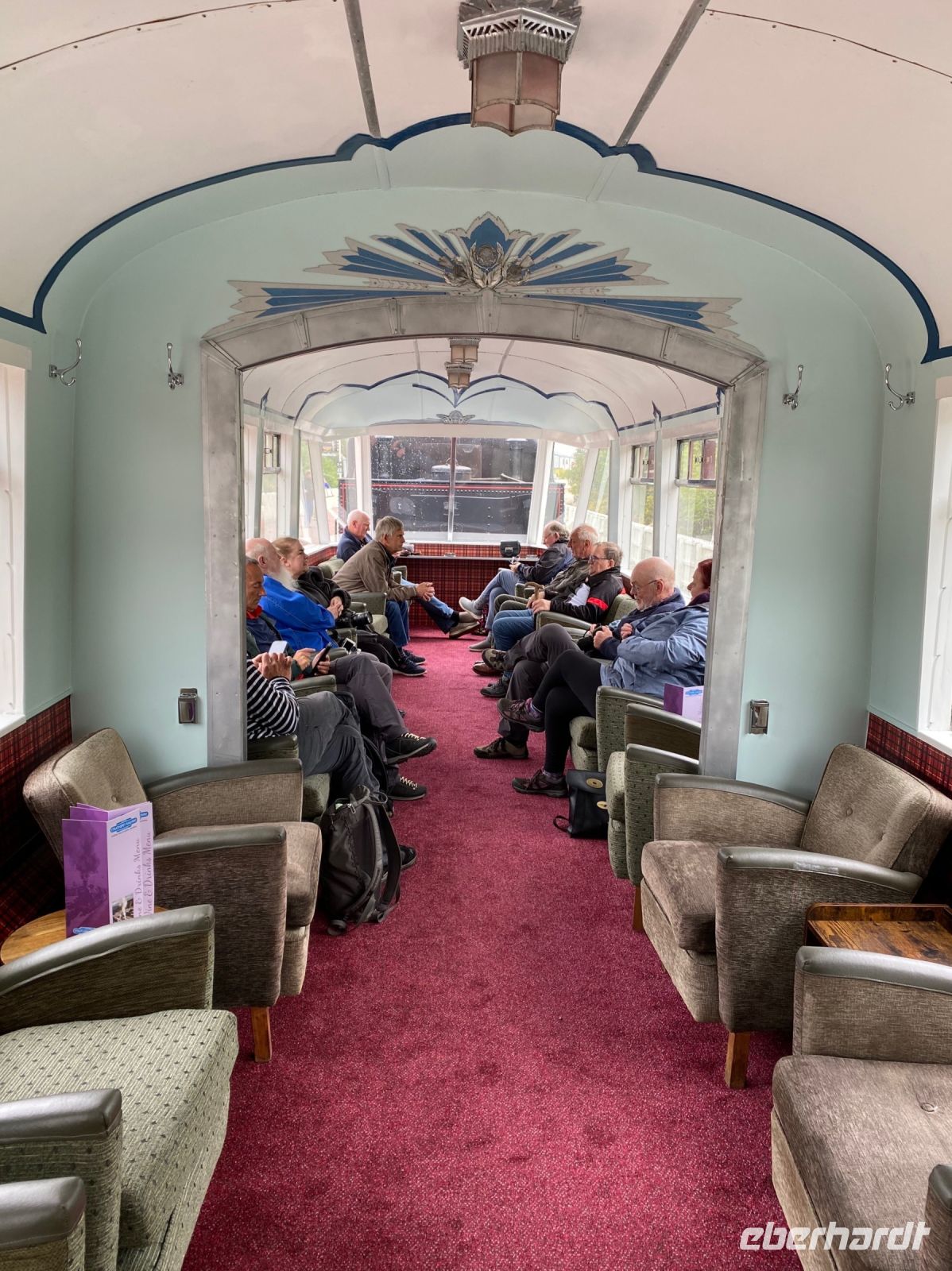 Die Lokomotive 45212, auch wieder eine „Black Five“, zieht den Zug dabei die ganze Zeit rückwärts, fast zwei Stunden lang dauert das auf der ca. 70 km langen Strecke. Wer die Fenster etwas öffnet kann aus der Luft kleine unverbrannte Kohlekrümel einfangen, als ganz besonderes Souvenir. Für uns ist alles an dieser Fahrt ein ganz großes Erlebnis. Die Kombination aus Klang, Geruch und Schwingung, aus Reise und Zeitreise ist faszinierend und nebenbei auch ganz wunderbar entspannend.