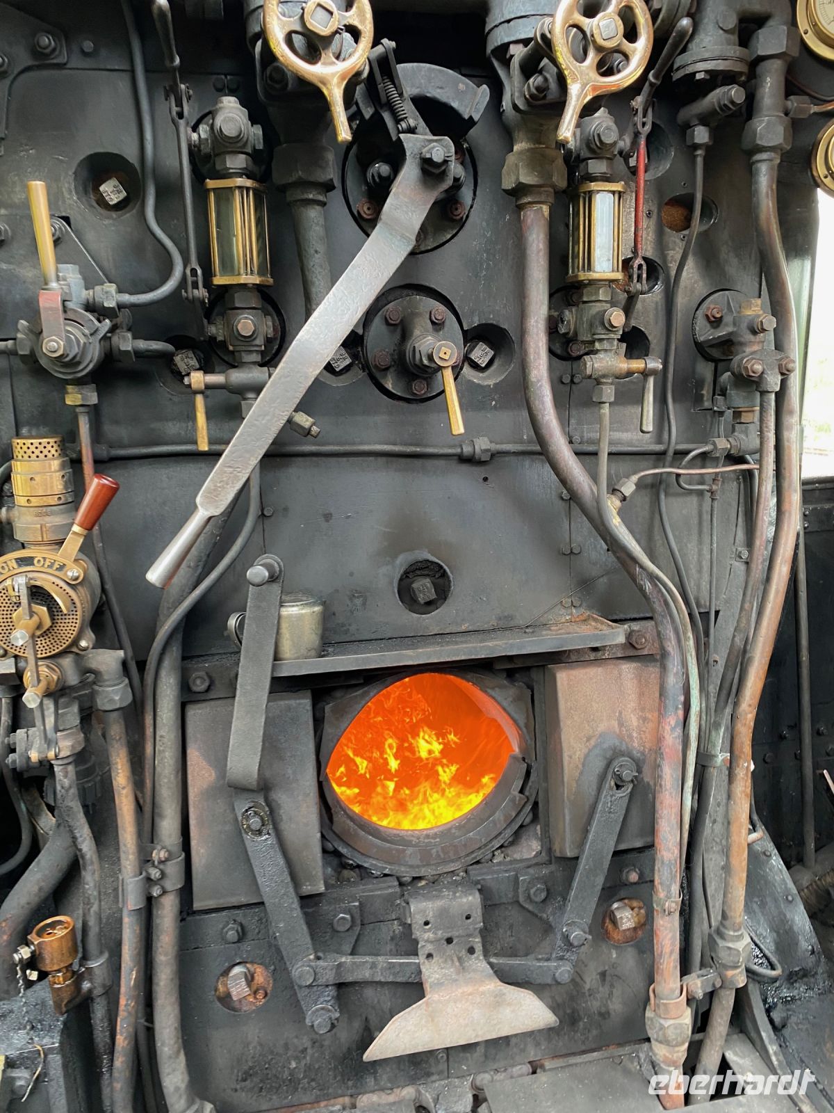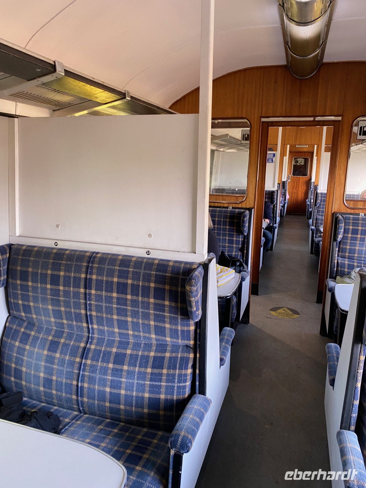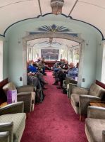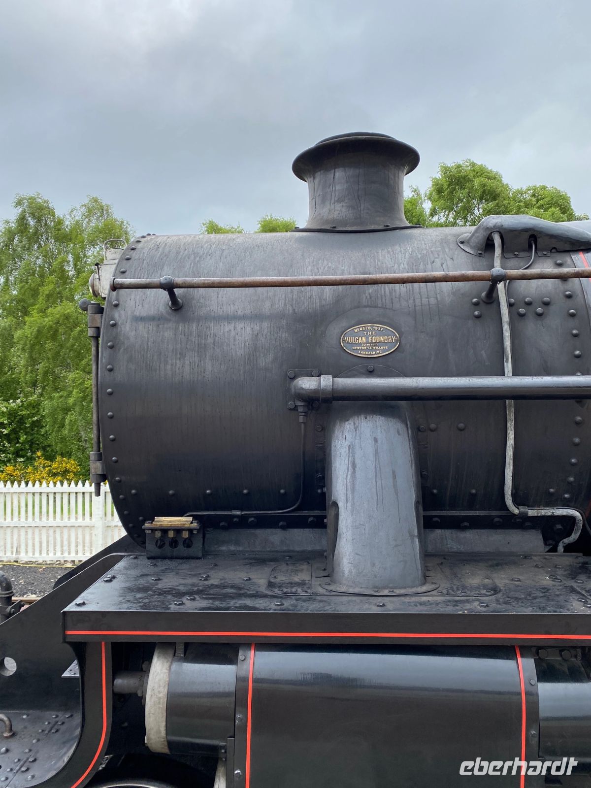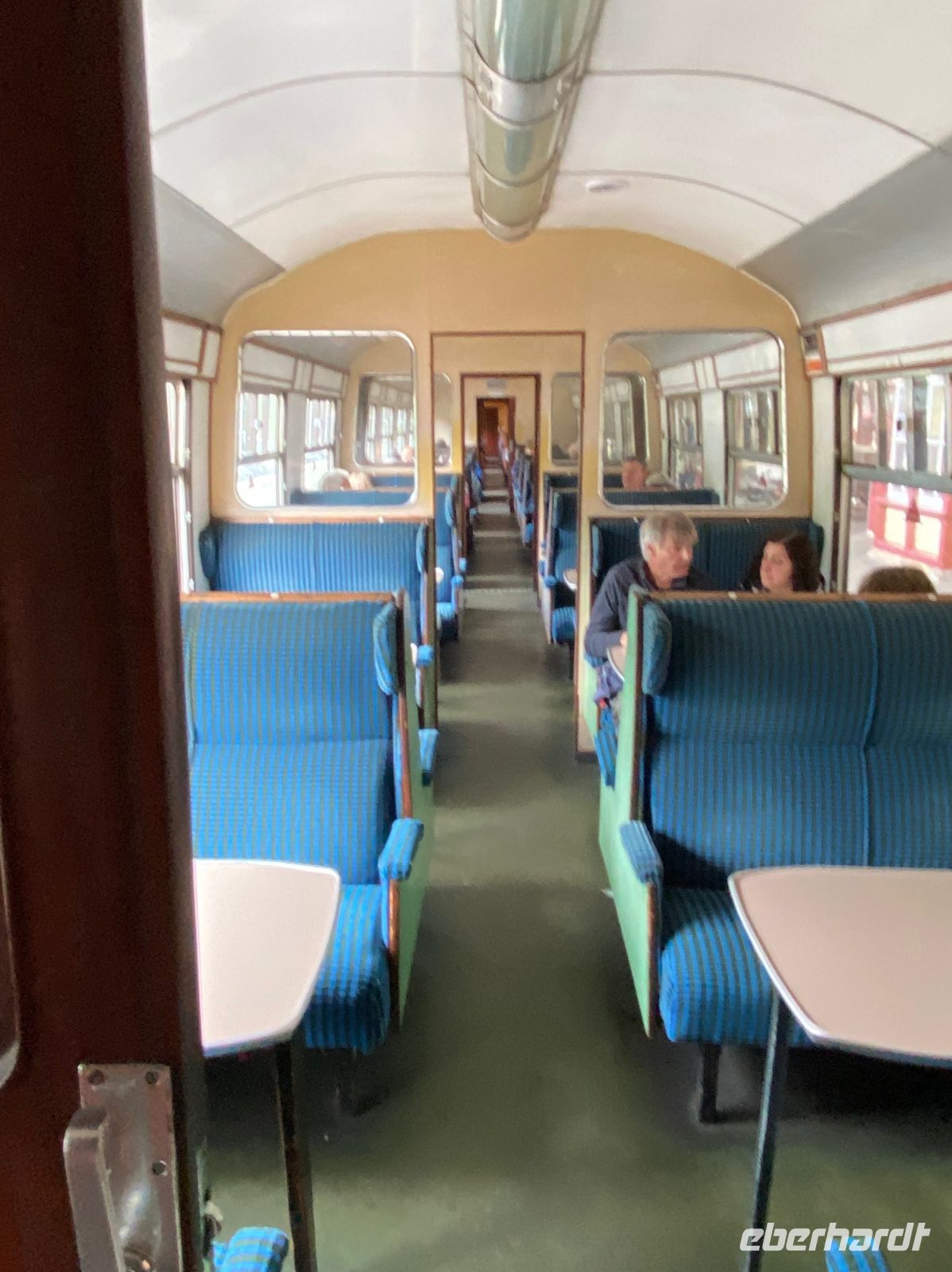 Die Lokomotive 45212, auch wieder eine „Black Five“, zieht den Zug dabei die ganze Zeit rückwärts, fast zwei Stunden lang dauert das auf der ca. 70 km langen Strecke. Wer die Fenster etwas öffnet kann aus der Luft kleine unverbrannte Kohlekrümel einfangen, als ganz besonderes Souvenir. Für uns ist alles an dieser Fahrt ein ganz großes Erlebnis. Die Kombination aus Klang, Geruch und Schwingung, aus Reise und Zeitreise ist faszinierend und nebenbei auch ganz wunderbar entspannend.
