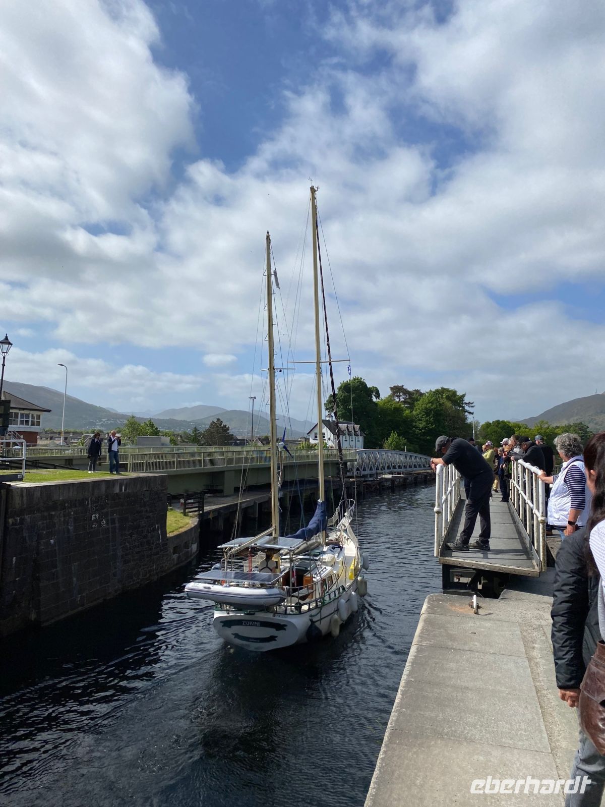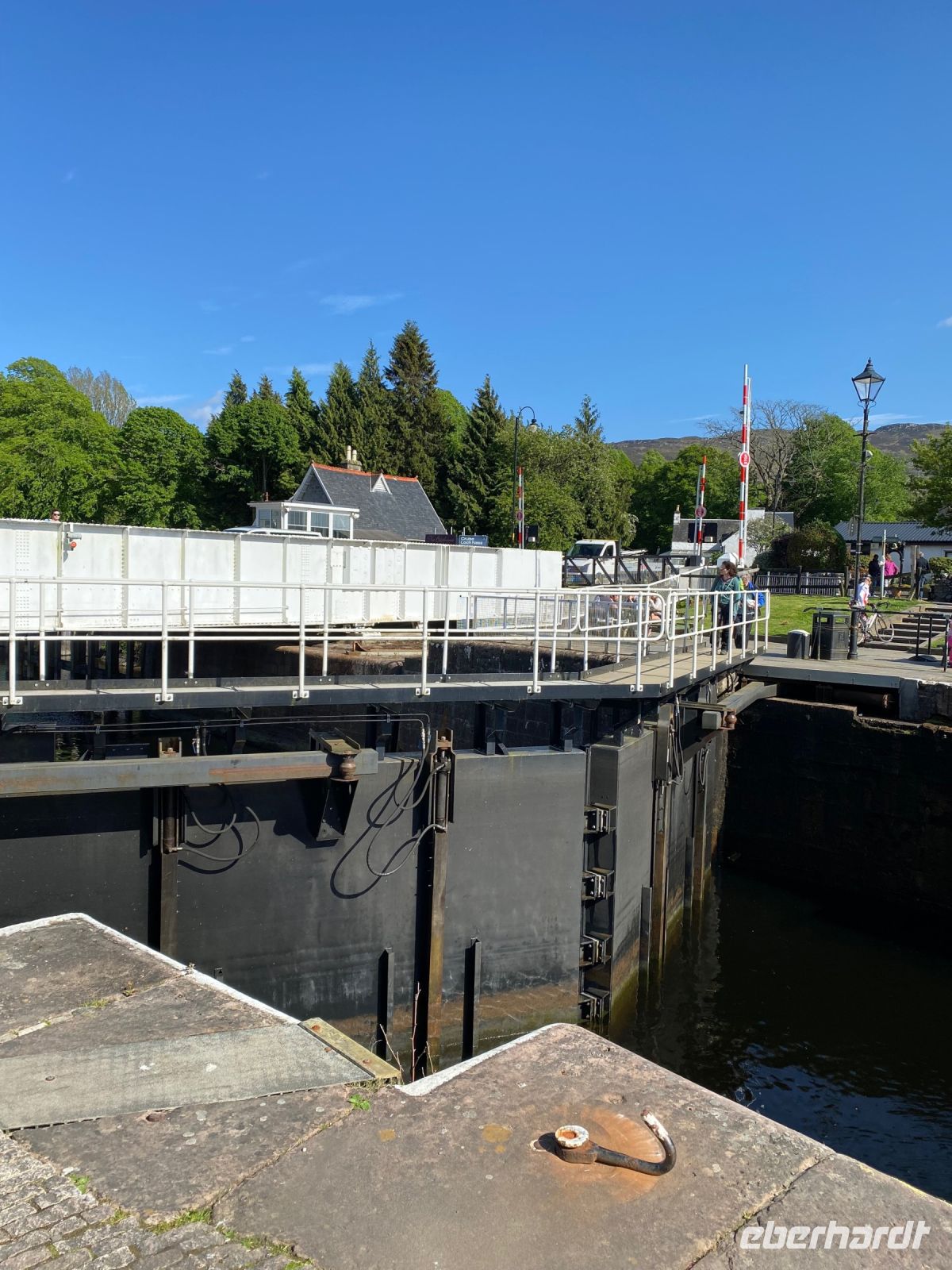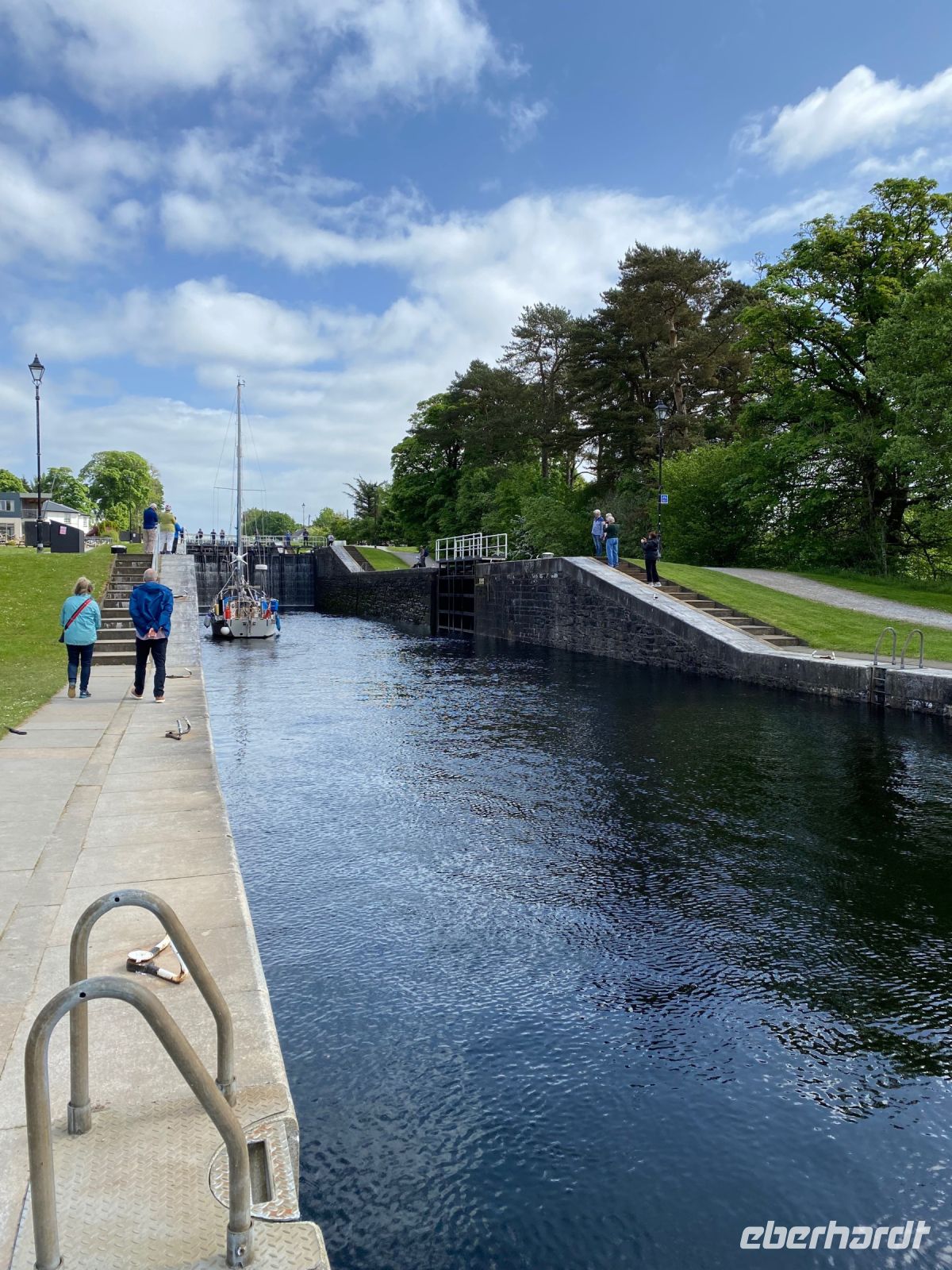 Wir sind da, um wundervolle Landschaften und fantastische Eisenbahnen zu erleben, und heute erwartet uns ein ganz besonderer Höhepunkt unter vielen. Zuerst geht es mit dem Bus noch einmal zum kaledonischen Kanal, diesmal sehen wir die Schleusentreppe am anderen Ende des Kanals, sie hat den klangvollen Namen Neptune‘s Staircase, sehr passend, denn hier ist der Kanal direkt mit dem Loch Linnhe, einer langen Meeresbucht, verbunden. Über acht gewaltige Treppenstufen überwindet der Kanal hier eine Höhe von 20 Metern. Ein Schiff benötigt heute ca. 90 Minuten, um die Anlage zu durchqueren, die ursprünglich von Hand betrieben wurde.