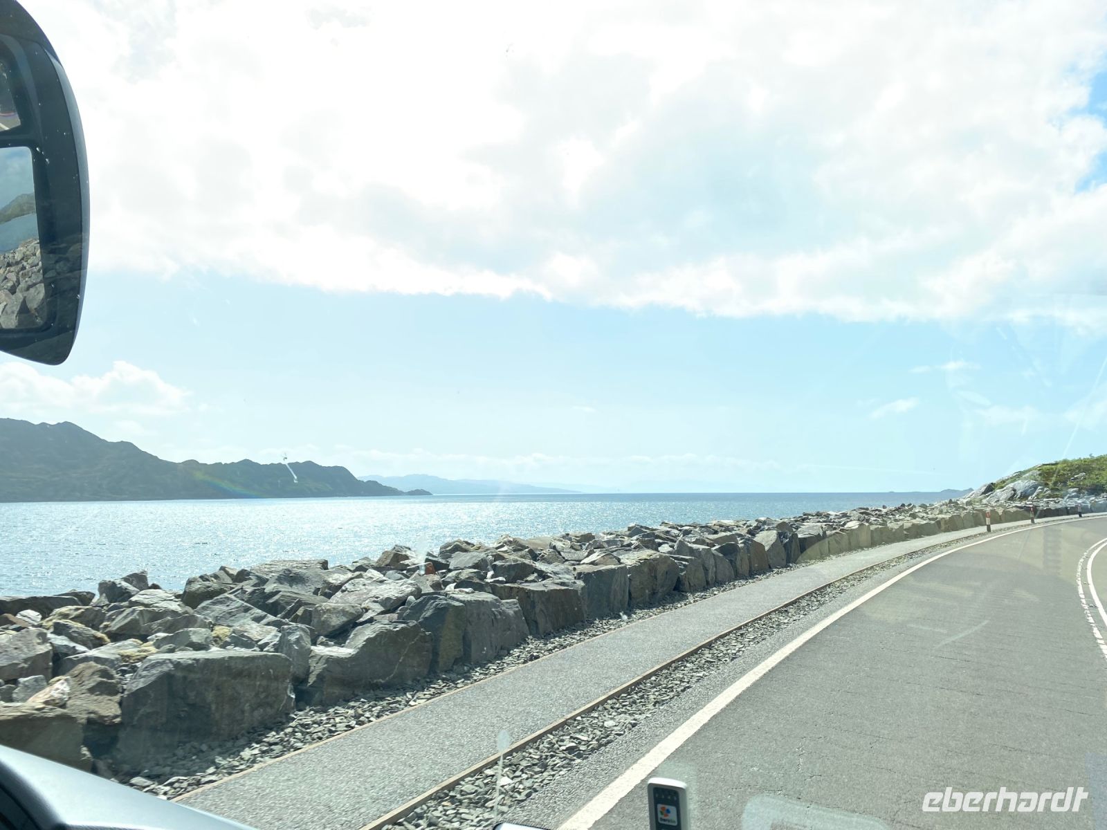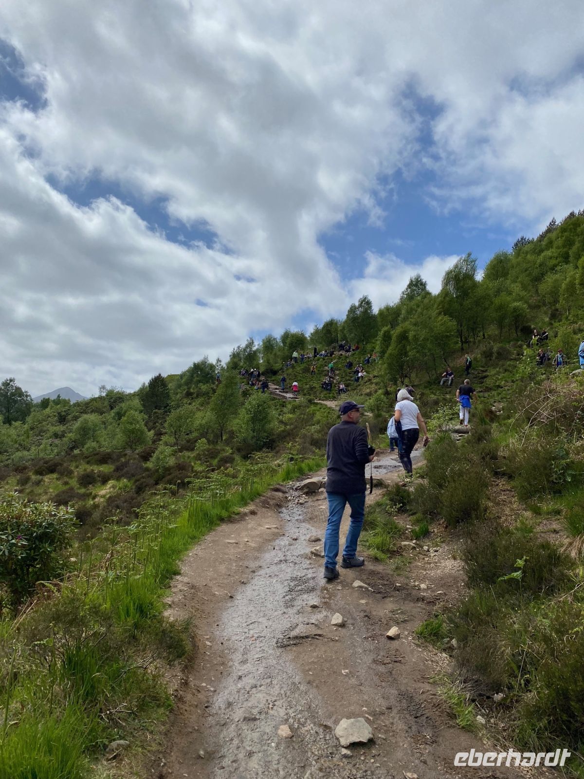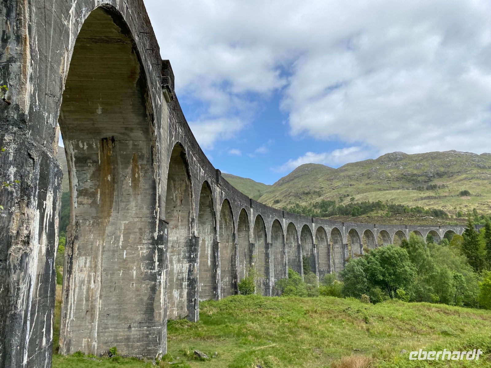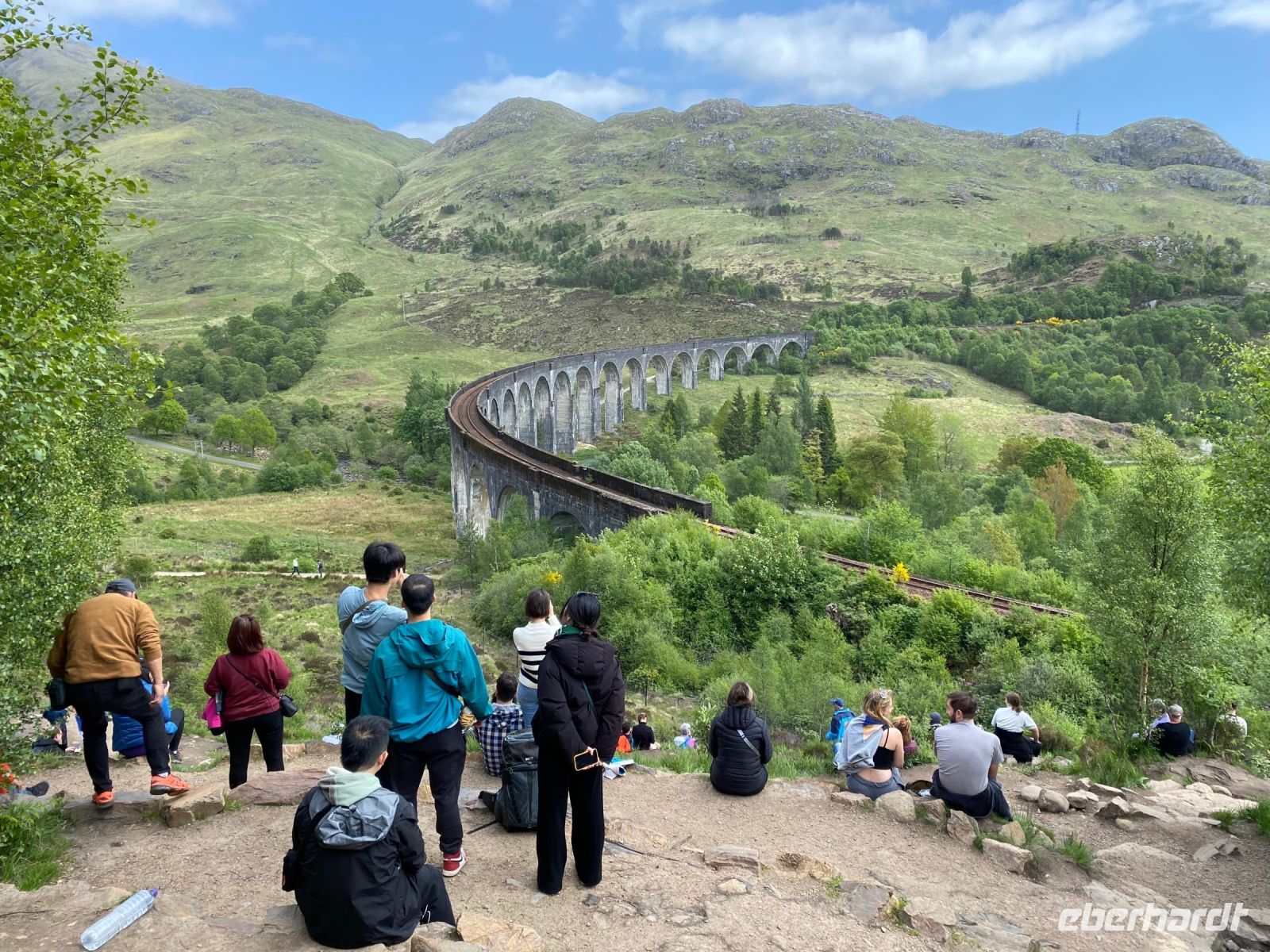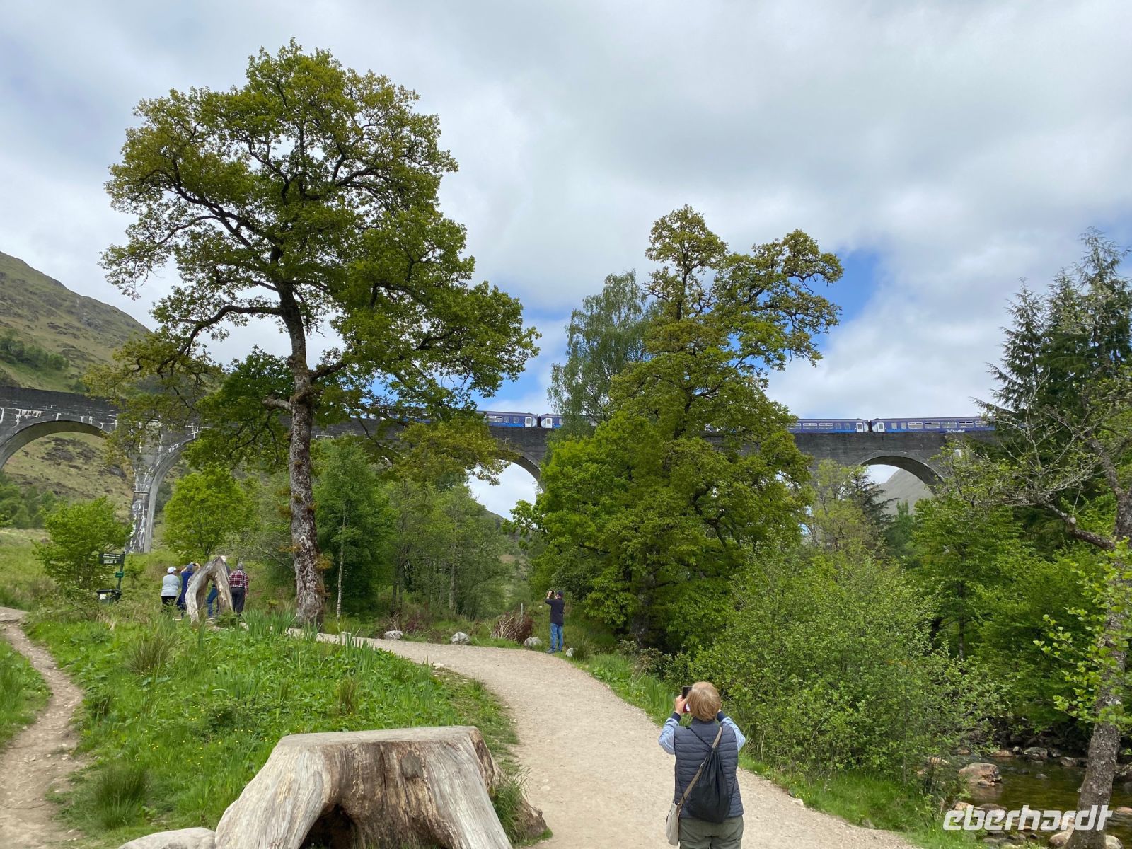 Der See alleine ist schon eine Attraktion für sich, nun geht es aber zu einem nahen Aussichtspunkt oder für die, die gerne ganz vorne mit dabei sein wollen, gibt es einen Aufstieg zum legendären Glenfinnan-Viadukt. Der Ingenieur Robert McAlpine baute es vor ca. 125 Jahren als eine der ersten Betonbrücken der Welt, er wurde nicht umsonst Beton-Bob genannt. In einem weiten Bogen spannt sich seine 380 Meter lange Brücke über das Tal, hunderte Neugierige erwarten gespannt den Jacobite Express, der mit geringer Verspätung stampfend und dampfend auftaucht. Elegant zieht er seine Runde und sein Auftritt verzaubert tatsächlich, mit oder ohne Harry Potter.