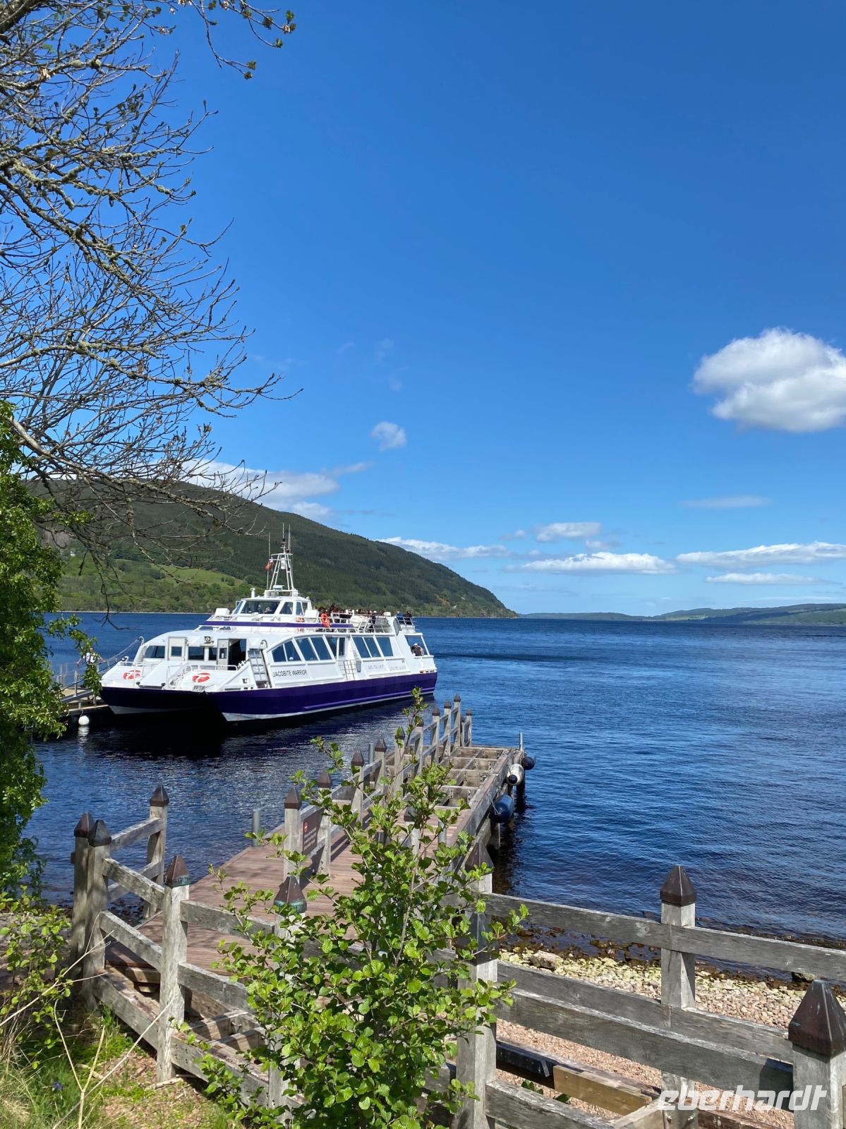 Ein Ausflugsboot der Jacobite Cruises erwartet uns bei allerschönstem Sonnenschein. Eine Bootsfahrt mit wundervollen Ausblicken bringt uns bei der Ruine des Urquhart Castle an Land. Hier haben wir Zeit für eine ausführliche Besichtigung und auch für einen spannenden Film über die wilden Kämpfe der schottischen Clans in früheren Jahrhunderten.