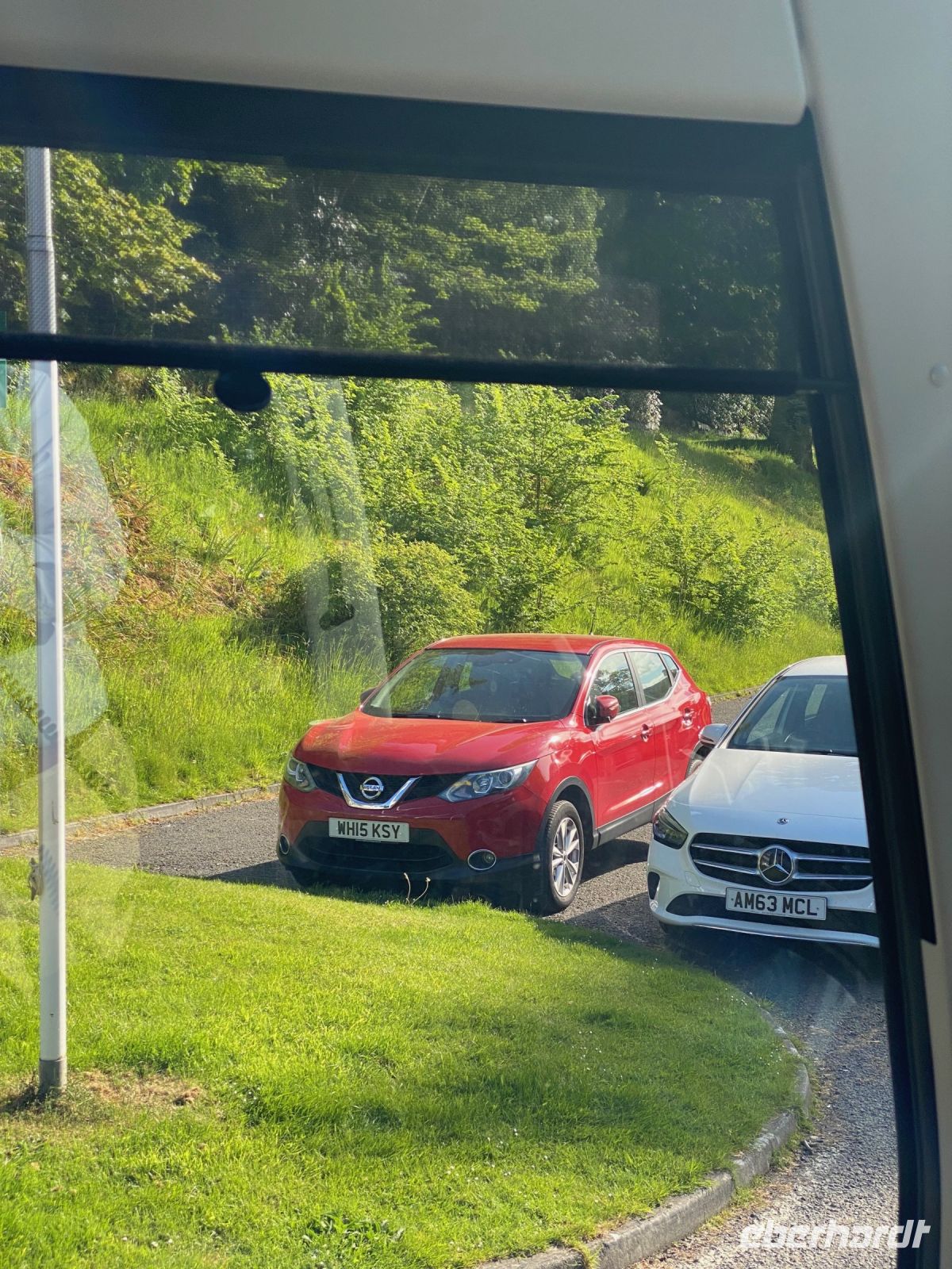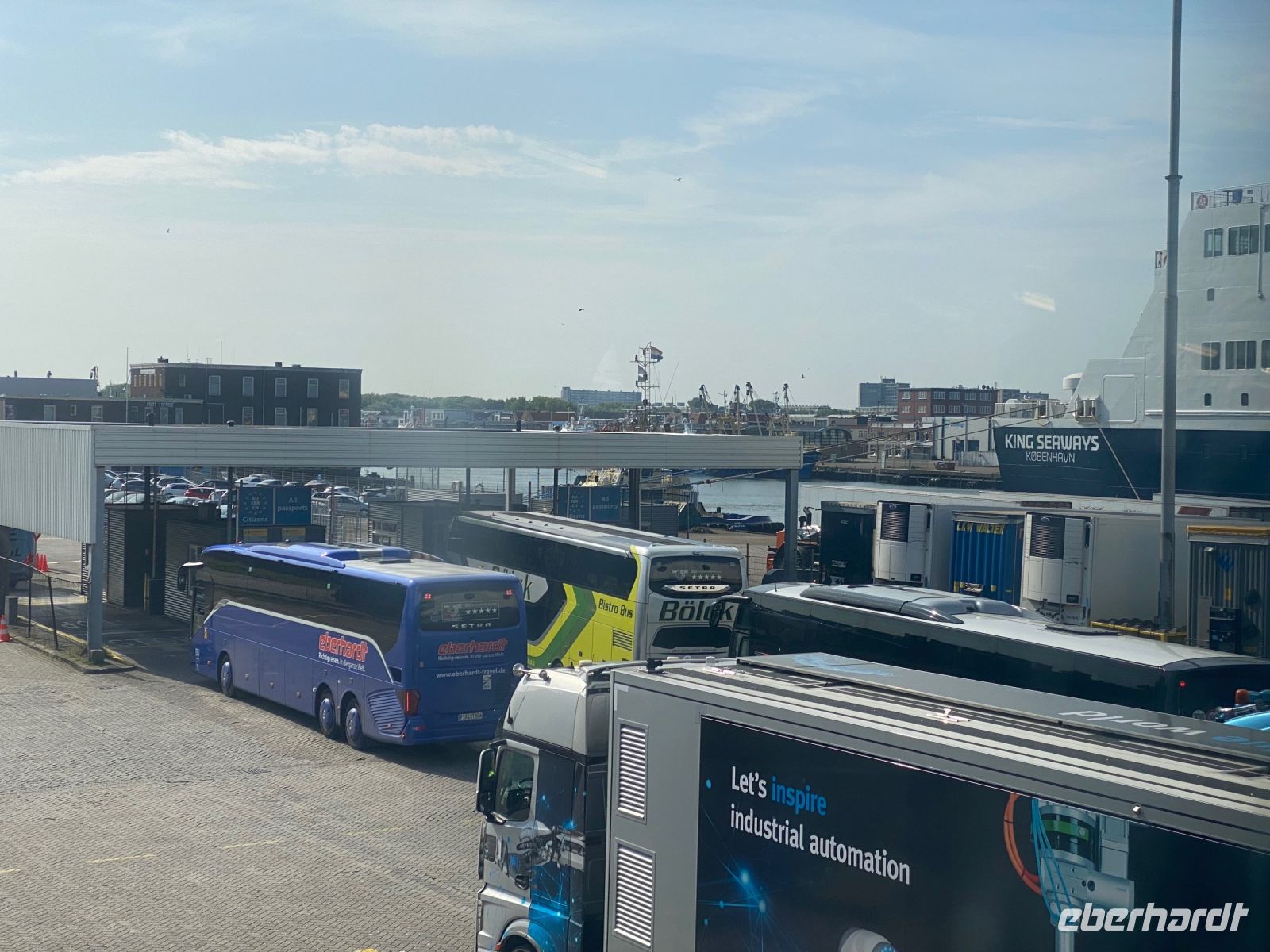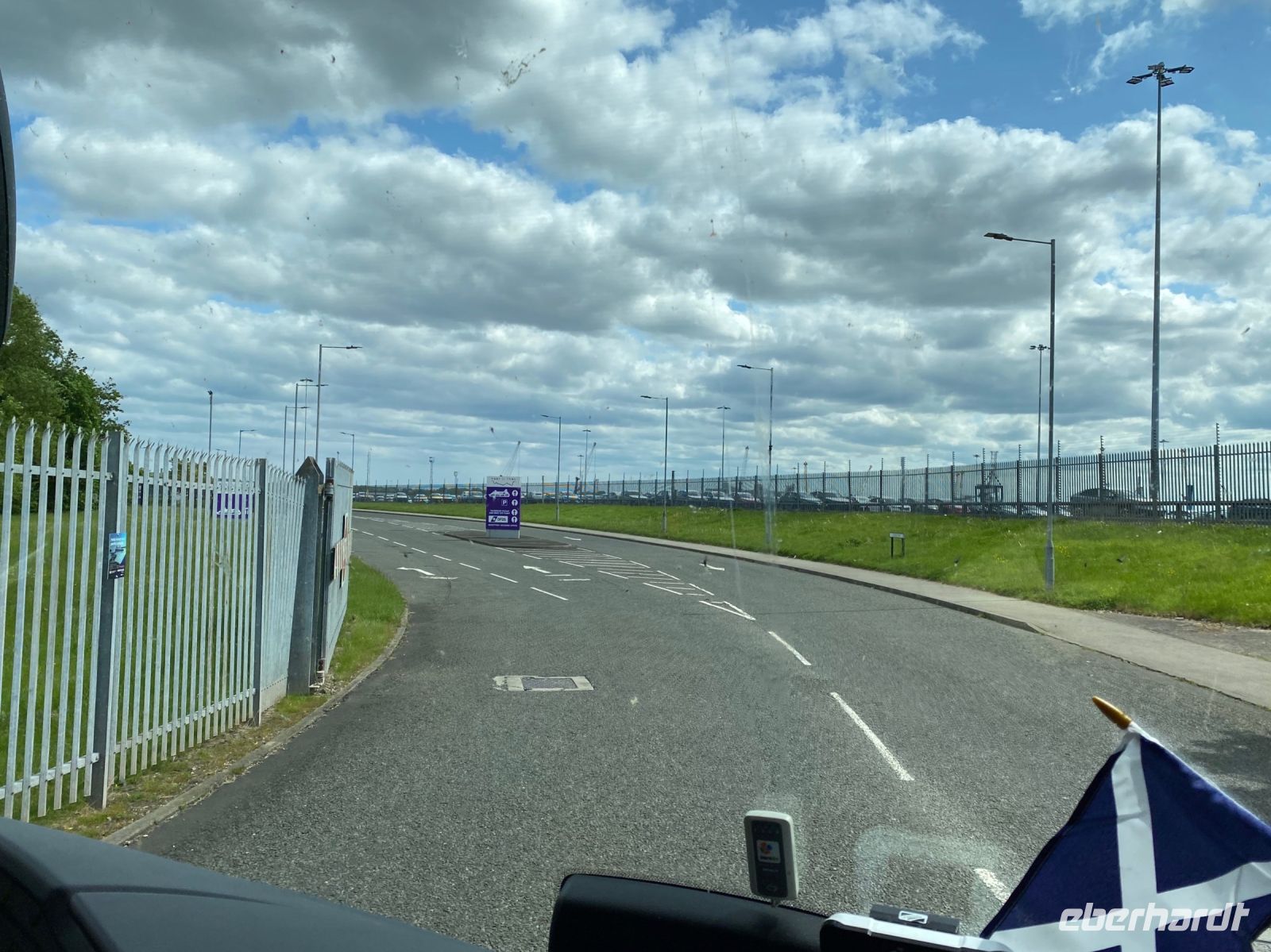 Vorerst landen wir allerdings in England, es wird ernst. Nach einem nicht allzu langen Anstehen, werden unsere Reisepässe, streng aber freundlich kontrolliert. Maik hat unseren Bus als einen der ersten von Bord fahren dürfen und schnell ist unsere kleine Gruppe mit ihrem Handgepäck versammelt. Die großen Koffer blieben während der Überfahrt ja bequemerweise im Bus.