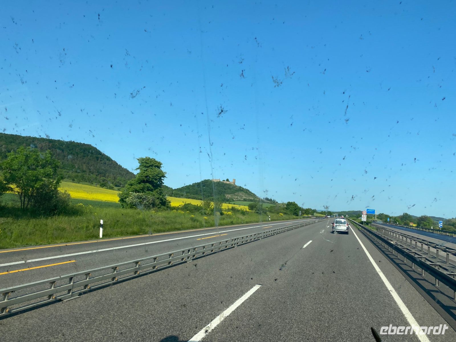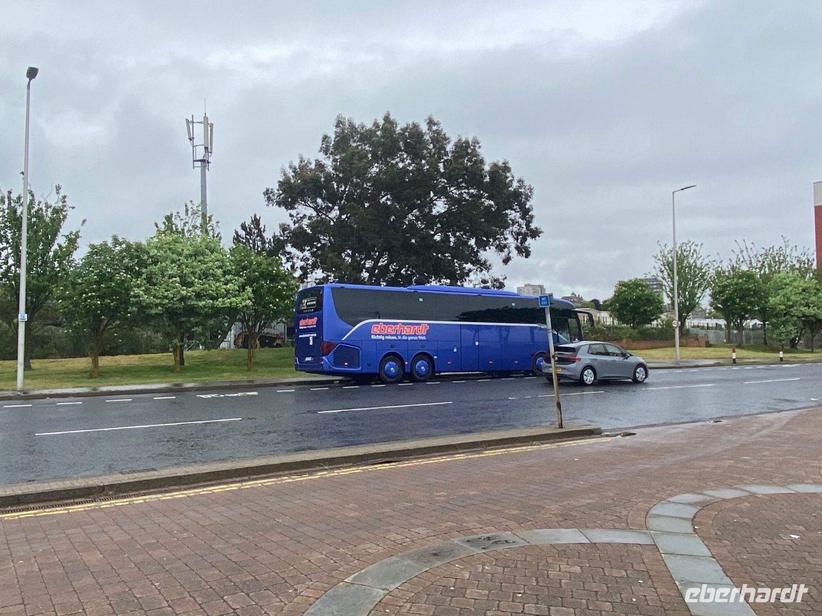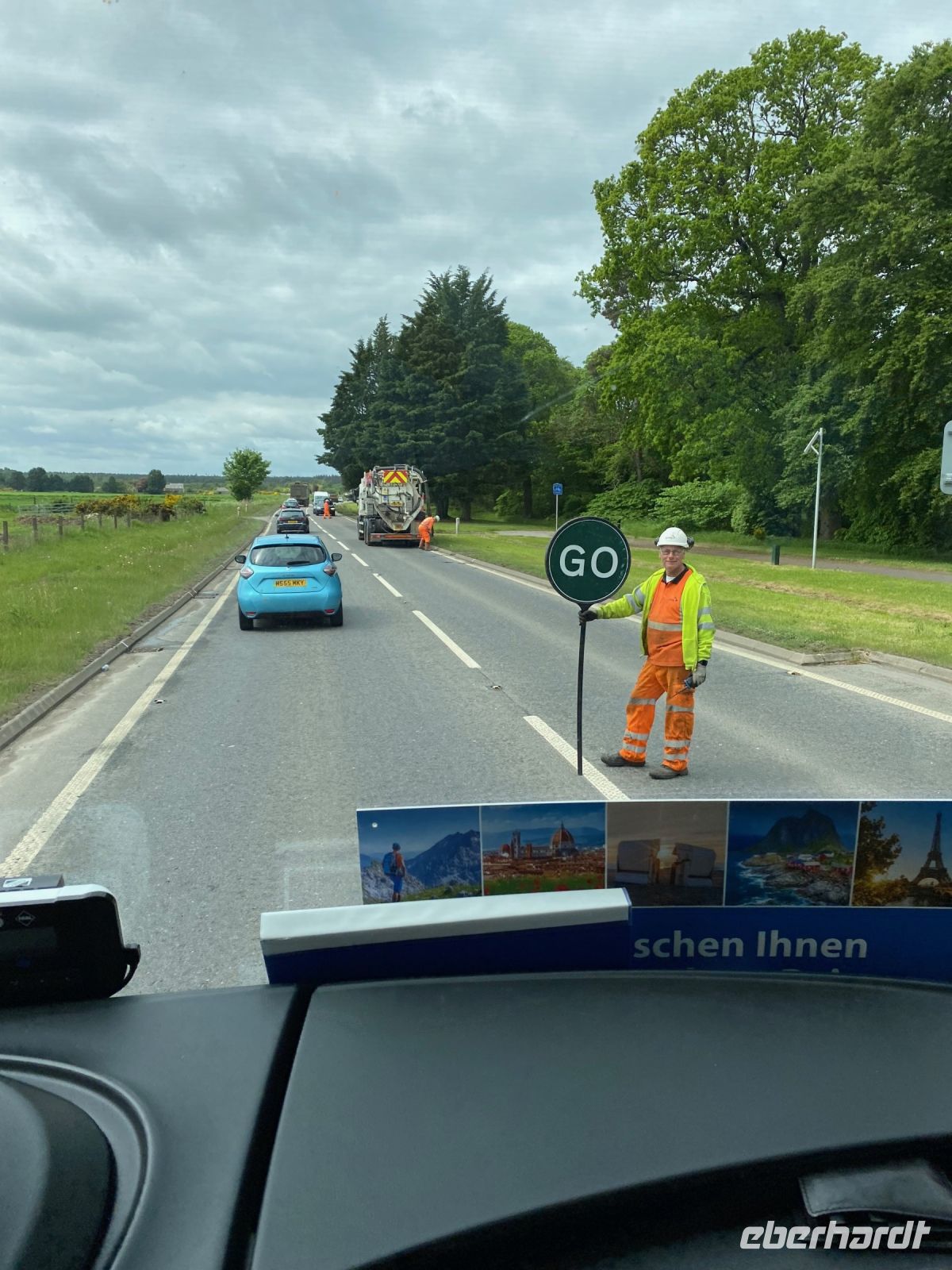 Vorerst landen wir allerdings in England, es wird ernst. Nach einem nicht allzu langen Anstehen, werden unsere Reisepässe, streng aber freundlich kontrolliert. Maik hat unseren Bus als einen der ersten von Bord fahren dürfen und schnell ist unsere kleine Gruppe mit ihrem Handgepäck versammelt. Die großen Koffer blieben während der Überfahrt ja bequemerweise im Bus.