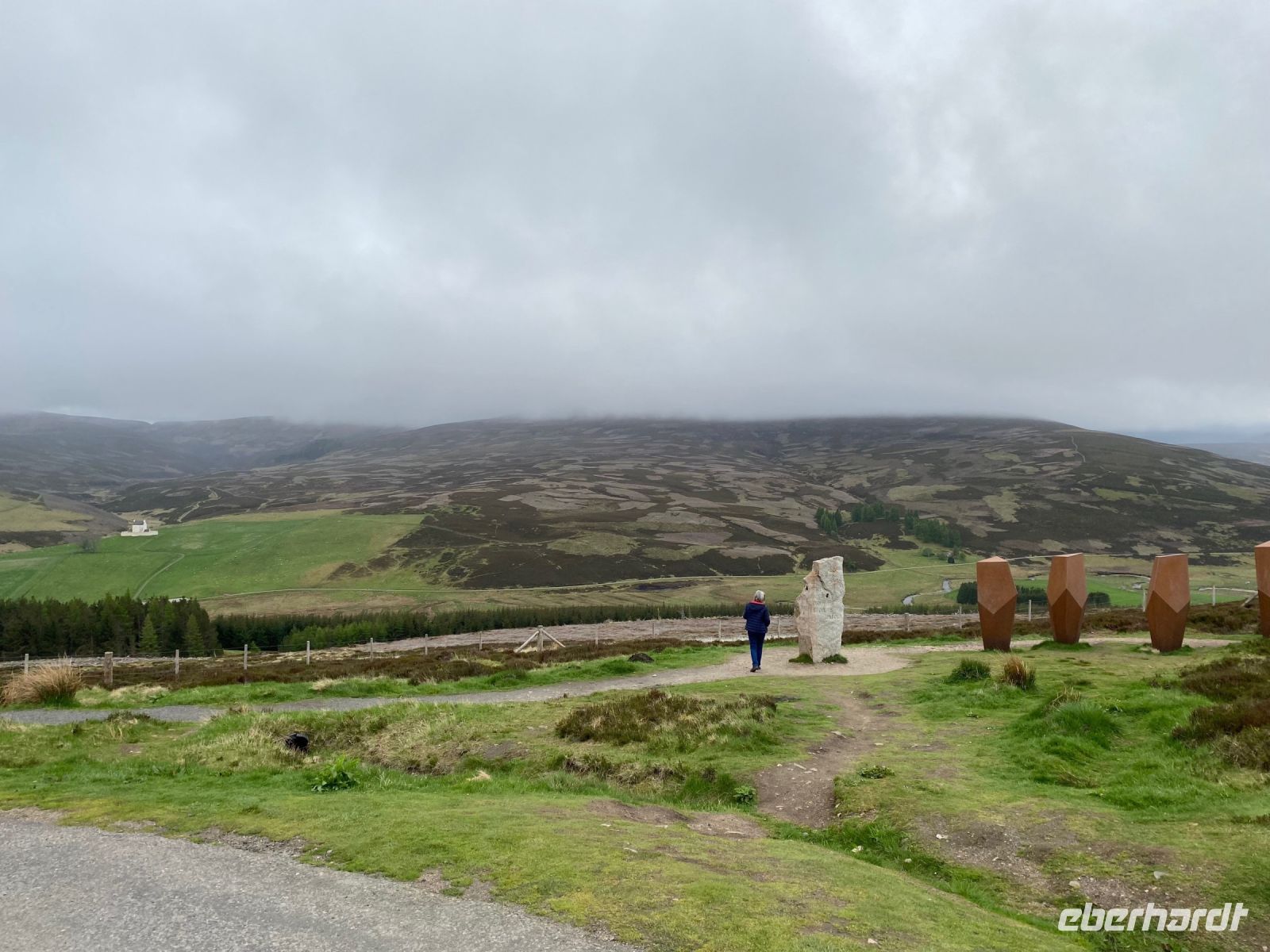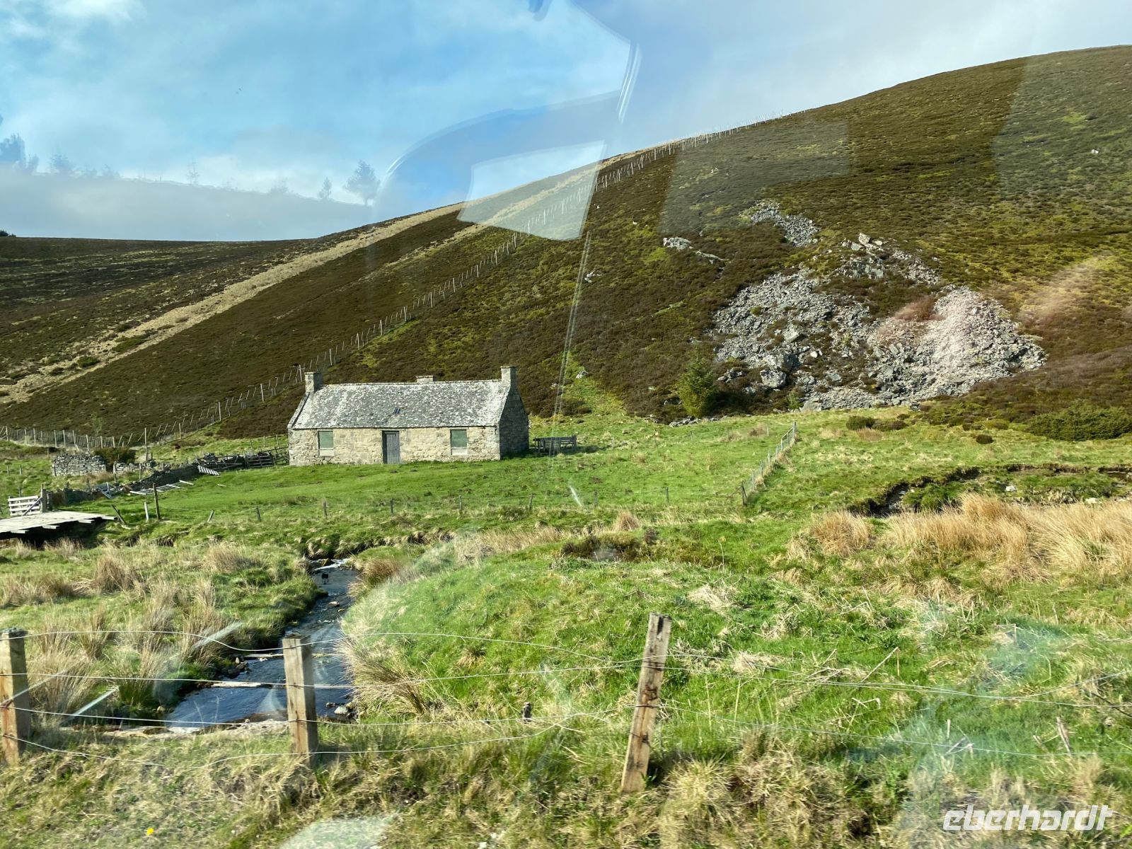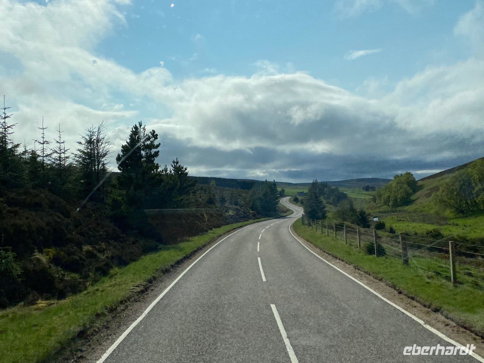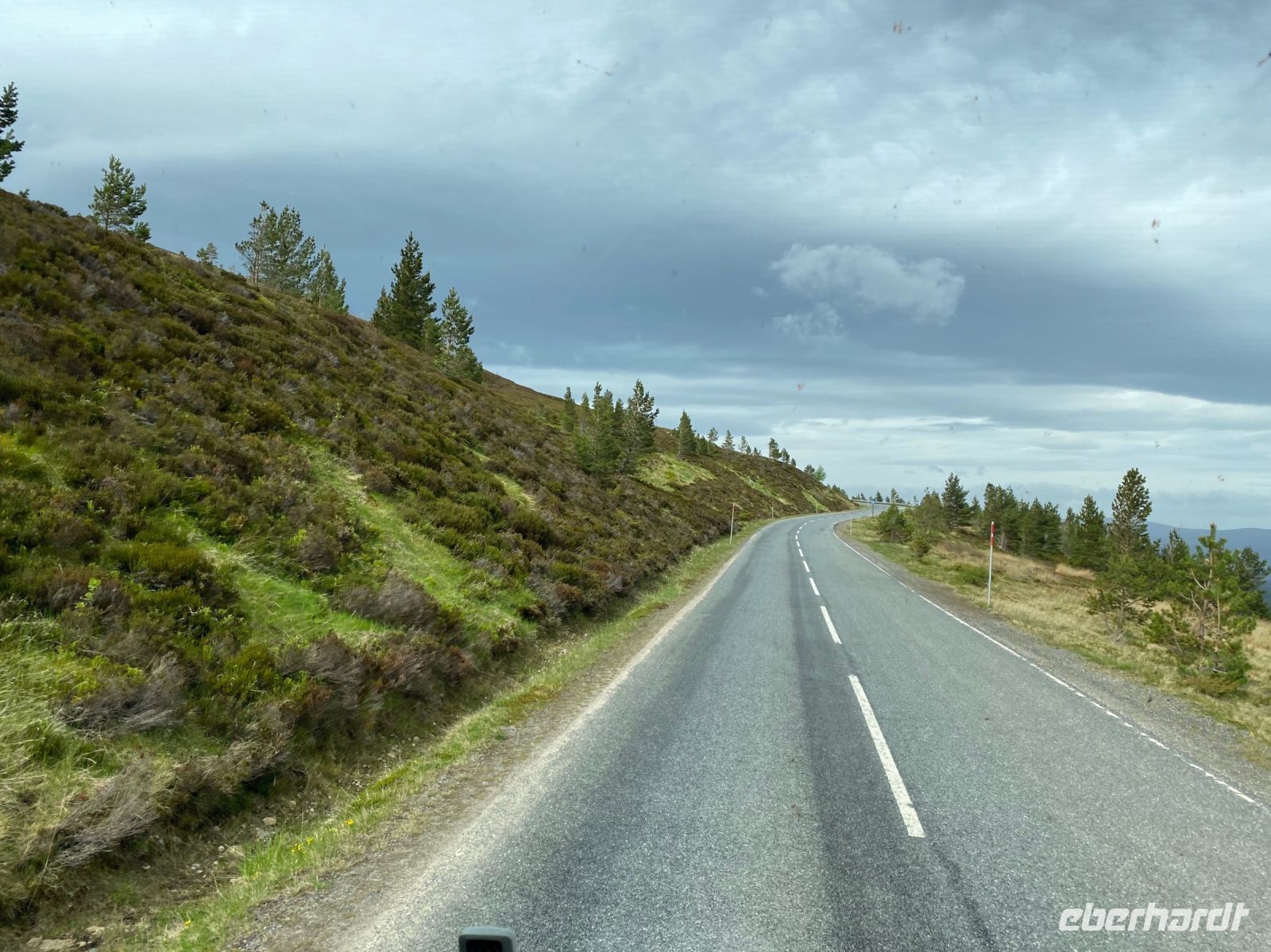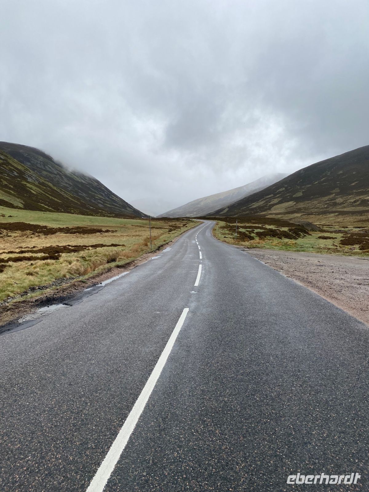 Dort erreichen wir auch bald den Cairngorms-Nationalpark, auf gälisch hat er übrigens den unaussprechlichen Namen: „Üghdarras Pàirc Nàiseanta a' Mhonaidh Ruaidh“. Vor allem aber ist es hier einfach schön. Einsam ist es auch, Hochnebel und dramatische Wolkenstimmungen lassen erahnen, dass das Leben hier auch sehr hart gewesen sein muss.