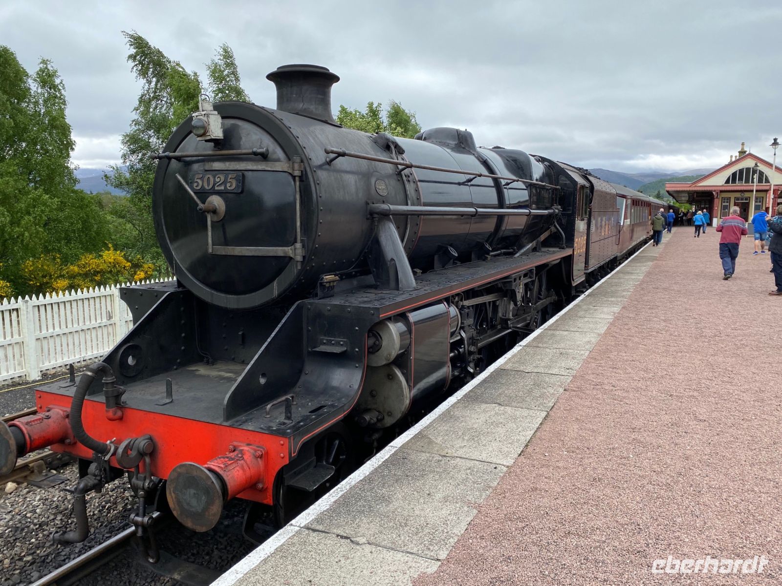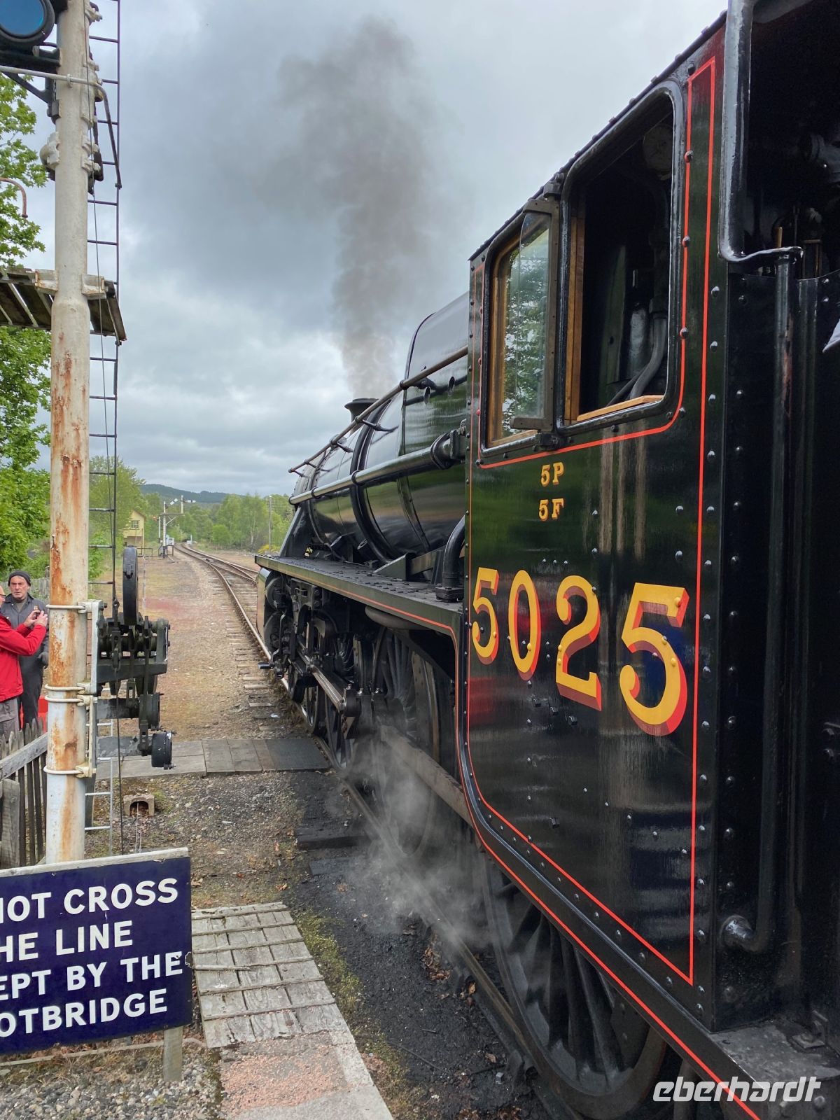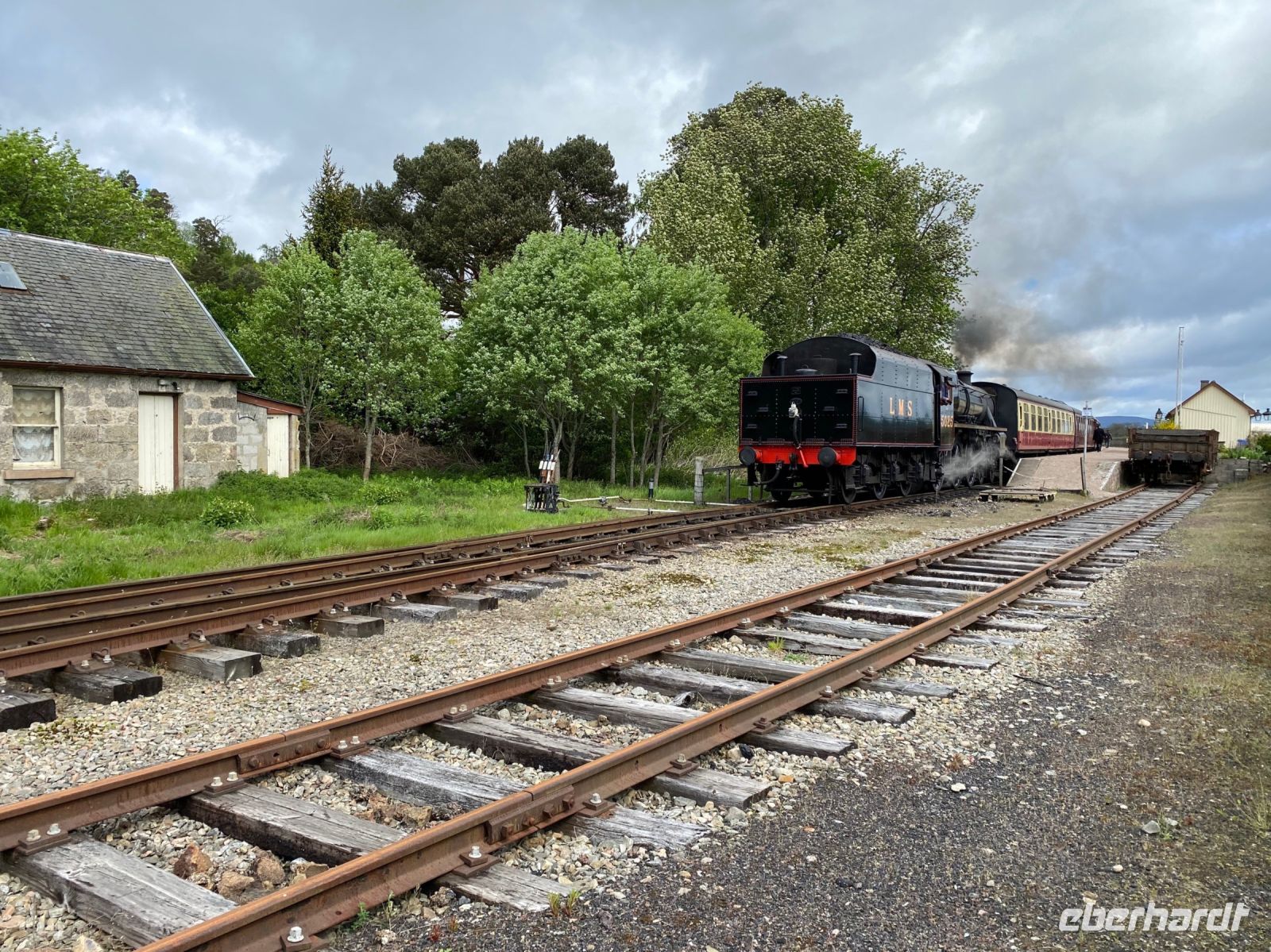 Heute wird uns Dampf gemacht! Wir verabschieden uns von Grantown-on-Spey und fahren mit unserem Bus nach Aviemore. Hier erwartet uns die Strathspey Railway, mit ihrem spektakulären Dampfzug. Die Lokomotive, eine „Black Five“ oder LMS 4-6-0 Class 5MT stammt aus dem Jahr 1934, die Museumsbahngesellschaft hat sie wunderbar instandgesetzt und fauchend und dampfend fährt sie unseren Zug nach Boat of Garten, was für ein Ortsname für deutsche Ohren! Für alle könnte die Strecke, übrigens auch in Normalspur, durchaus noch länger sein. Die Bahngesellschaft arbeitet auch hier an einer Verlängerung nach Grantown.