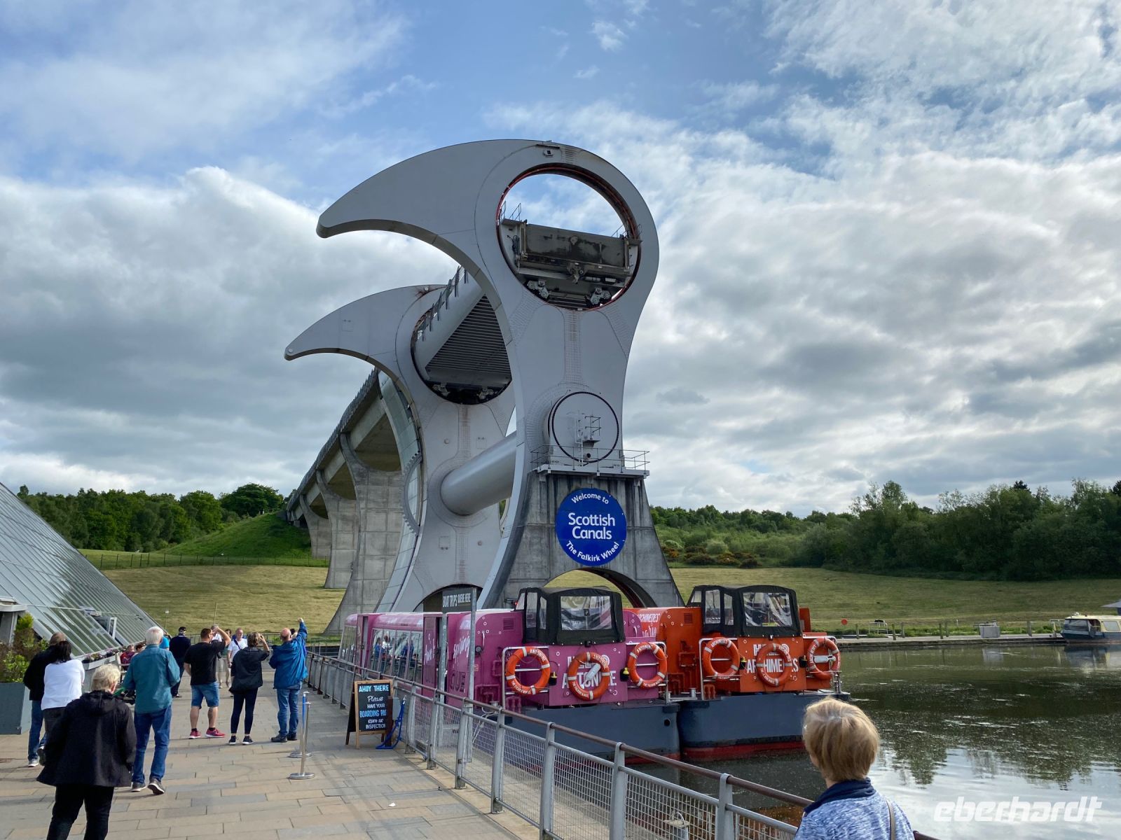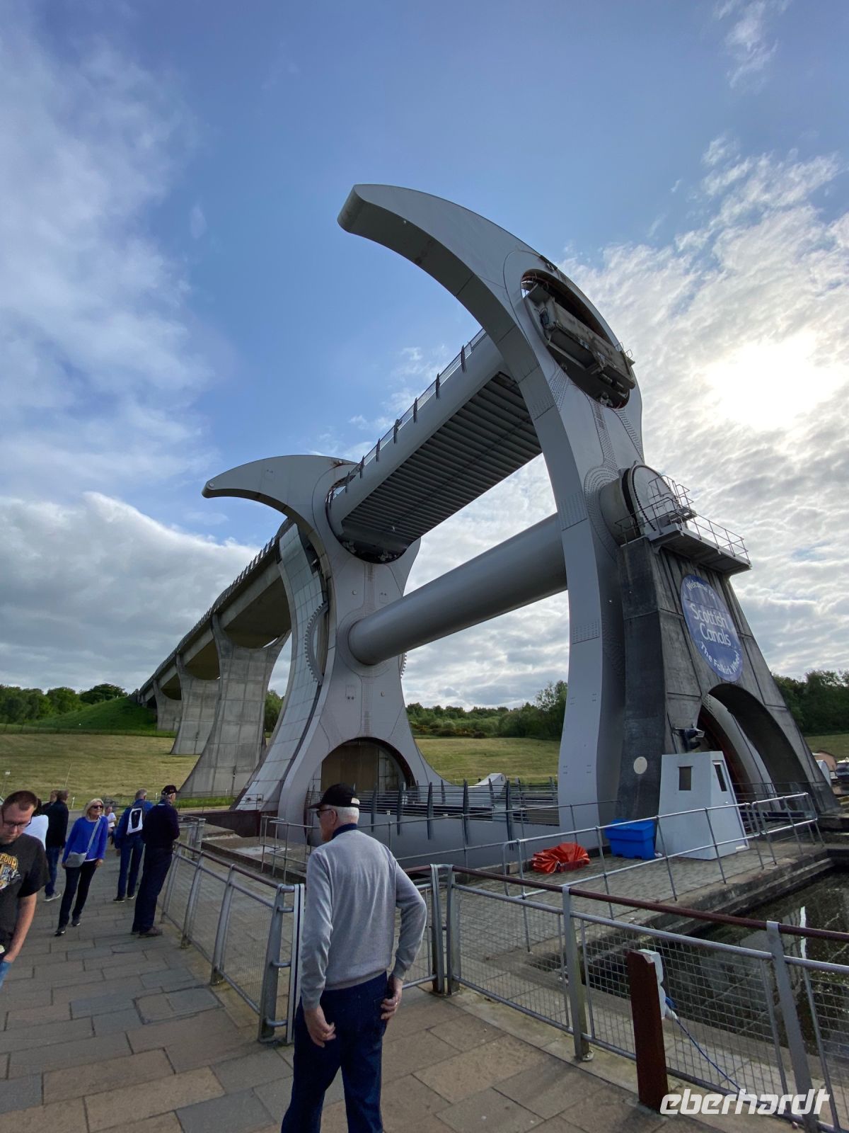 Auf unserer Fahrt nach Süden sehen wir in der Nähe von Falkirk die Kelpies, riesige Pferdeskulpturen, die erst vor zehn Jahren errichtet wurden. Schon 2002 wurde hier noch einmal Transportgeschichte geschrieben und neu erfunden. Wir besuchen wieder einen Schifffahrtskanal, genaugenommen zwei, die hier trotz eines Höhenunterschiedes von 24 m verbunden wurden. Ein gewaltiges Kranrad nutzt das archimedische Prinzip und kann mit einer halben Umdrehung 500 Tonnen bewegen. Dabei werden nur 1,5 kWh Energie verbraucht – wenn das Thomas Telford wüsste!
