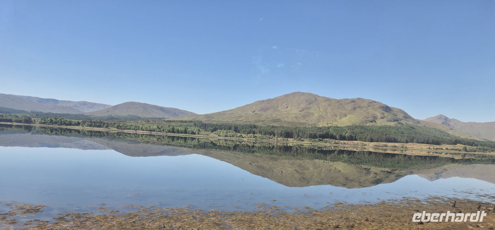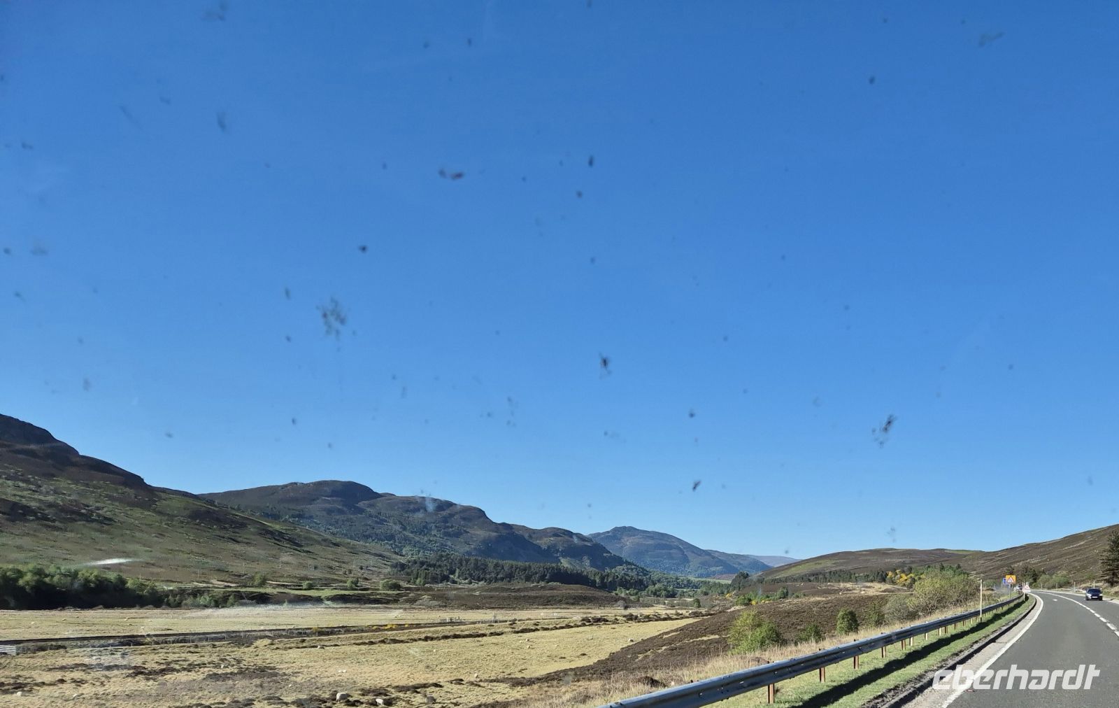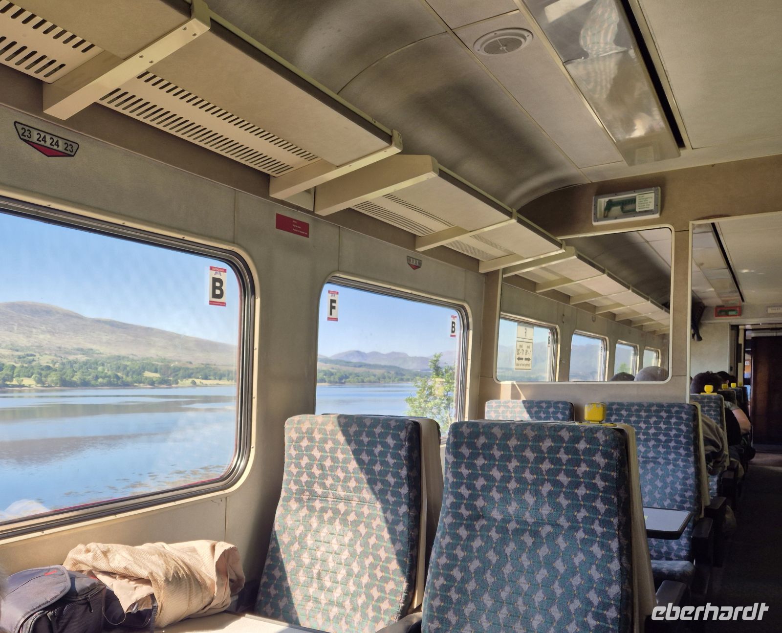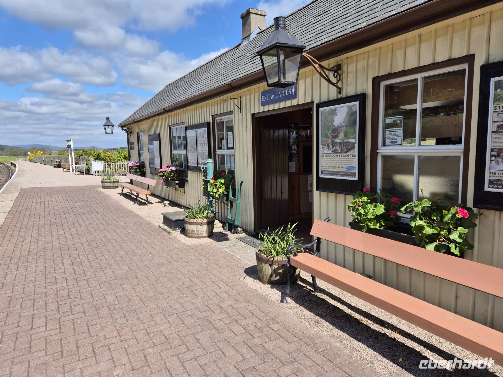 Die Mittagspause legen wir in landschaftlich schöner- aber heute am Sonntag besonders heftig frequentierter Umgebung am Loch Morlich ein mit der Möglichkeit der Teilnahme an der Bordverpflegung und der Chance für einen erholsamen Spaziergang zum See…Den Abschluss des Tages bildet erneut eine Zugfahrt mit der Strathspey Railway Gesellschaft von der Station Broomhill nach Aviemore mit Zwischenstop in Boat of Garden. Auch hier galt das Problem des Funkenflugs wegen der anhaltenden Trockenheit in Schottland- dieses Mal in einem etwas komfortableren Zug durchqueren wir wieder die offene Flußlandschaft des Spey mit den Bergen des Highlands im Hintergrund.